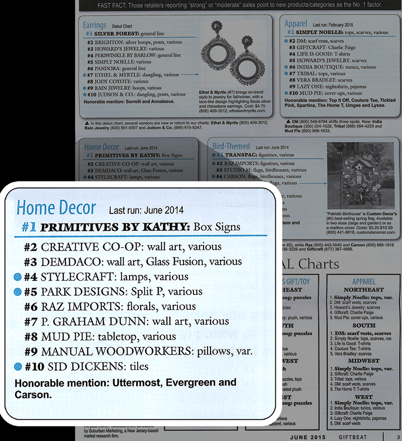 The retailers have voted Primitives by Kathy into this coveted position, as well as top 5 for wall décor in the June issue.