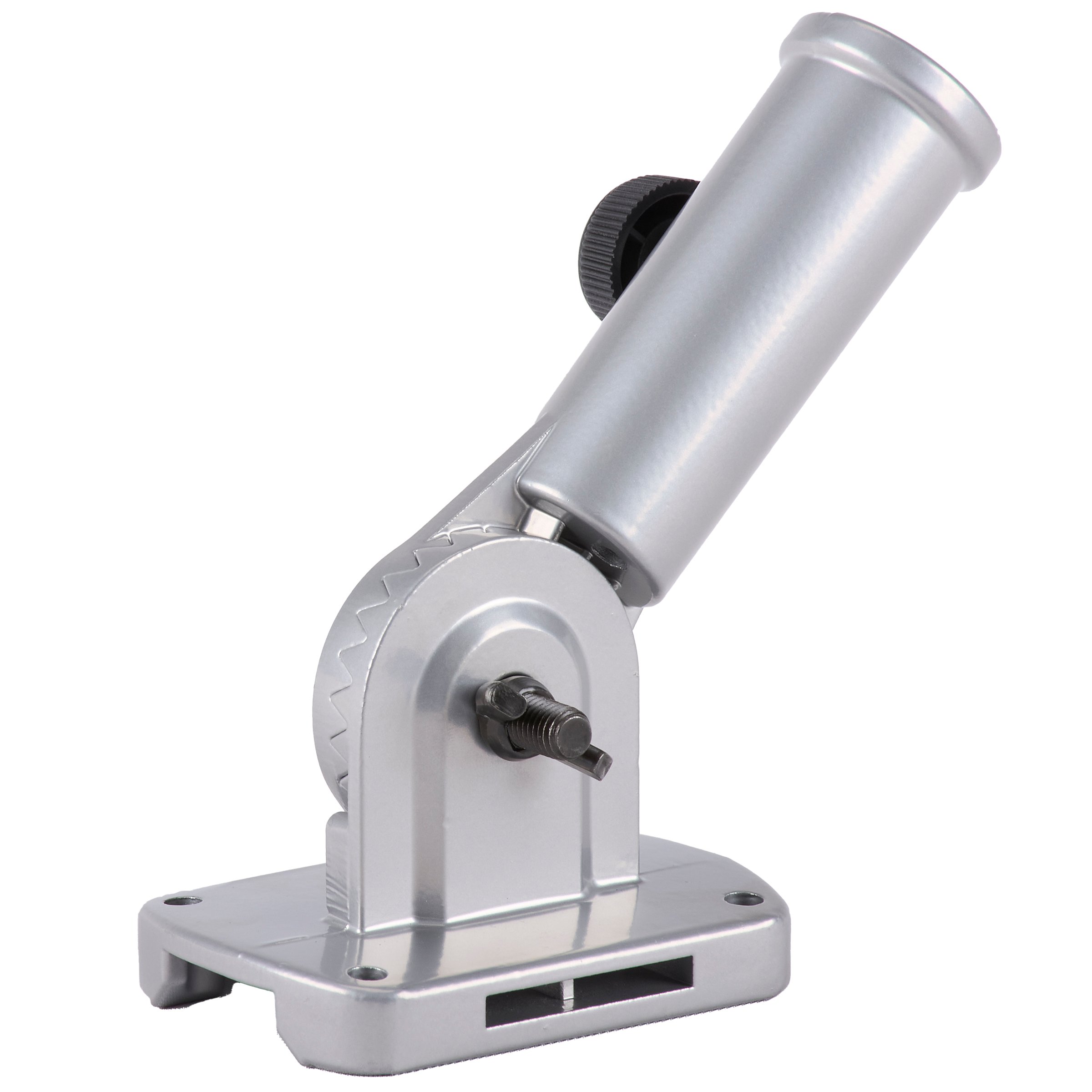 A metal flag pole bracket displaying a subtle matte silver design that easily coordinates with both seasonal and everyday house flags from our Primitives by Kathy House Flag Collection. This adjustable flag pole bracket features sturdy serrated locking plates with an easy to use wing nut tightener offering over 10 positioning options and a tightening knob to secure a flag pole in the mount. The flag pole mount fits flag poles up to 1 inch thick and 5 feet in length and also features a drainage hole to avoid filling with water when used outdoors. Our adjustable flag pole bracket offers multiple mounting options including hardware to attach to flat surface using the predrilled holes as well as slots on the sides for wrapping to a pillar or other cylindrical surfaces. Pair any of our ready-to-display house flags and our house flag pole with this easy to-use home décor accessory perfect for year-round outdoor displays.
