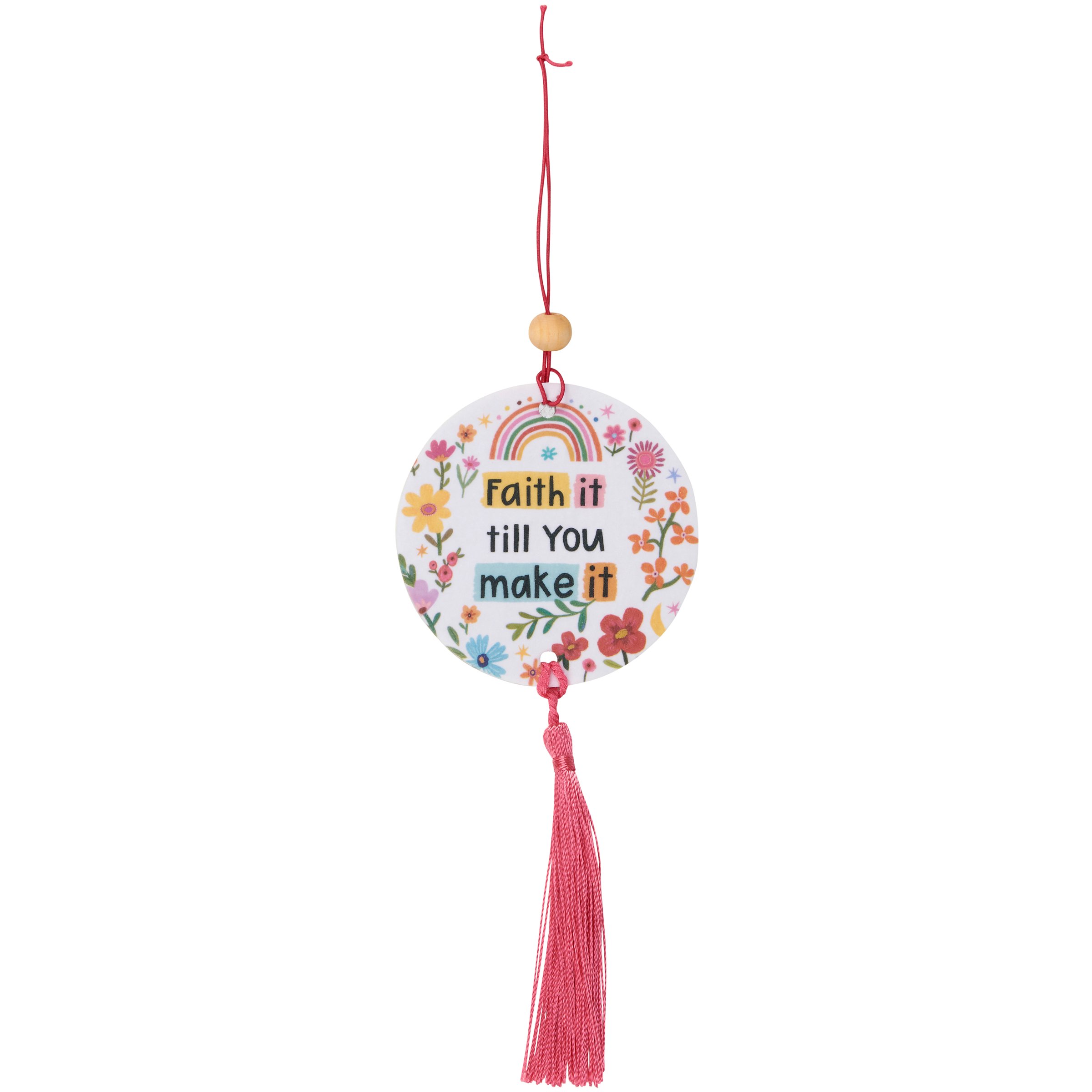 A set of two double-sided air fresheners from our Inspiration & Blooms Collection displaying vibrant rainbow and flower designs surrounding a motivational sentiment that reads "Faith It Till You Make It." Each air freshener features decorative accents including a coordinating pink hanging tassel and wooden bead on string hanger. Our Faith It air fresheners are perfect to hang in car, office, or any space to release a calming lavender aroma. Air freshener scent lasts approximately 2 years while sealed and 30 days after opened. Car air freshener set is packaged in a poly bag and attached to a header card for easy rack display. An inspirational everyday accessory perfect for gifting.