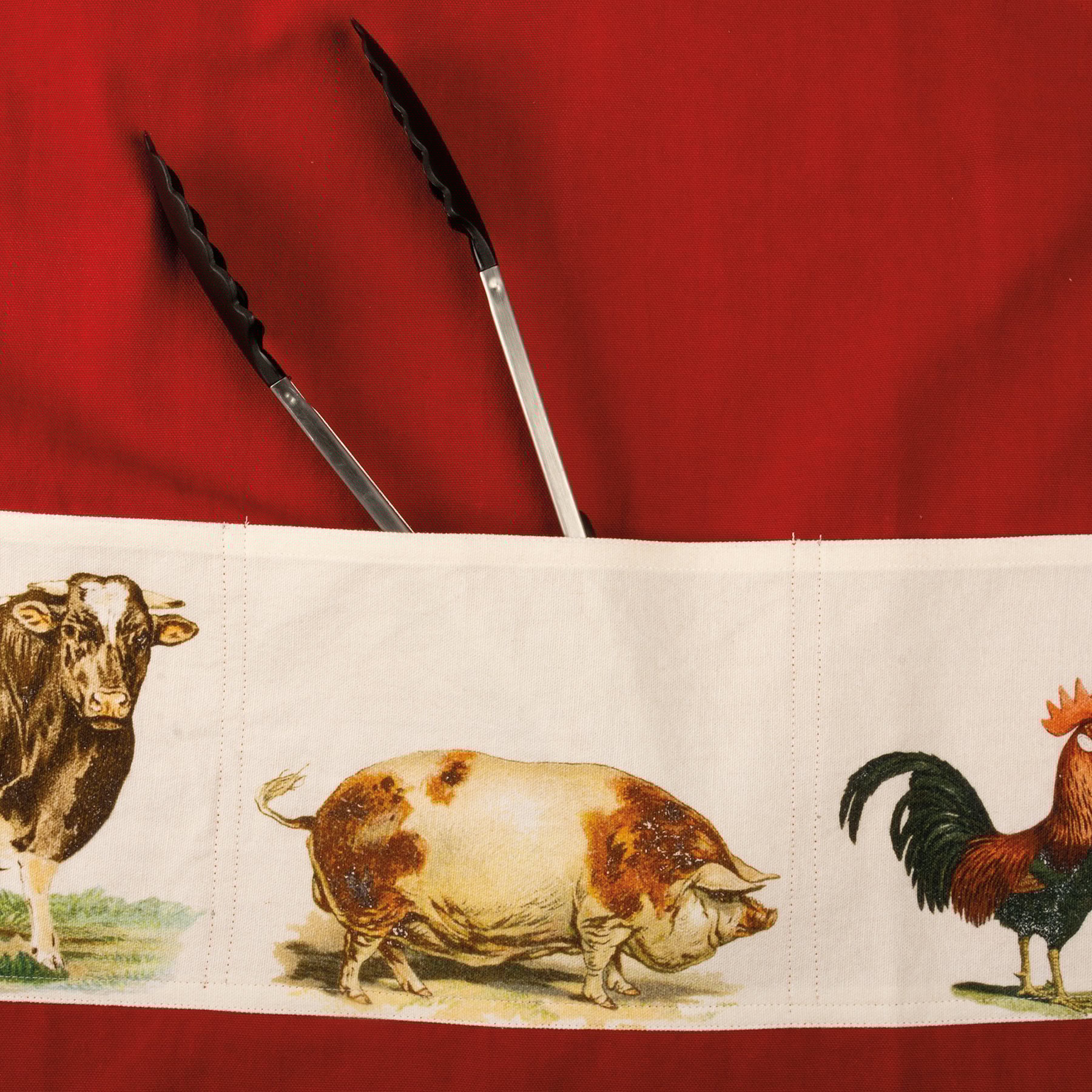 A cotton apron from our Farmhouse Collection featuring an embroidered "A Cow, A Pig And A Chicken Walk Into A BBQ . . . The End" sentiment and three front pockets featuring vintage-style farm animal designs. Includes adjustable neck and waist straps. Our Walk Into A BBQ apron is machine-washable.