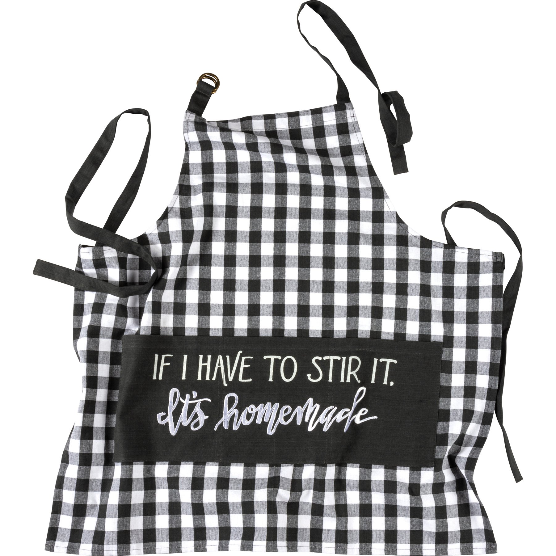 A black and white checkered apron featuring a center pocket with hand lettered "If I Have To Stir It, It's Homemade" sentiment. Features polyester and cotton material and adjustable straps. Machine-washable.