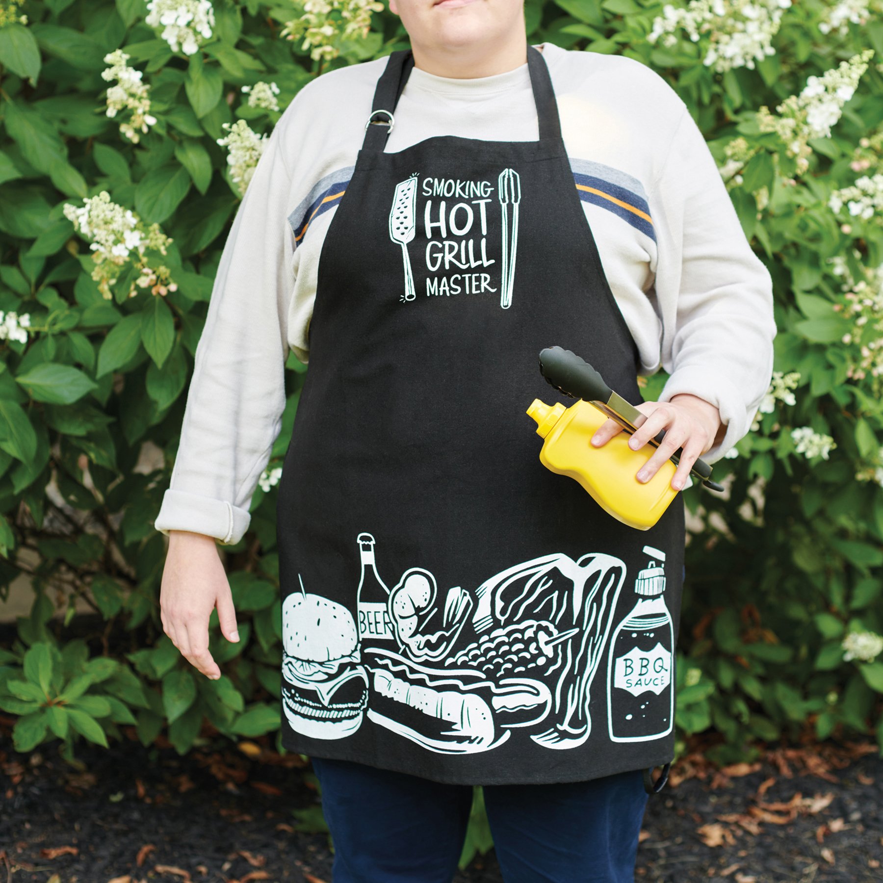 A black cotton apron from our Grilling & Chilling Collection displaying white hand illustrated food designs and "Smoking Hot Grill Master" sentiment. Apron includes adjustable neck strap and waist ties to create the perfect fit. A fun gift that will bring laughter to the lawn during the next cookout. Our Smoking Hot Grill Master apron is machine-washable for convenient cleaning.