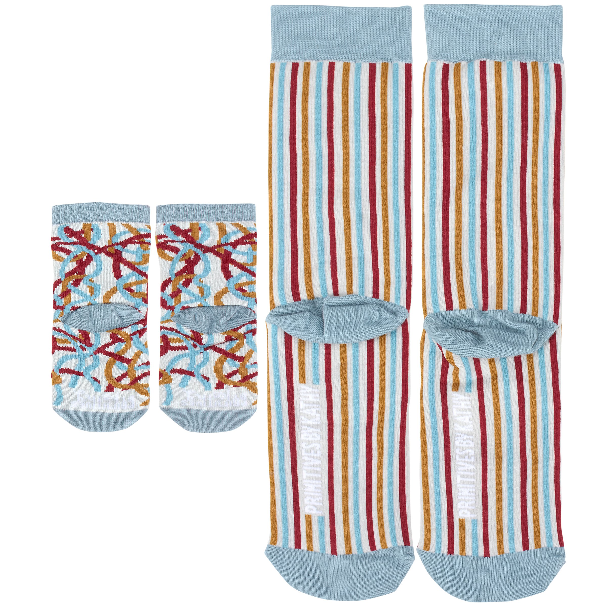A cute baby & me gift set from our LOL-Made You Smile Collection featuring colorful pairs of matching socks that include one adult pair and one baby pair to create fun family moments. Each pair displays playful hand illustrated stripe and scribble designs with funny parent inspired sentiments that read "Chaos Coordinator" on the adult socks and "I Am The Chaos" on the baby socks. This giftable sock set is made with a cotton, nylon, and spandex blend for a one size fits most design for the adult pair and baby socks that fit 0-12 months. Our Chaos baby & me sock set comes packaged together with a decorative header card making it great for gifting as well as a clear plastic hanger for easy rack display. A fun baby & me matching sock set perfect to give as a funny family gift for baby showers or everyday moments.