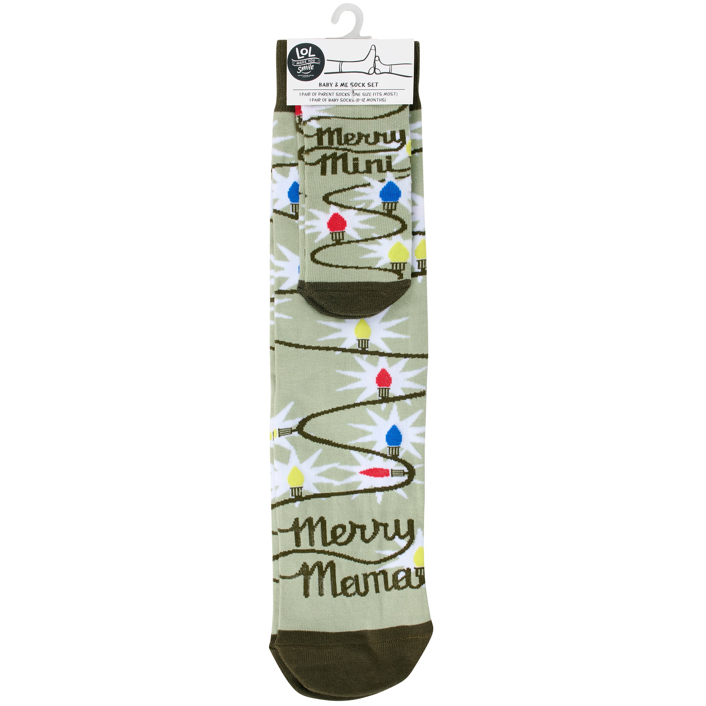 A cute baby & me gift set from our Christmas Collection featuring colorful pairs of matching socks that include one adult pair and one baby pair to create fun seasonal moments. Each pair displays playful hand illustrated Christmas tree light designs with fun seasonal sentiments that read "Merry Mama" on the adult socks and "Merry Mini" on the baby socks. This seasonal sock set is made with a cotton, nylon, and spandex blend for a one size fits most design for the adult pair and baby socks that fit 0-12 months. Our Merry Mama baby & me sock set comes packaged together with a decorative header card making it great for gifting as well as a clear plastic hanger for easy rack display. A fun baby & me matching sock set perfect for a family Christmas gift.