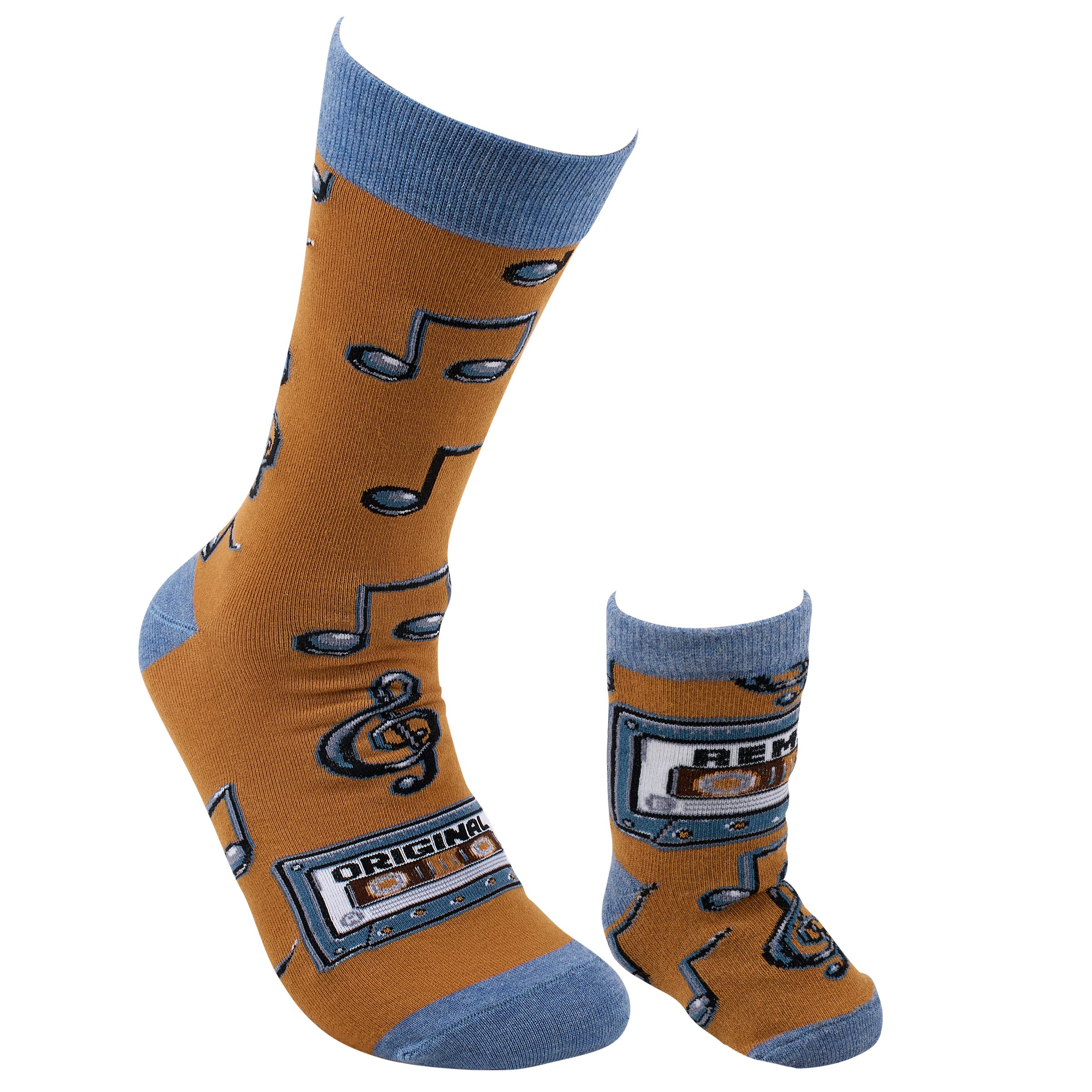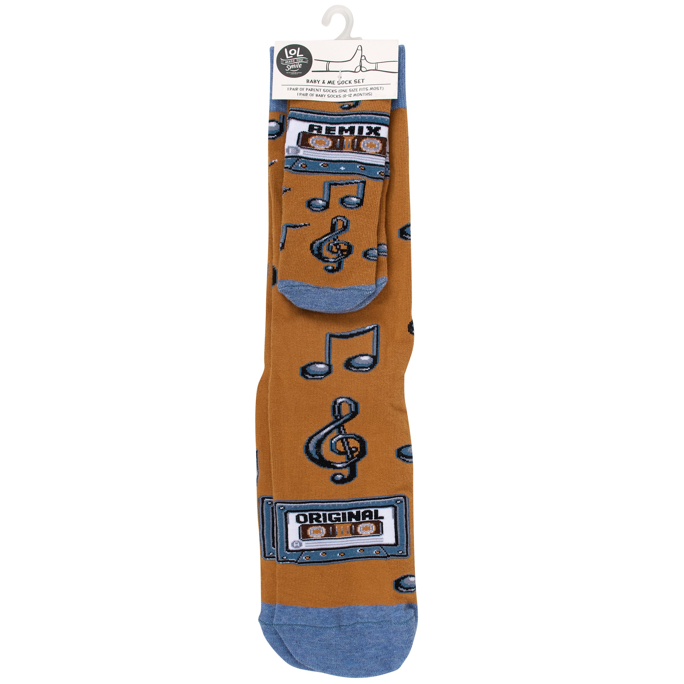 A fun baby & me gift set from our LOL-Made You Smile Collection featuring colorful pairs of matching socks that include one adult pair and one baby pair to create fun family moments. Each pair displays playful hand illustrated music notes with fun music inspired sentiments on cassette tape designs that read "Original" on the adult socks and "Remix" on the baby socks. This giftable sock set is made with a cotton, nylon, and spandex blend for a one size fits most design for the adult pair and baby socks that fit 0-12 months. Our Original/Remix baby & me sock set comes packaged together with a decorative header card making it great for gifting as well as a clear plastic hanger for easy rack display. A fun baby & me matching sock set perfect to give as a music-themed gift for baby showers or everyday moments.