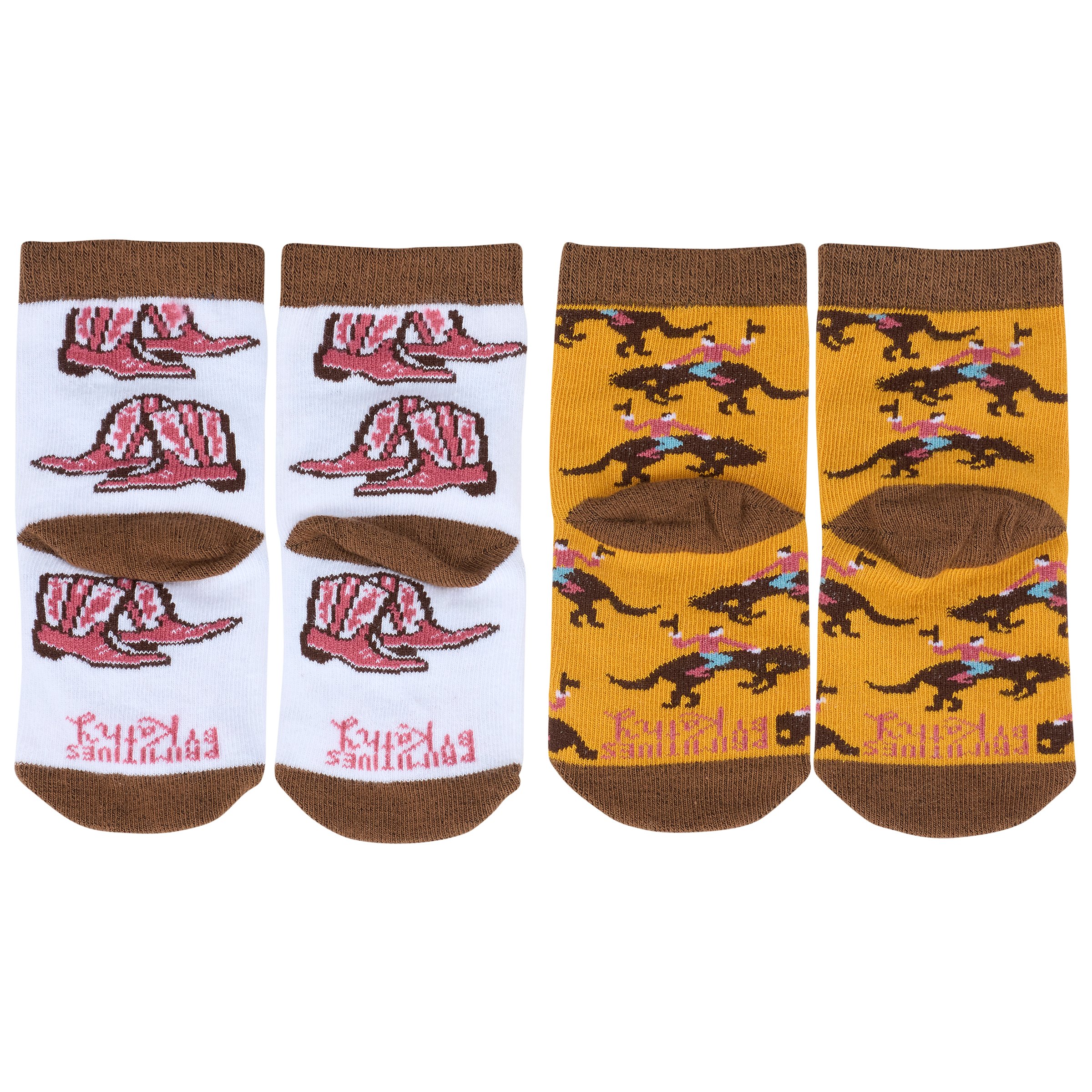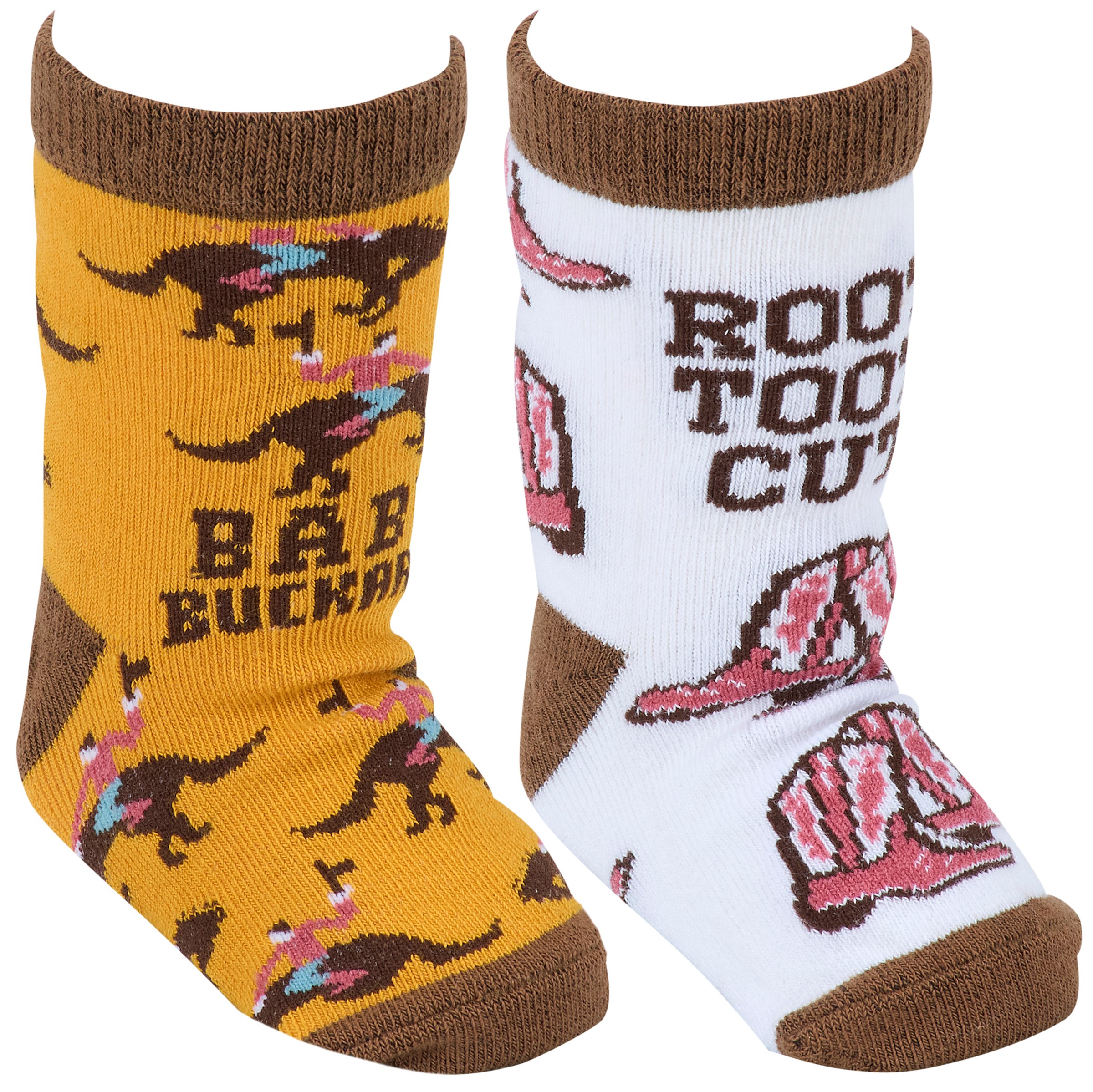 Two pairs of cozy baby socks in a giftable set from our Baby & Kids Collection displaying fun western inspired designs on each pair. Baby socks feature cowboy boot designs with "Rootin' Tootin' Cutie" sentiment on the front as well as a pattern of cowboys riding horses with "Baby Buckaroo" sentiment. Both baby sock designs are replicated from original hand illustrated art. Socks are sized to fit a 0-12 month baby and made with a cotton, nylon, and spandex blend for a snug fit. Our Baby Buckaroo baby sock set comes packaged together on a decorative header card making it great for gifting with a clear plastic hanger displaying both sock designs for easy rack display. A fun western-themed gift for baby showers or everyday moments.