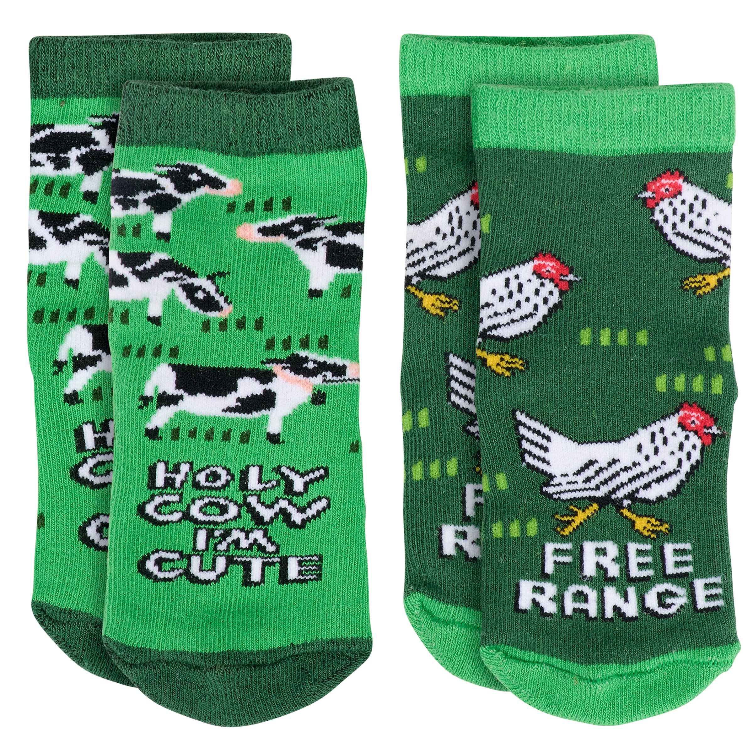 Two pairs of cozy baby socks in a giftable set from our Baby & Kids Collection displaying fun farm inspired designs on each pair. Baby sock designs feature grazing cows in a field with "Holy Cow I'm Cute" sentiment as well as running chickens with "Free Range" sentiment. Both baby sock designs are replicated from original hand illustrated art. Socks are sized to fit a 0-12 month baby and made with a cotton, nylon, and spandex blend for a snug fit. Our Free Range baby sock set comes with a header card and a clear plastic hanger displaying both sock designs for easy rack display. A fun farm-themed gift for baby showers or everyday moments.