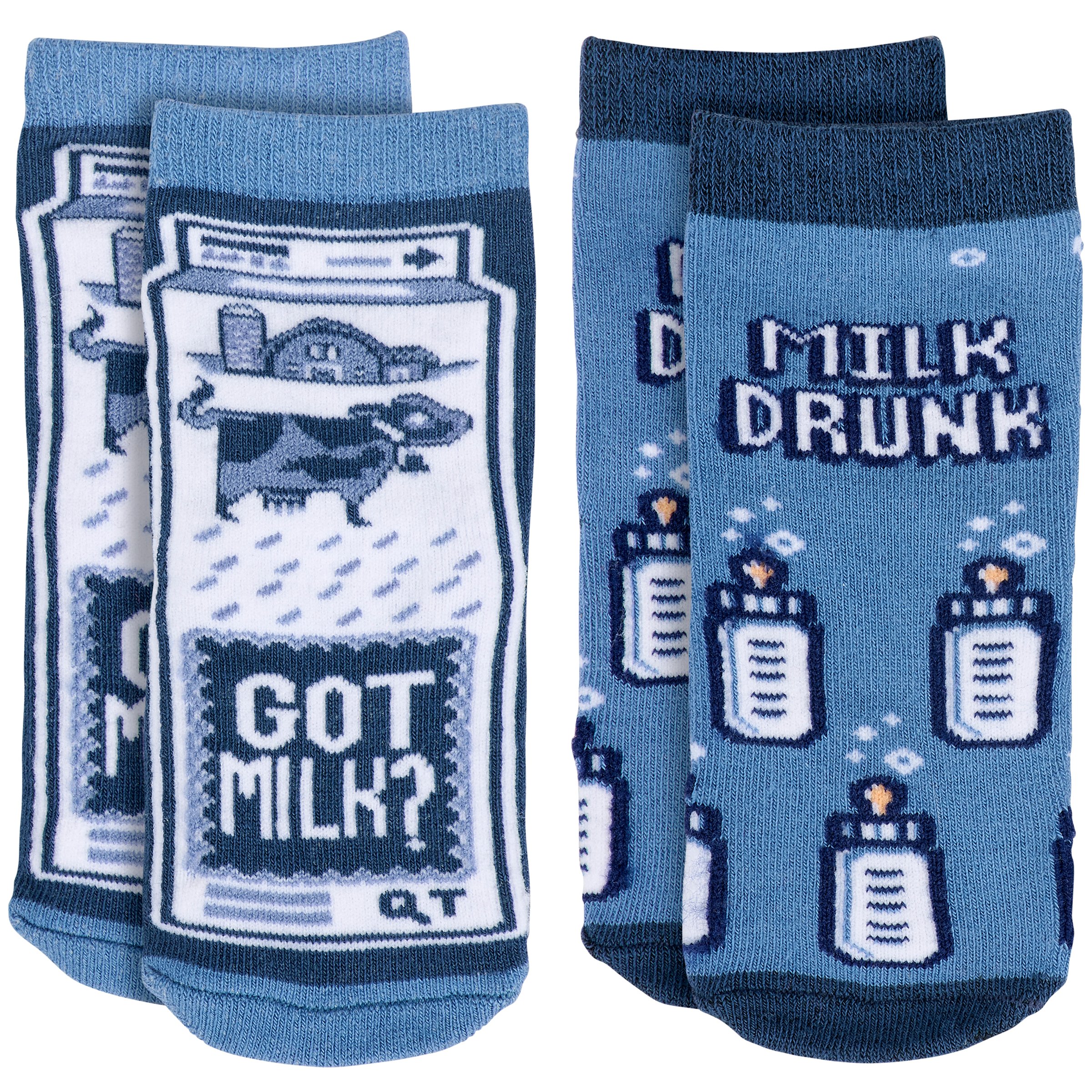 Two pairs of cozy baby socks in a giftable set from our Baby & Kids Collection displaying funny milk-themed designs on each pair. Baby socks feature a fun milk carton design with "Got Milk?" sentiment as well as a pattern of baby bottles with fun sentiment that reads "Milk Drunk." Both baby sock designs are replicated from original hand illustrated art. Socks are sized to fit a 0-12 month baby and made with a cotton, nylon, and spandex blend for a snug fit. Our Got Milk baby sock set comes with a header card and a clear plastic hanger displaying both sock designs for easy rack display. A fun gift for baby showers or everyday moments.