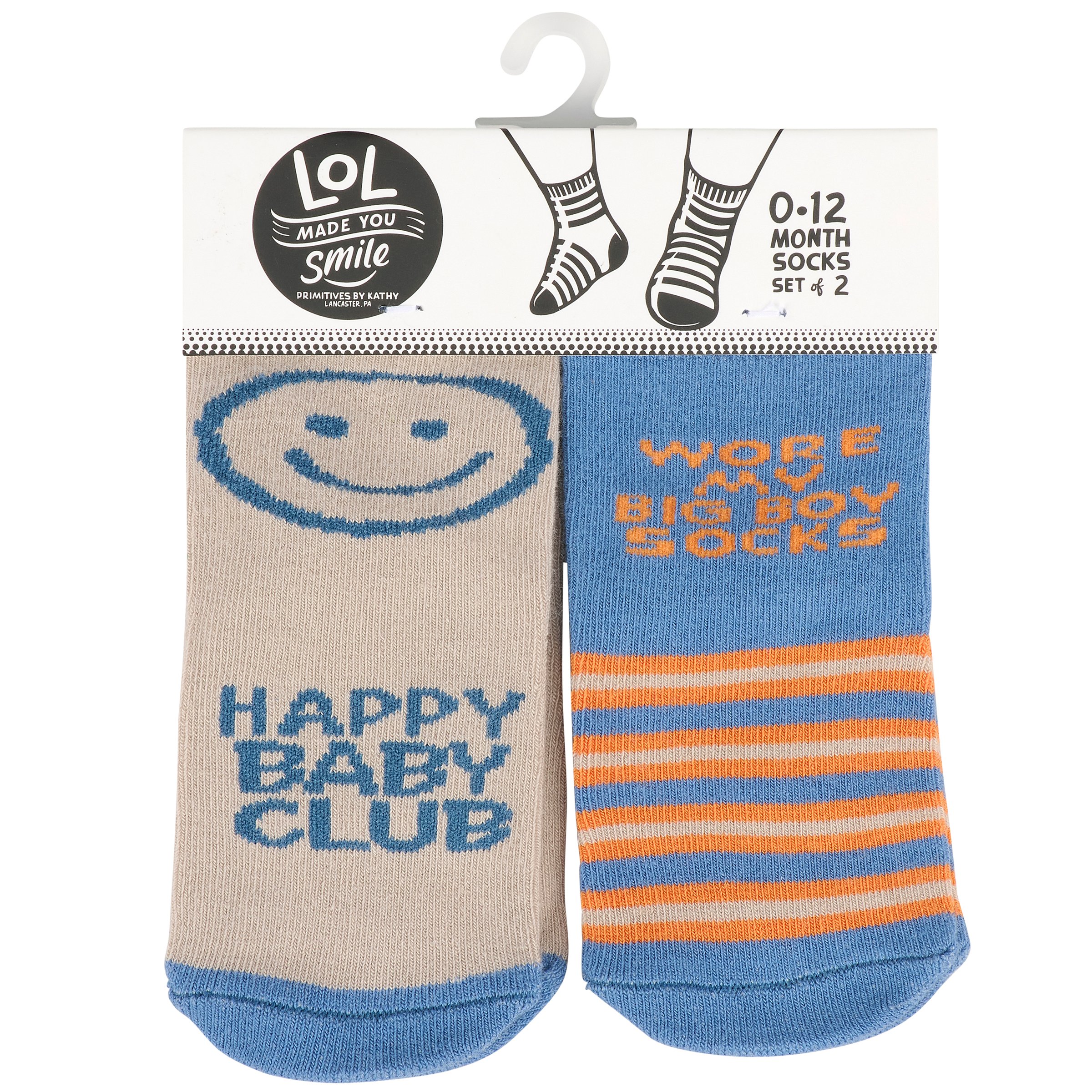 Two pairs of cozy baby socks in a giftable set from our Baby & Kids Collection displaying fun baby inspired designs on each pair. Baby sock designs feature a smiley face with "Happy Baby Club" sentiment as well as a stripe pattern with a fun sentiment that reads "Wore My Big Boy Socks." Socks are sized to fit a 0-12 month baby and made with a cotton, nylon, and spandex blend for a snug fit. Our Happy Baby Club baby sock set comes with a header card and a clear plastic hanger displaying both sock designs for easy rack display. A fun gift for baby showers or everyday moments.