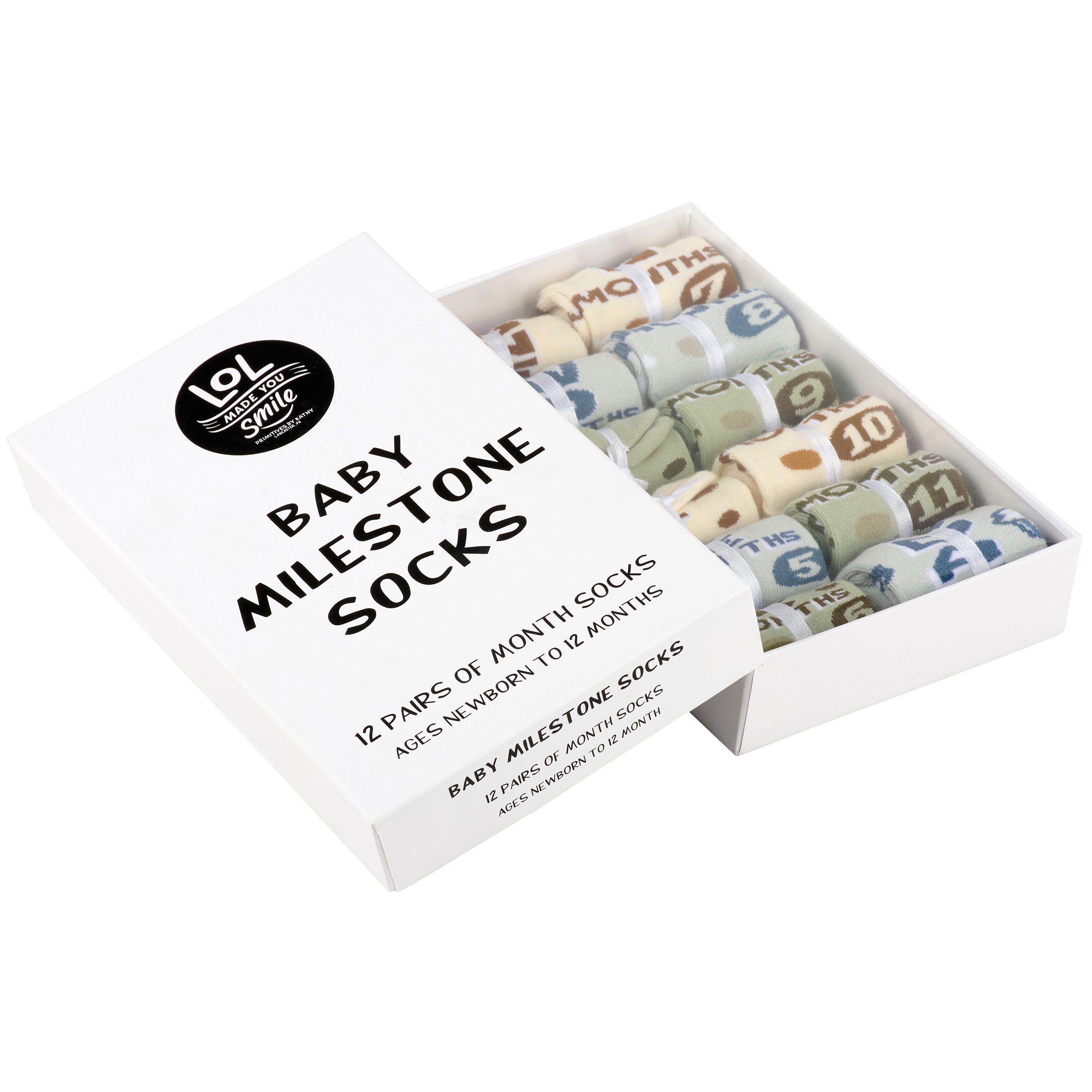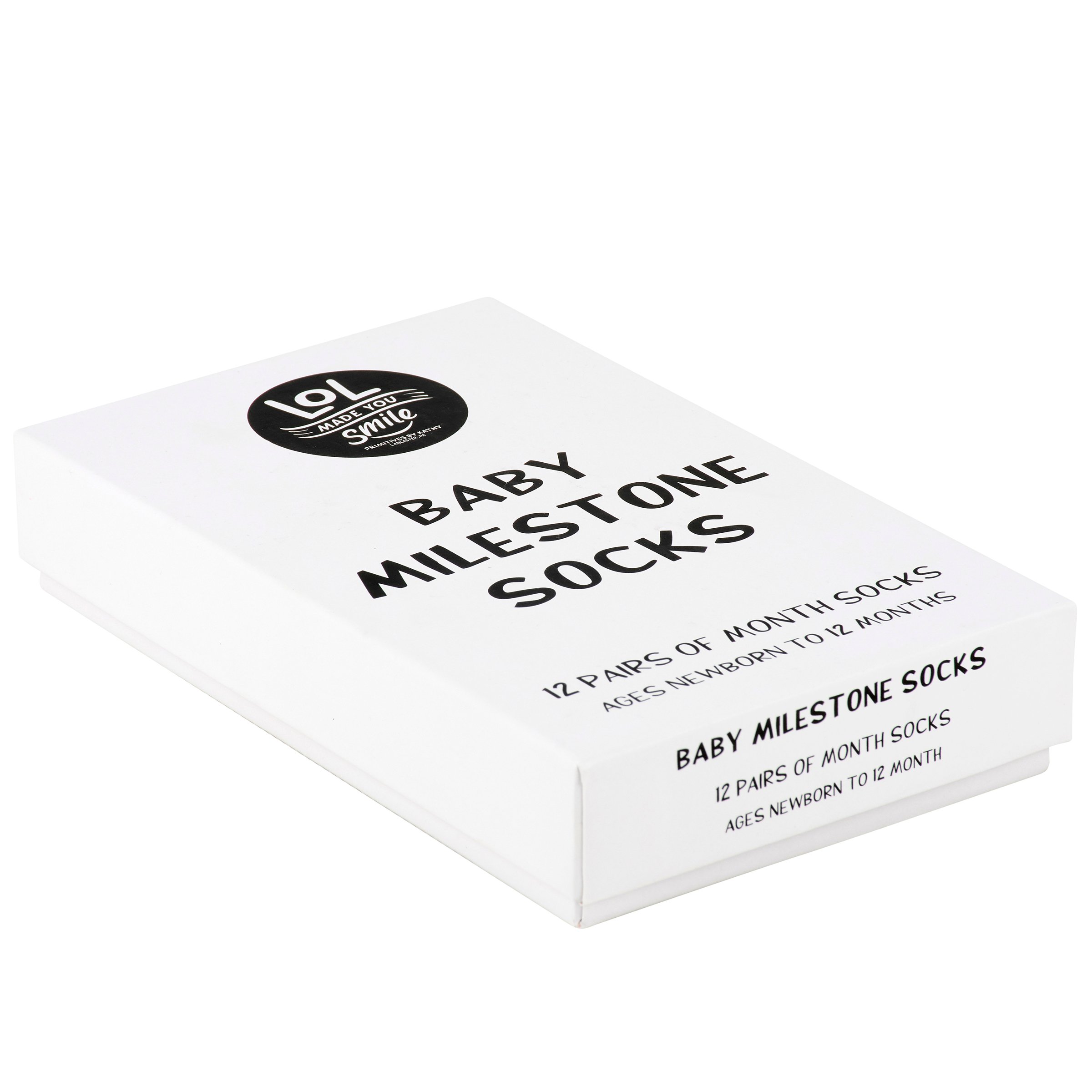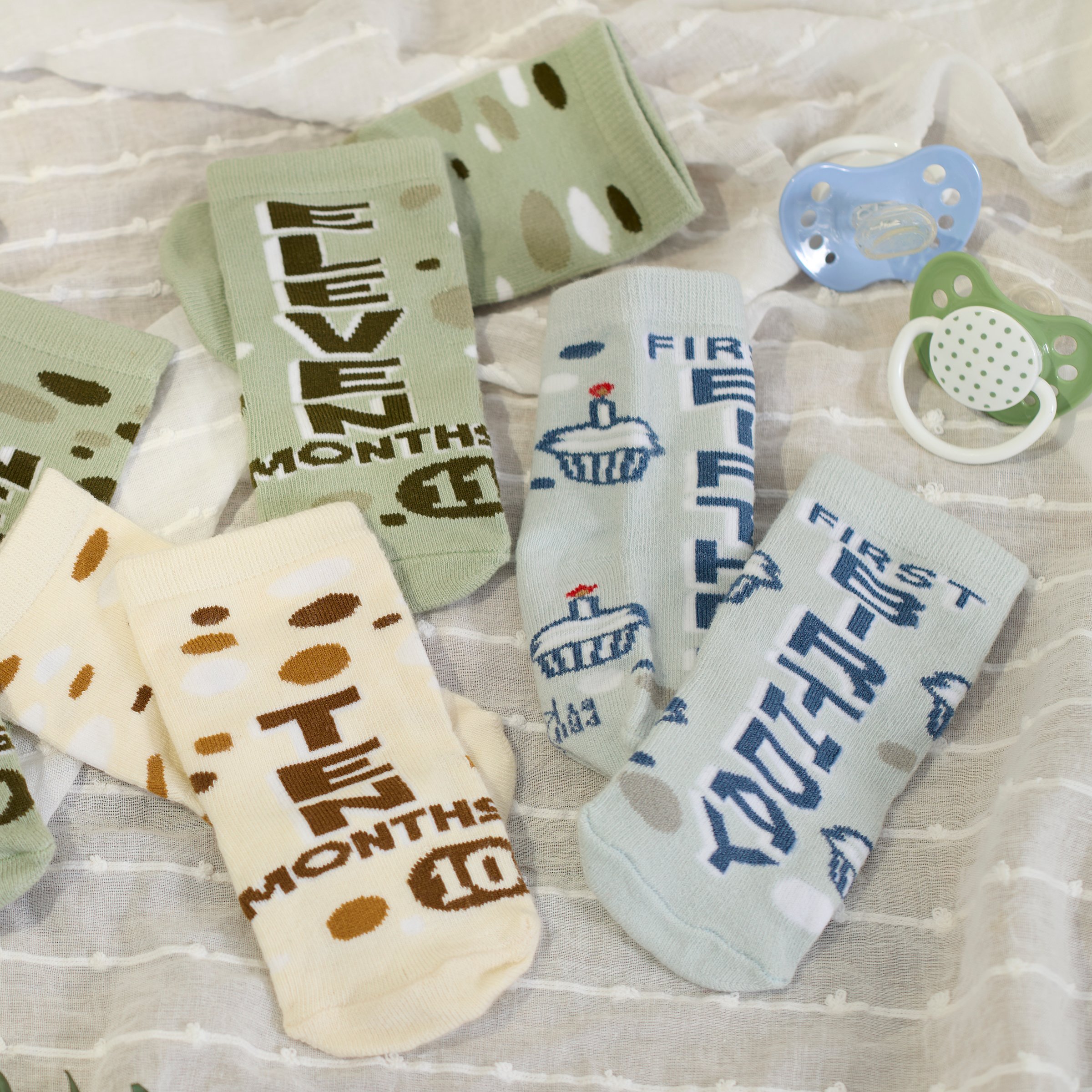 12 pairs of cozy baby socks in a giftable set from our Baby & Kids Collection displaying fun sock designs celebrating each month leading up to the first birthday! Baby sock feature confetti inspired patterns and sentiments corresponding to each month as well as a pair displaying a "First Birthday" sentiment and cupcakes with a candle. Socks are sized to fit newborns to 12 months based on the sock design and made with a cotton, nylon, and spandex blend for a snug fit. Our Milestone baby sock set is packaged in a sturdy box with each pair neatly rolled and finished with ribbon making it perfect for gifting and storing after use as a keepsake. A fun gift for baby showers or everyday moments.