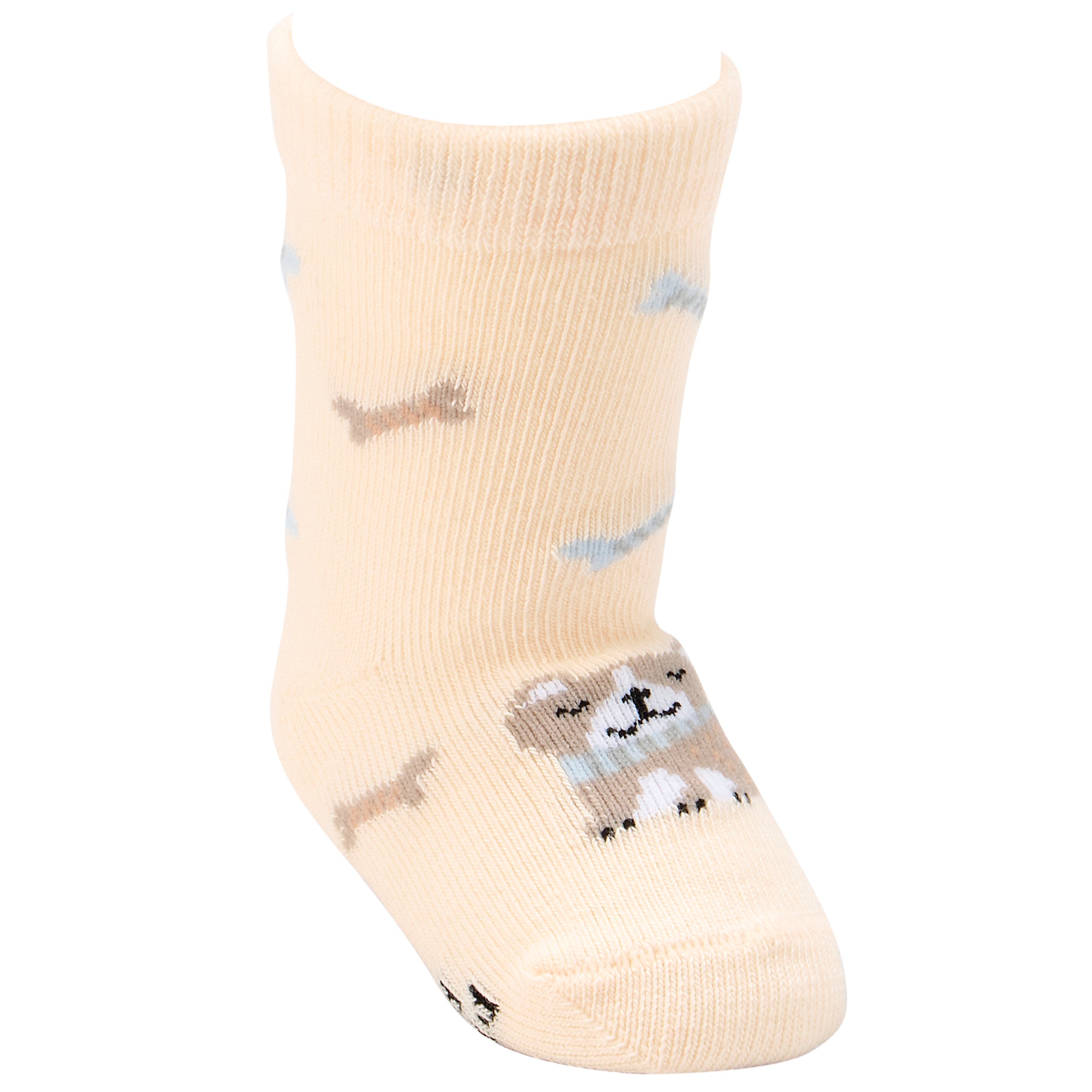 Three pairs of cozy baby socks in a giftable set from our Baby & Kids Collection displaying charming pet inspired designs on each pair. Baby sock designs include a dog with dog bones, a cat with cat toys, and an all-over checkered pattern replicated from original block print style art. Socks are sized to fit a 6-12 month baby and made with cotton, nylon, and spandex for a snug fit. Our Pets baby sock set comes with a header card and a clear plastic hanger displaying all three sock designs. A cute pet-themed gift for baby showers or everyday moments.