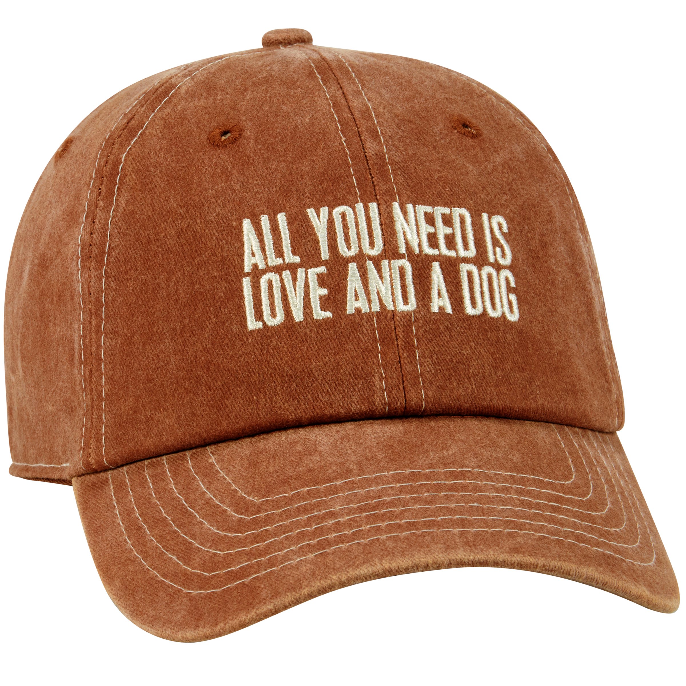 A cotton baseball cap featuring an embroidered "All You Need Is Love And A Dog" sentiment, burnt orange base, and adjustable brass closure on the back. Our All You Need Is Love And A Dog hat is one size fits most. Hand-wash only.