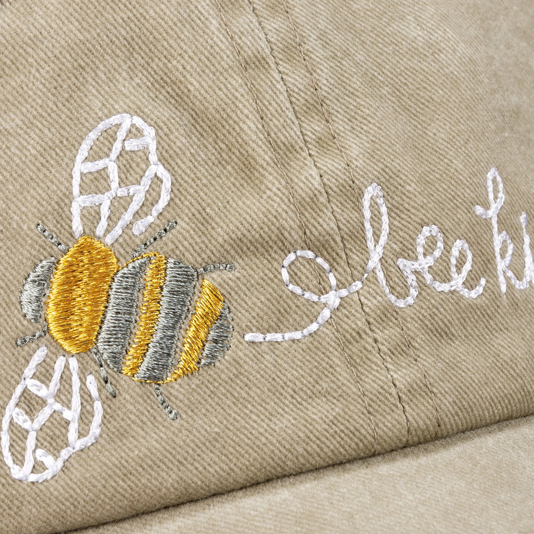 A cotton baseball cap featuring an embroidered "Bee Kind" sentiment with stitched bee design, green base, and adjustable brass closure on the back. Our Bee Kind hat is one size fits most. Hand-wash only.
