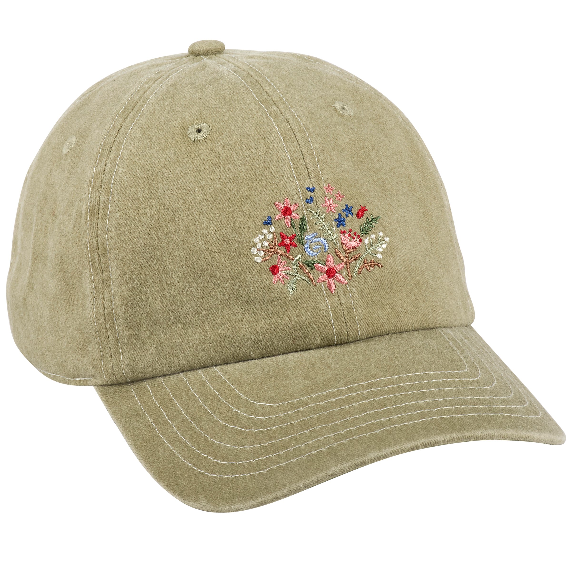 A stonewashed tan baseball cap from our Cottagecore Collection displaying embroidered designs of various blossoms on the front with a coordinating flower designs on the back. Embroidered blossom designs are replicated from original hand illustrated art. Our Blossoms baseball cap is one size fits most with an adjustable metal buckle to create the perfect fit. Hand wash only. A charming nature themed accessory perfect for everyday style and great for gifting.
