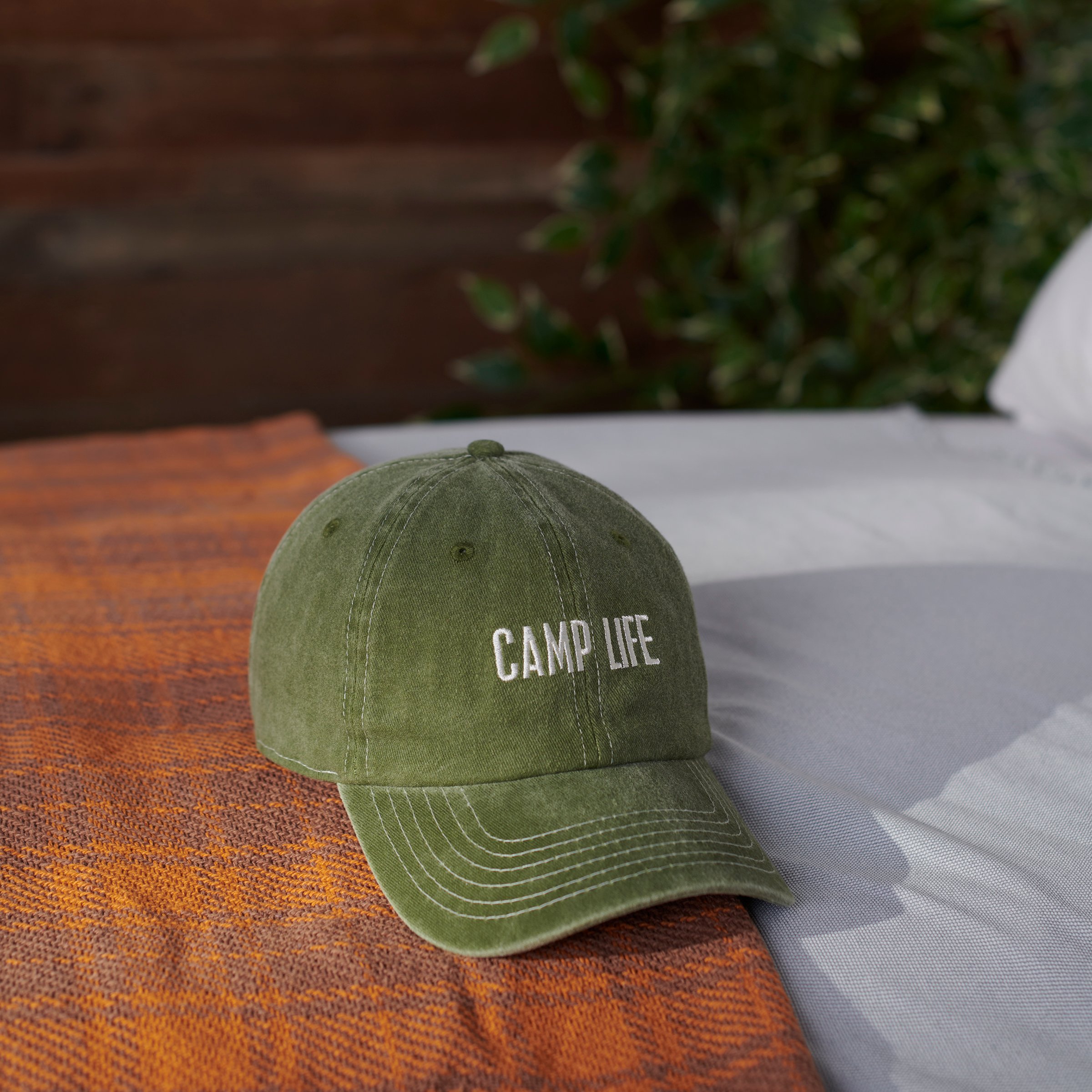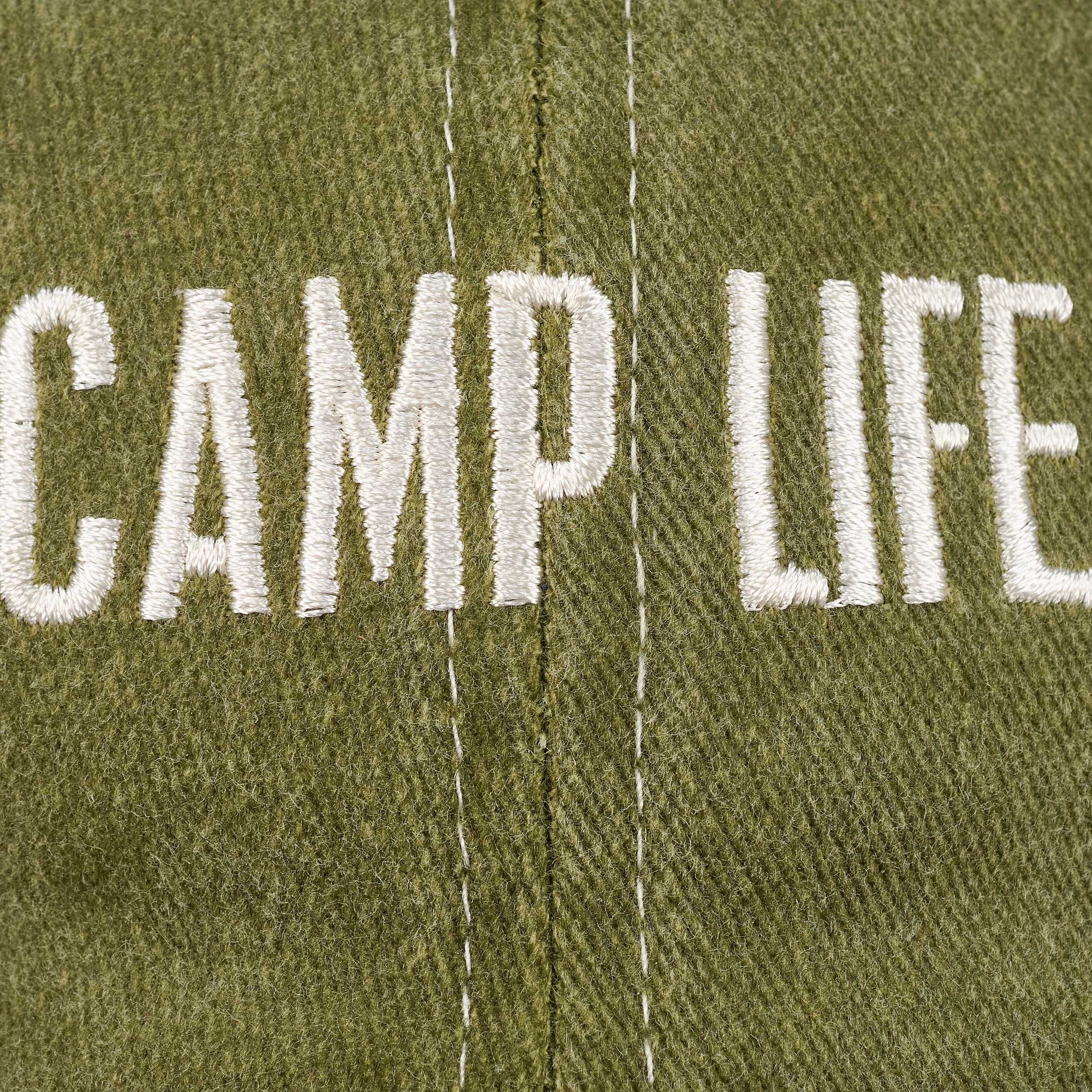 A stonewashed green baseball cap from our Lake & Cabin Collection displaying a fun camping inspired sentiment in a box sign style that reads "Camp Life" with cream thread accents. Camping hat features fully embroidered sentiment for added detail. Our Camp Life baseball cap is one size fits most with an adjustable metal buckle to create the perfect fit. Hand wash only. A fun camping-themed gift perfect for a outdoor activities.