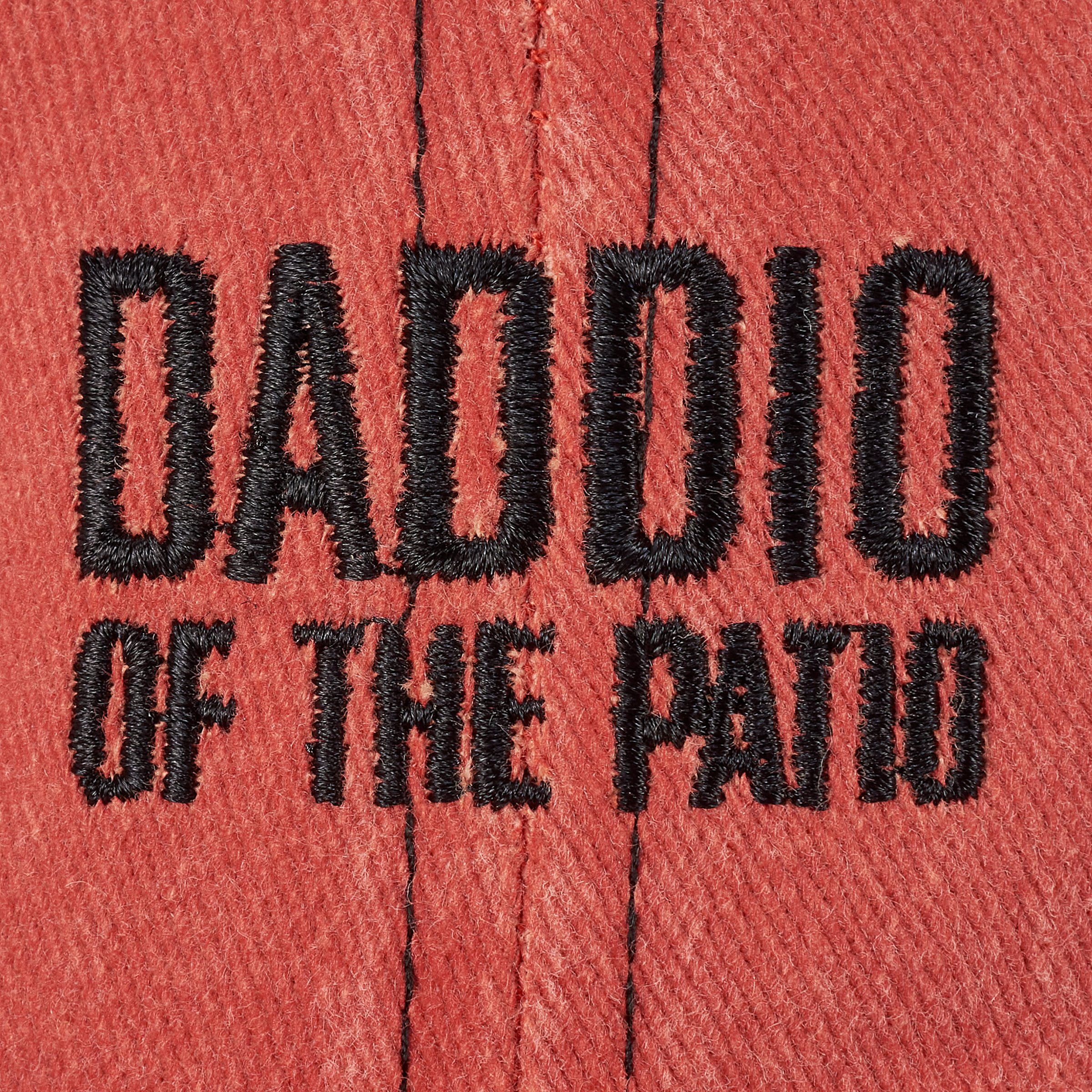 A stonewashed red baseball cap from our Father's Day Collection displaying a fun dad inspired sentiment in a box sign style that reads "Daddio Of The Patio" with black thread accents. Dad hat features fully embroidered sentiment for added detail. Our Daddio baseball cap is one size fits most with an adjustable metal buckle to create the perfect fit. Hand wash only. A fun Father's Day gift perfect for an everyday accessory.