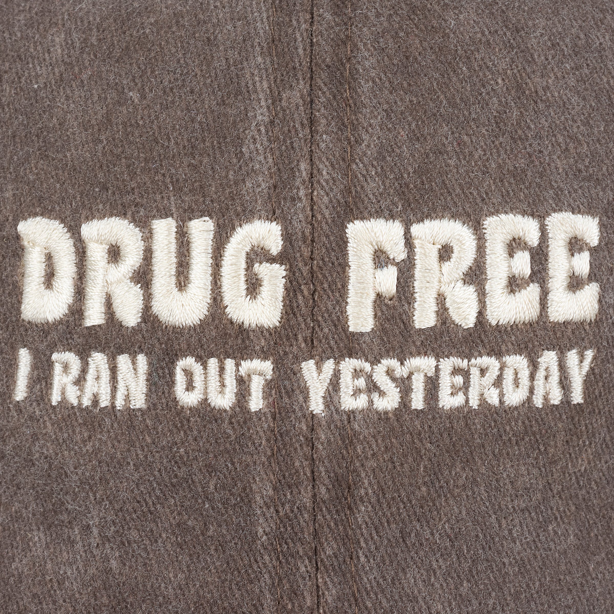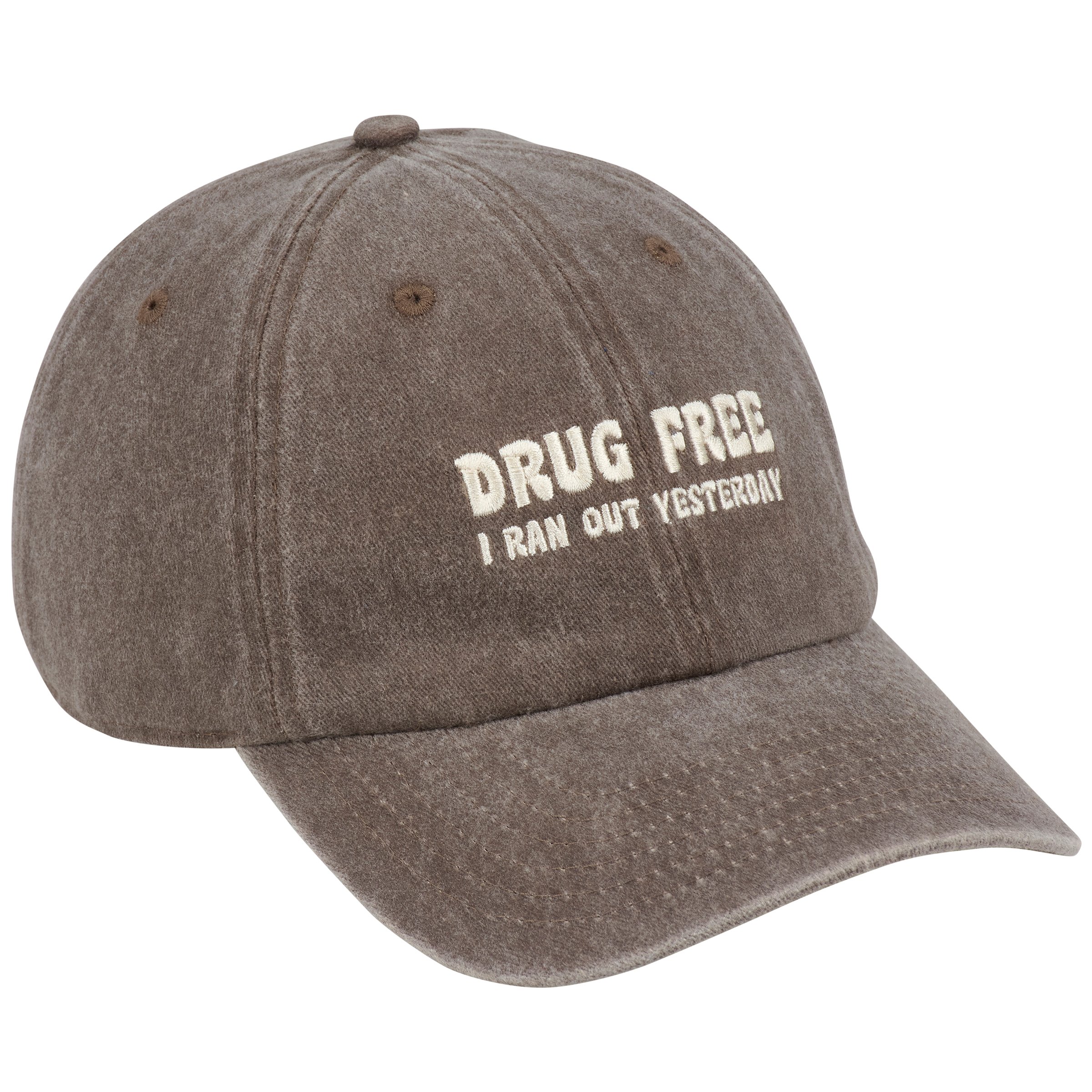 This earthy brown baseball cap displays an honest sentiment that reads "Drug Free - I Ran Out Yesterday" for those currently sober, but not by choice. Funny drug free sentiment is fully embroidered on stonewashed cotton that gives this casual everyday hat a naturally worn look. Questionables baseball caps are one size fits most with an adjustable metal buckle to create the perfect fit. Hand wash only. Our Drug Free baseball cap is perfect for everyday expression and letting everyone know a little, or a lot, about yourself.
