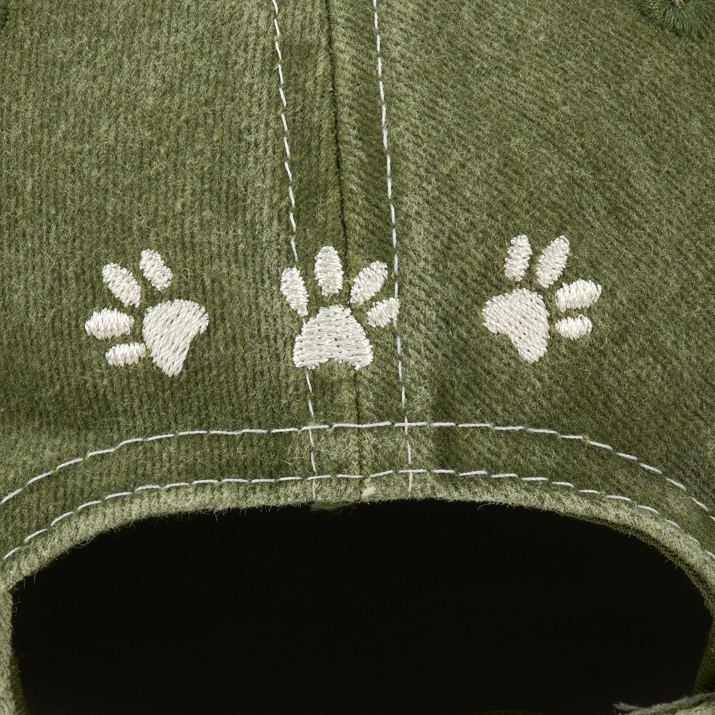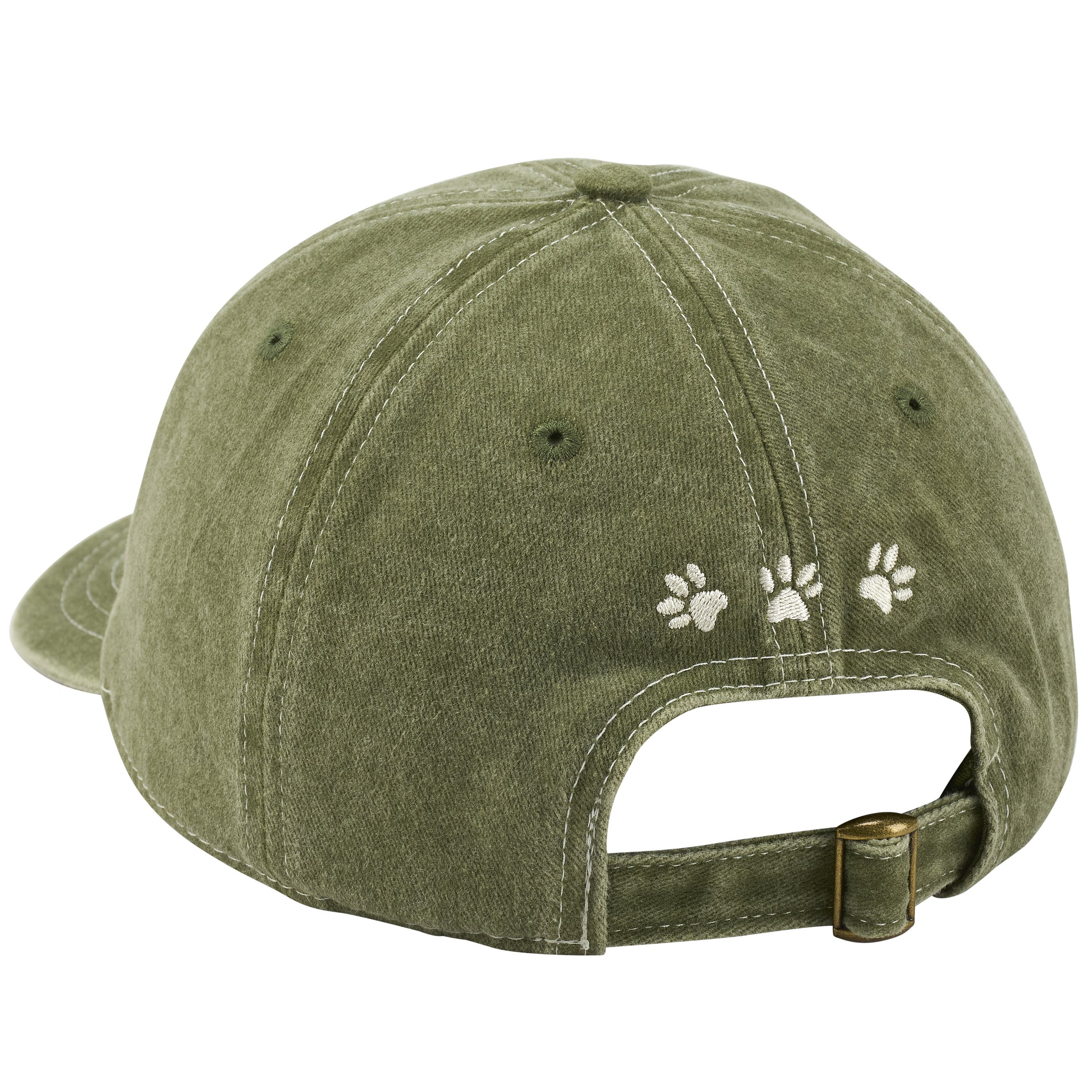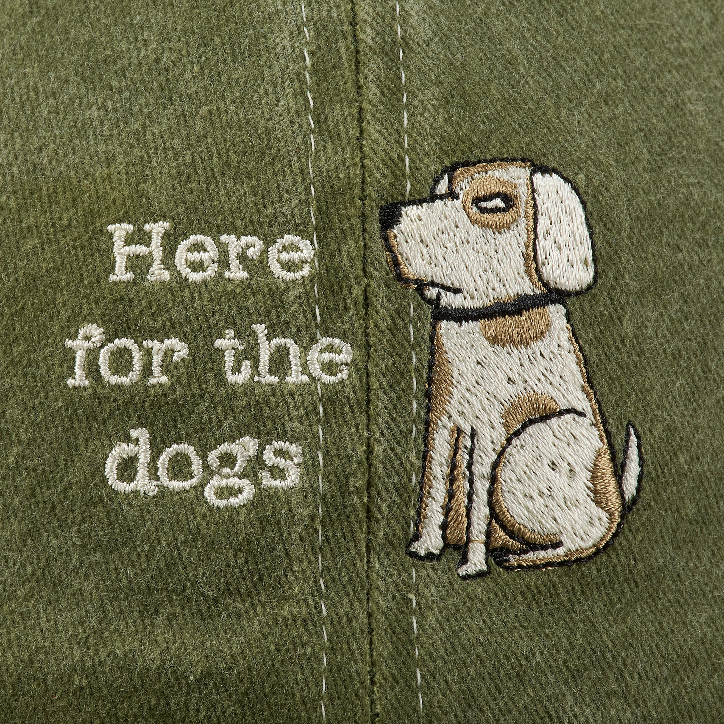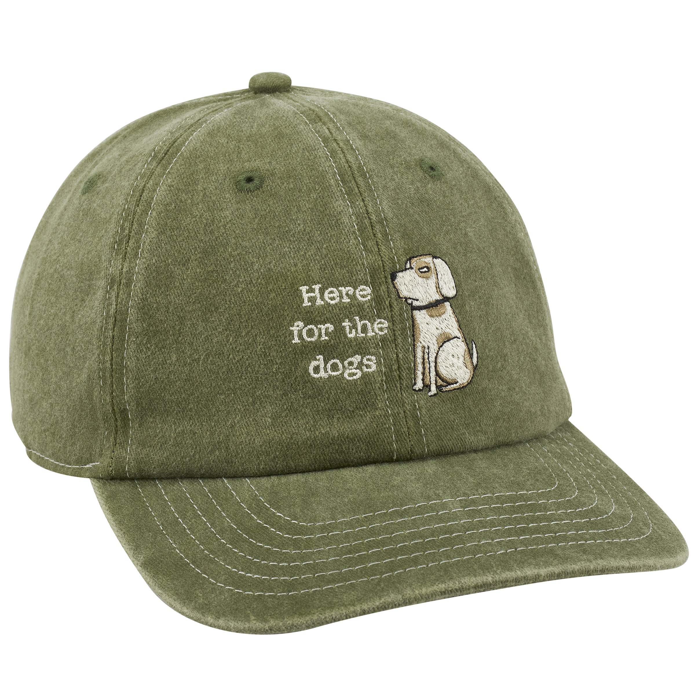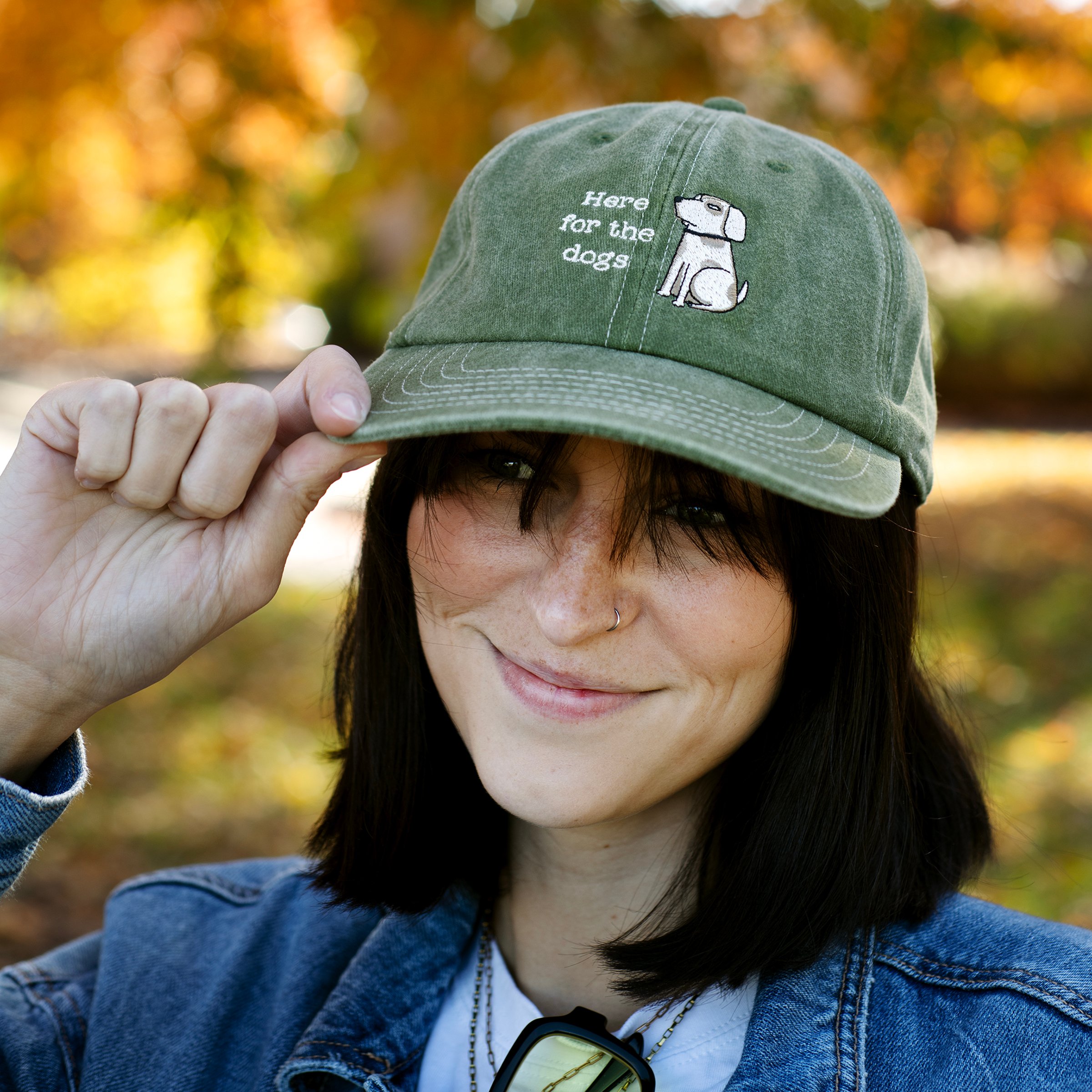 A stonewashed green baseball cap from our Pet Collection displaying a sassy dog with a fun dog themed sentiment that reads "Here For The Dogs" on the front as well as paw prints on the back. This dog lover hat features fully embroidered designs that replicate all of the details of the original hand illustrated art. Our Here For The Dogs baseball cap is one size fits most with an adjustable metal buckle to create the perfect fit. Hand wash only. A fun dog-themed gift perfect for showing off a love for pets every day.