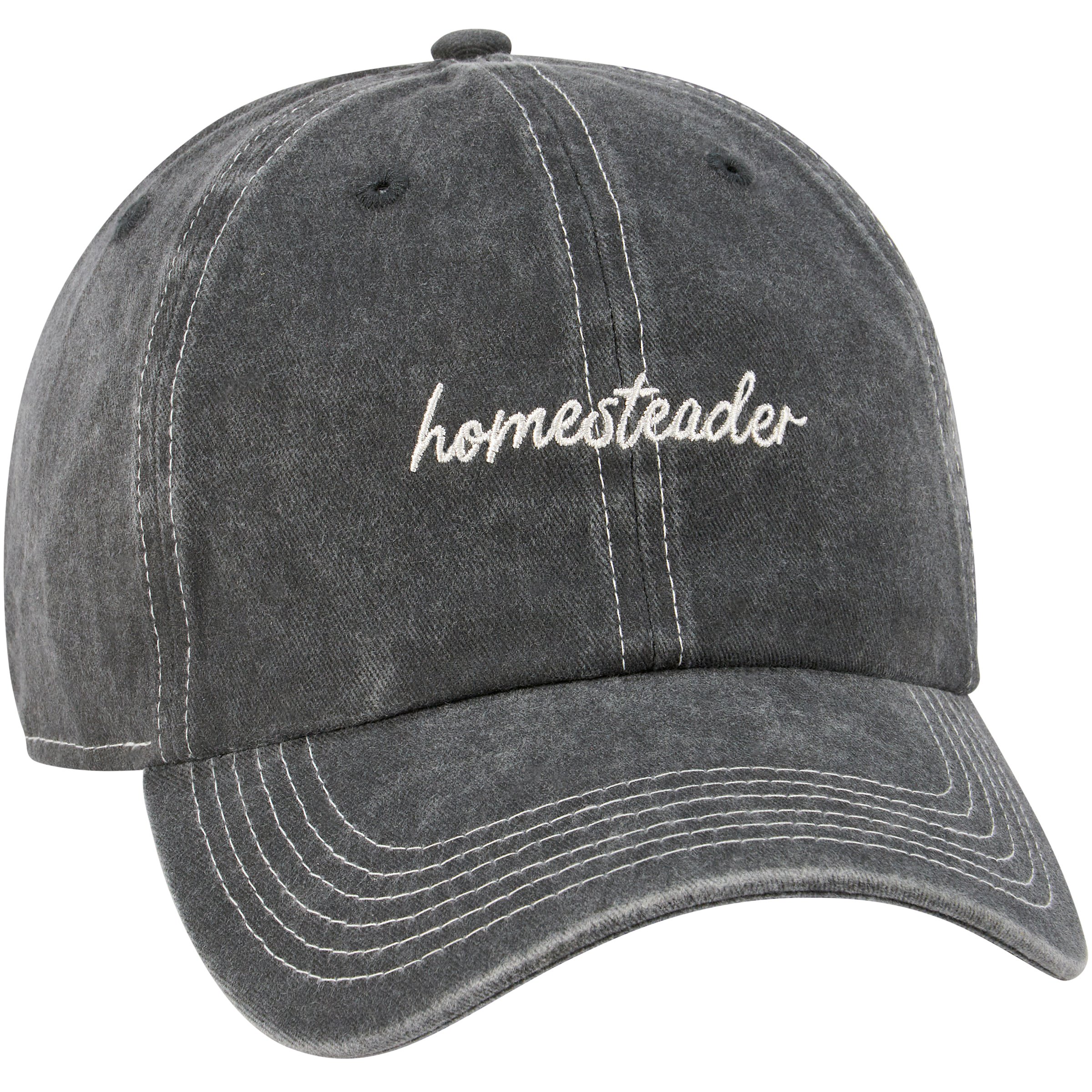 A stonewashed black baseball cap from ourĀ Homestead Collection featuring an embroidered sentiment that reads "Homesteader" perfect for celebrating the homestead lifestyle. Sentiment is embroidered for added detail. Our Homesteader hat is one size fits most with an adjustable buckle closure to create the perfect fit. A farm-themed baseball cap perfect for an everyday accessory. Hand wash only.