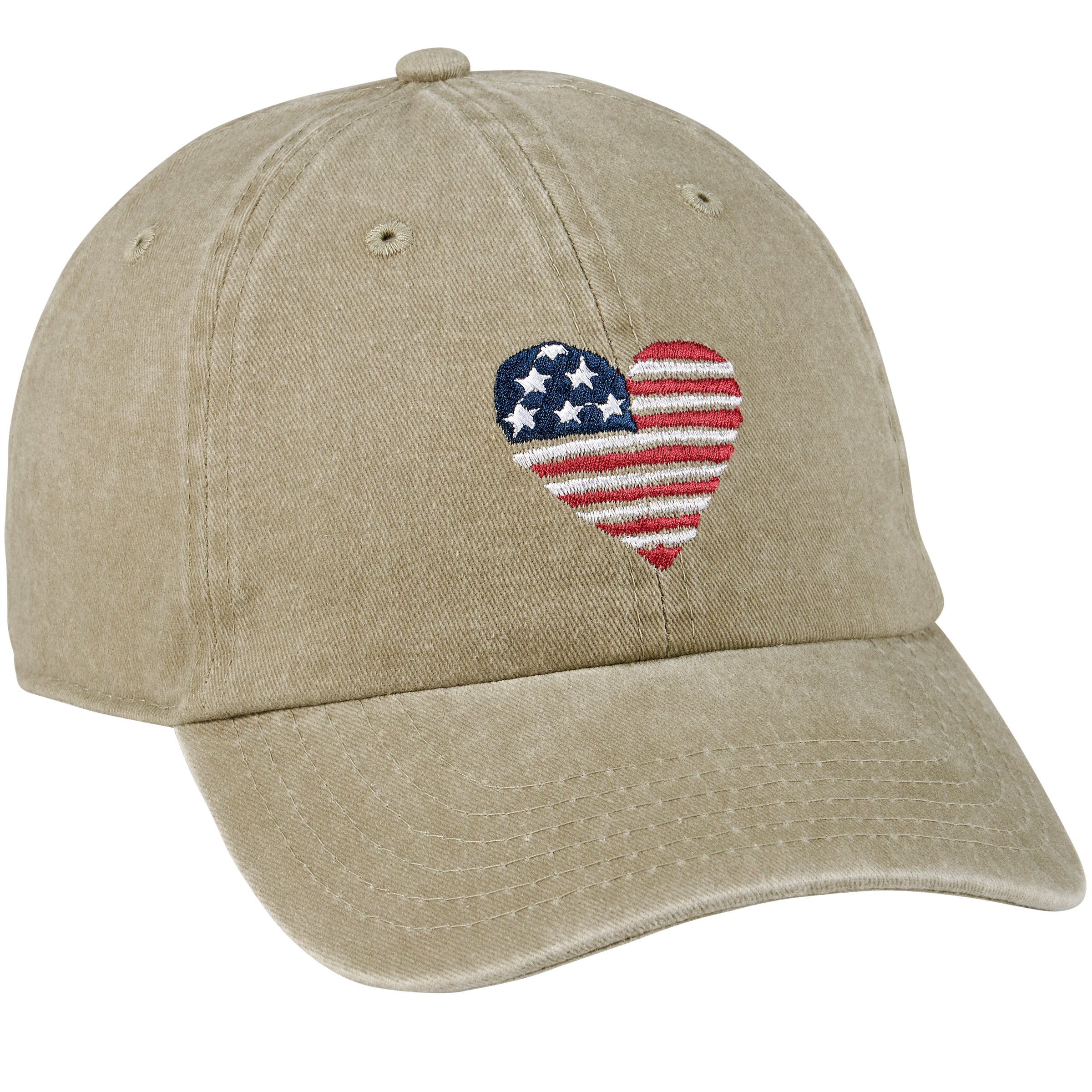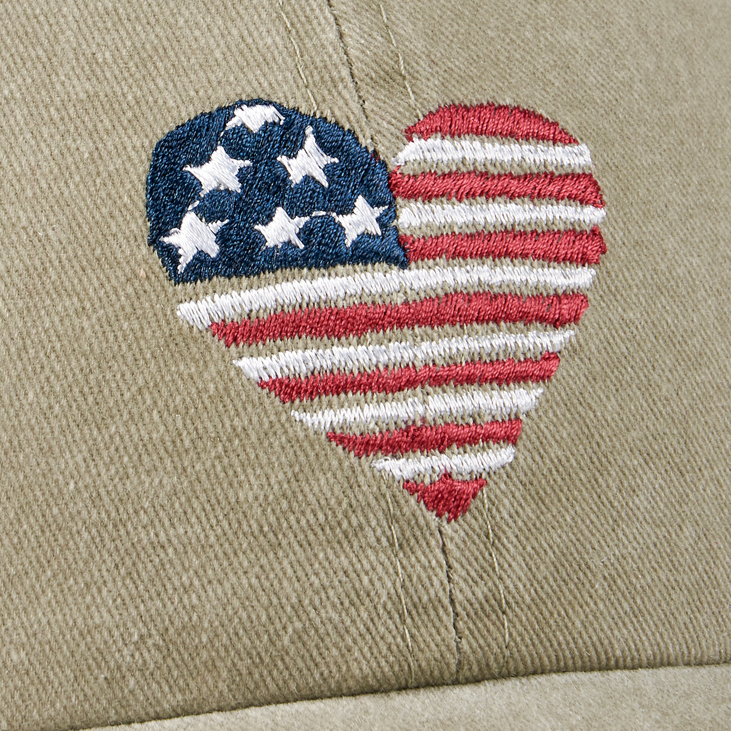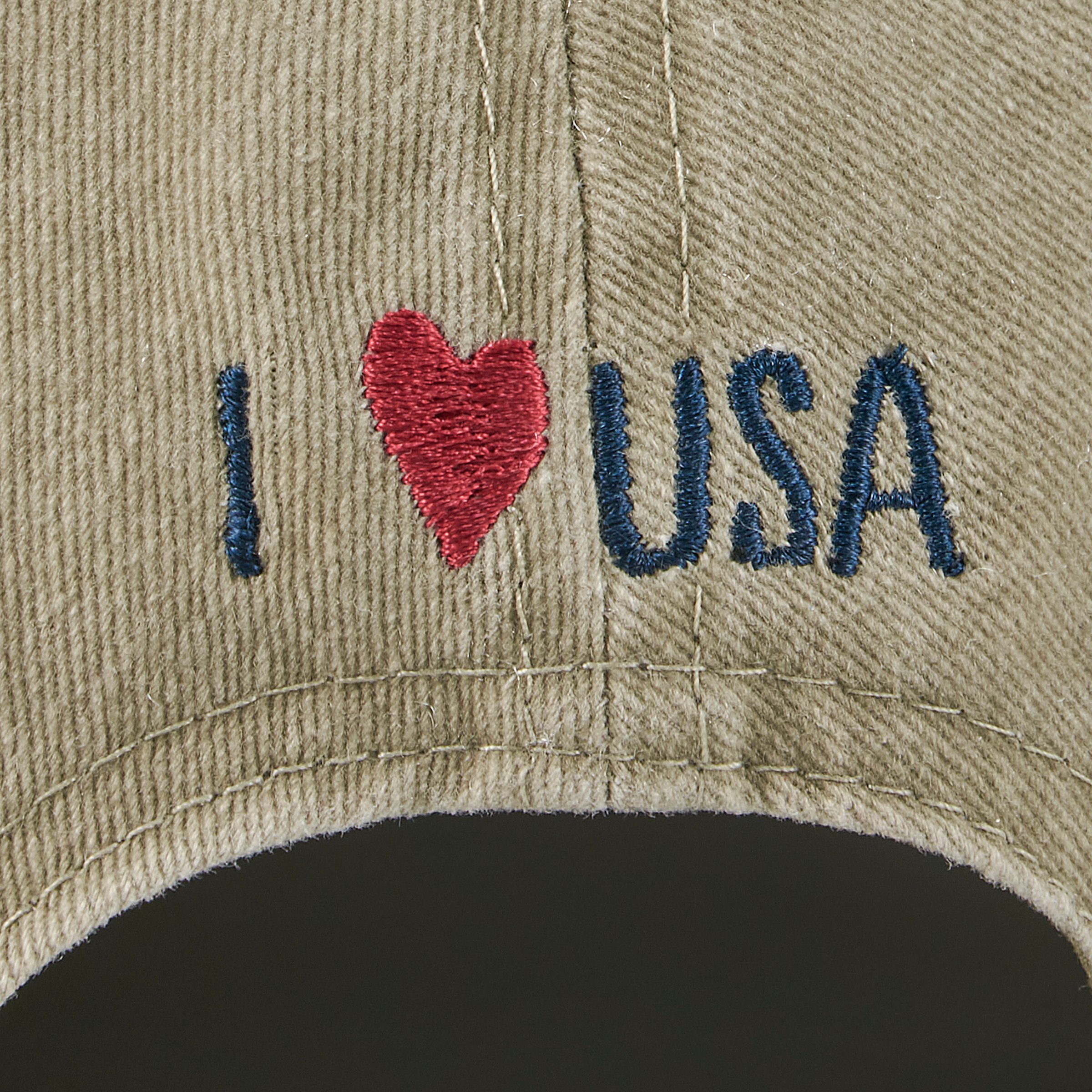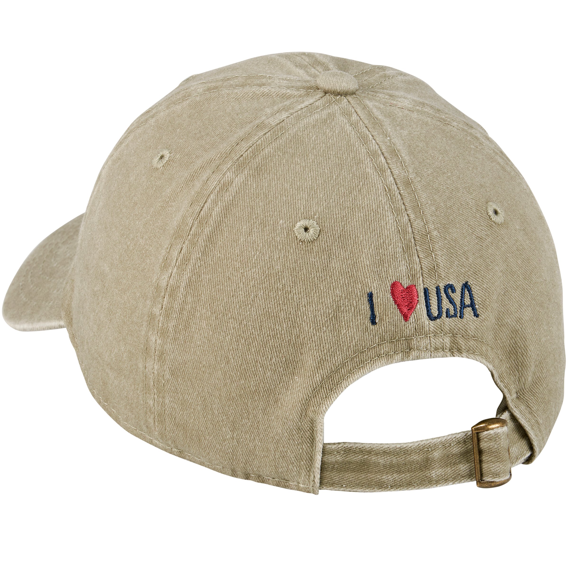 A tan baseball cap from our Patriotic Collection displaying an intricate American Flag design in the shape of a heart with a patriotic sentiment on the back that reads "I Love USA." Cap features embroidered sentiment and design for added detail. Our I Love USA baseball cap is one size fits most with an adjustable buckle closure to create the perfect fit. A fun patriotic accessory perfect for everyday or seasonal use. Hand wash only.