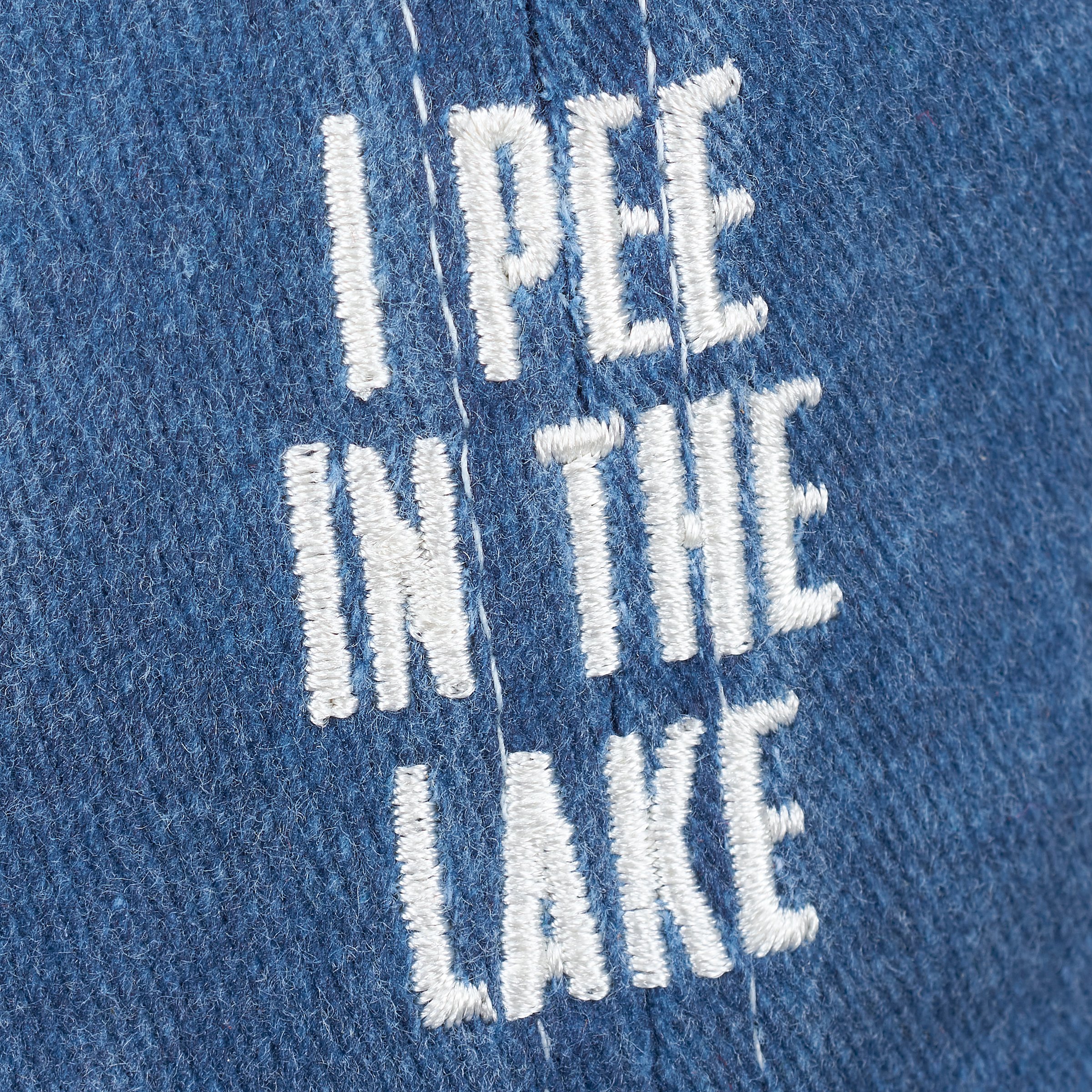 A stonewashed blue baseball cap from our Lake & Cabin Collection displaying a funny lake themed sentiment in a classic box sign style that reads "I Pee In The Lake." This outdoor hat features a fully embroidered design for added detail. Our I Pee In The Lake baseball cap is one size fits most with an adjustable metal buckle to create the perfect fit. Hand wash only. A fun lake themed gift perfect for an outdoor accessory.