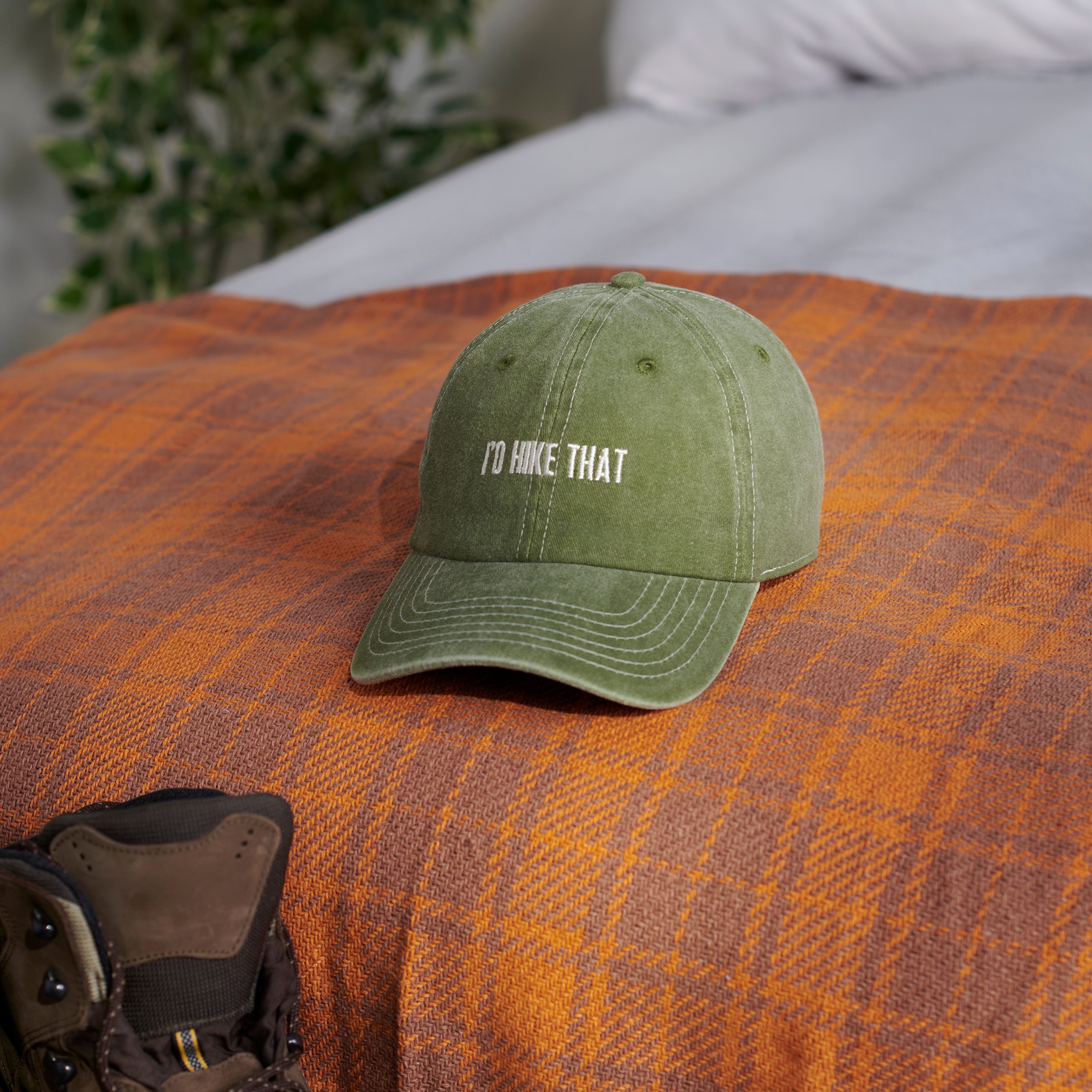 A stonewashed green baseball cap from our Lake & Cabin Collection displaying a fun hiking inspired sentiment in a box sign style that reads "I'd Hike That" with cream thread accents. Hiking hat features fully embroidered sentiment for added detail. Our I'd Hike That baseball cap is one size fits most with an adjustable metal buckle to create the perfect fit. Hand wash only. A fun hiking accessory great for gifting.