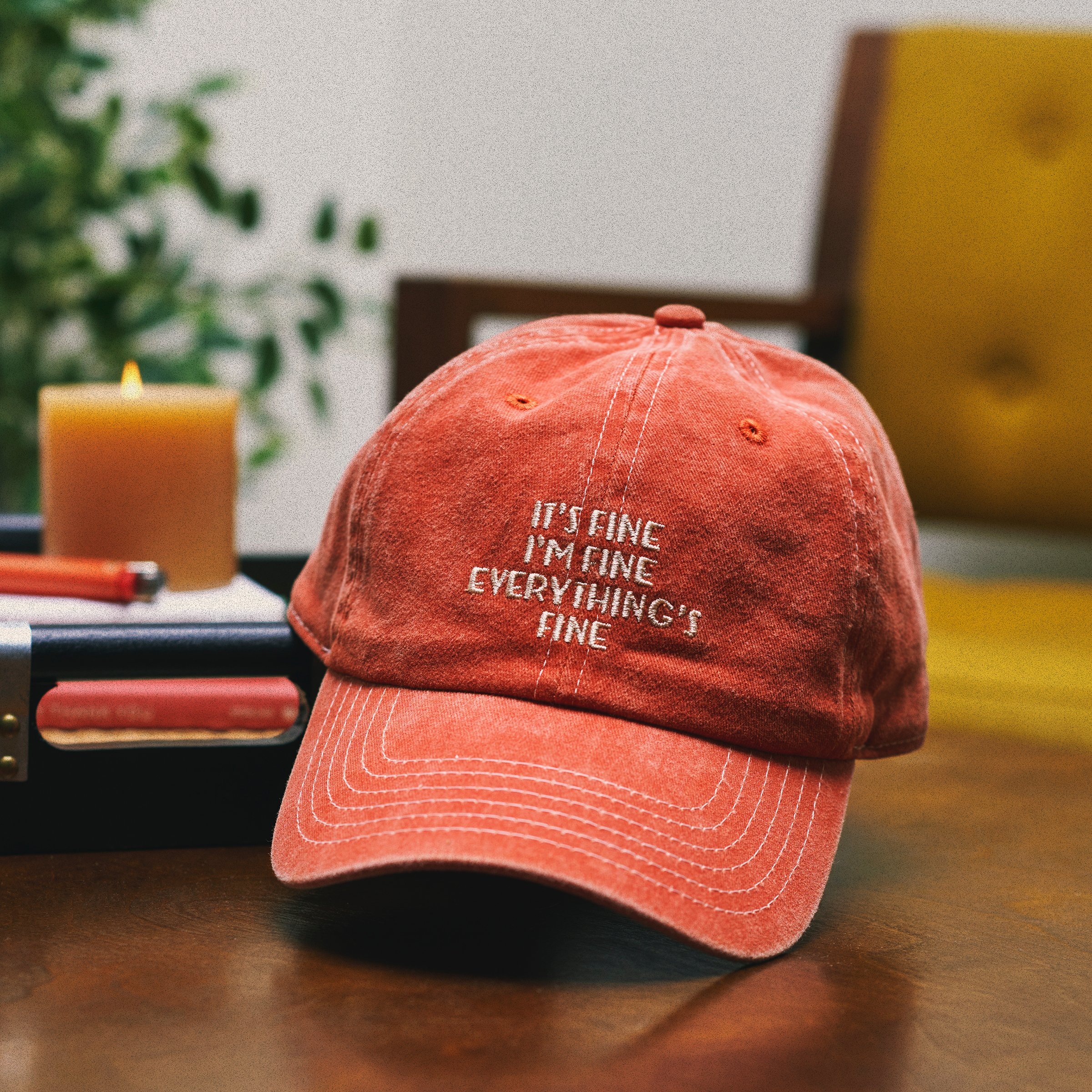 Saying something three times makes it true, right? This vibrant baseball cap displays a relatable sentiment that reads "It's Fine, I'm Fine, Everything's Fine" in a bold style. Stylish design is fully embroidered on stonewashed cotton for a naturally worn look. Questionables baseball caps are one size fits most with an adjustable buckle closure to create the perfect fit. Hand wash only. Our It's Fine baseball cap demands attention making it perfect for everyday expression.