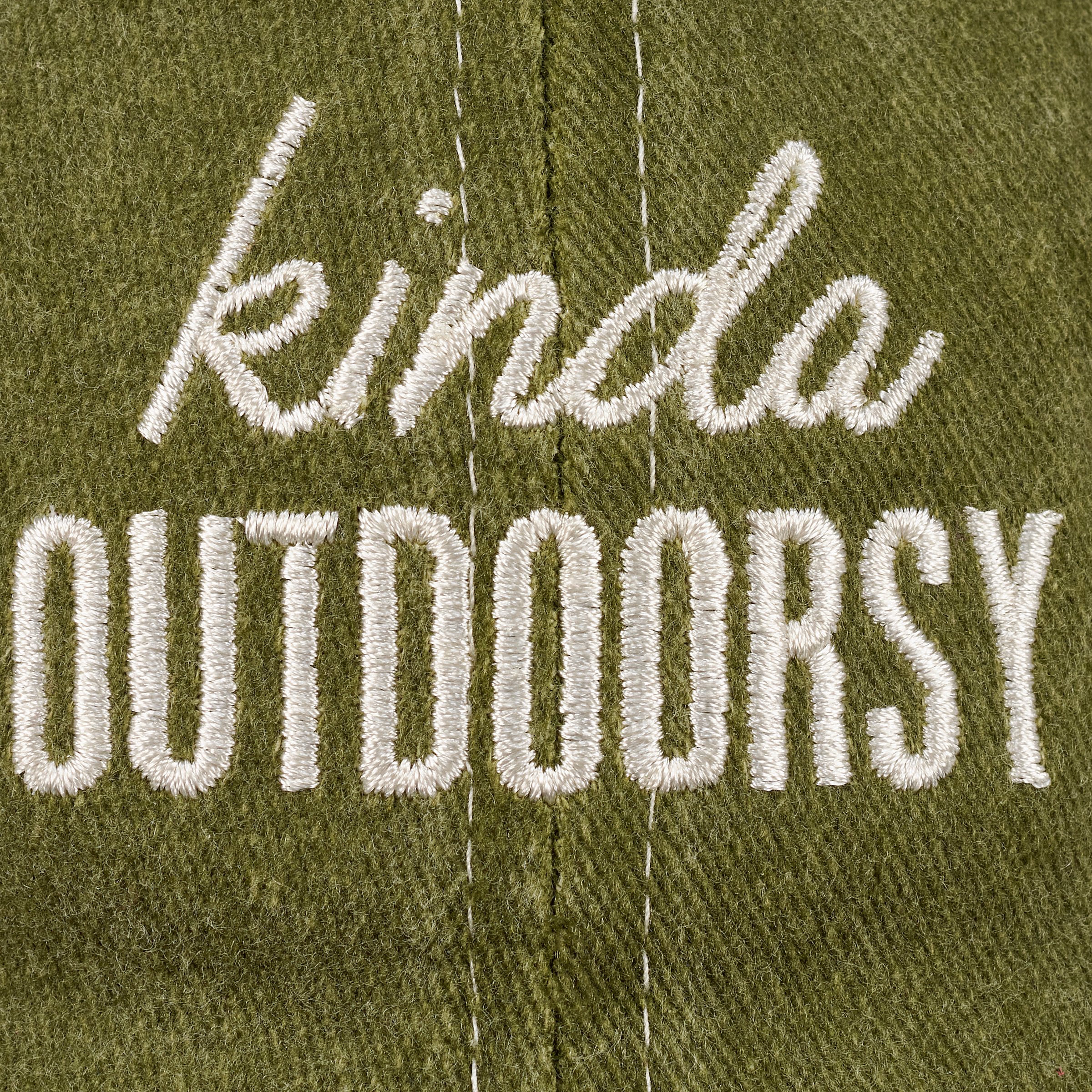A stonewashed green baseball cap from our Lake & Cabin Collection displaying a fun outdoor inspired sentiment in a box sign style that reads "Kinda Outdoorsy" with cream thread accents. Outdoor hat features fully embroidered sentiment for added detail. Our Kinda Outdoorsy baseball cap is one size fits most with an adjustable metal buckle to create the perfect fit. Hand wash only. A fun outdoor accessory great for gifting.