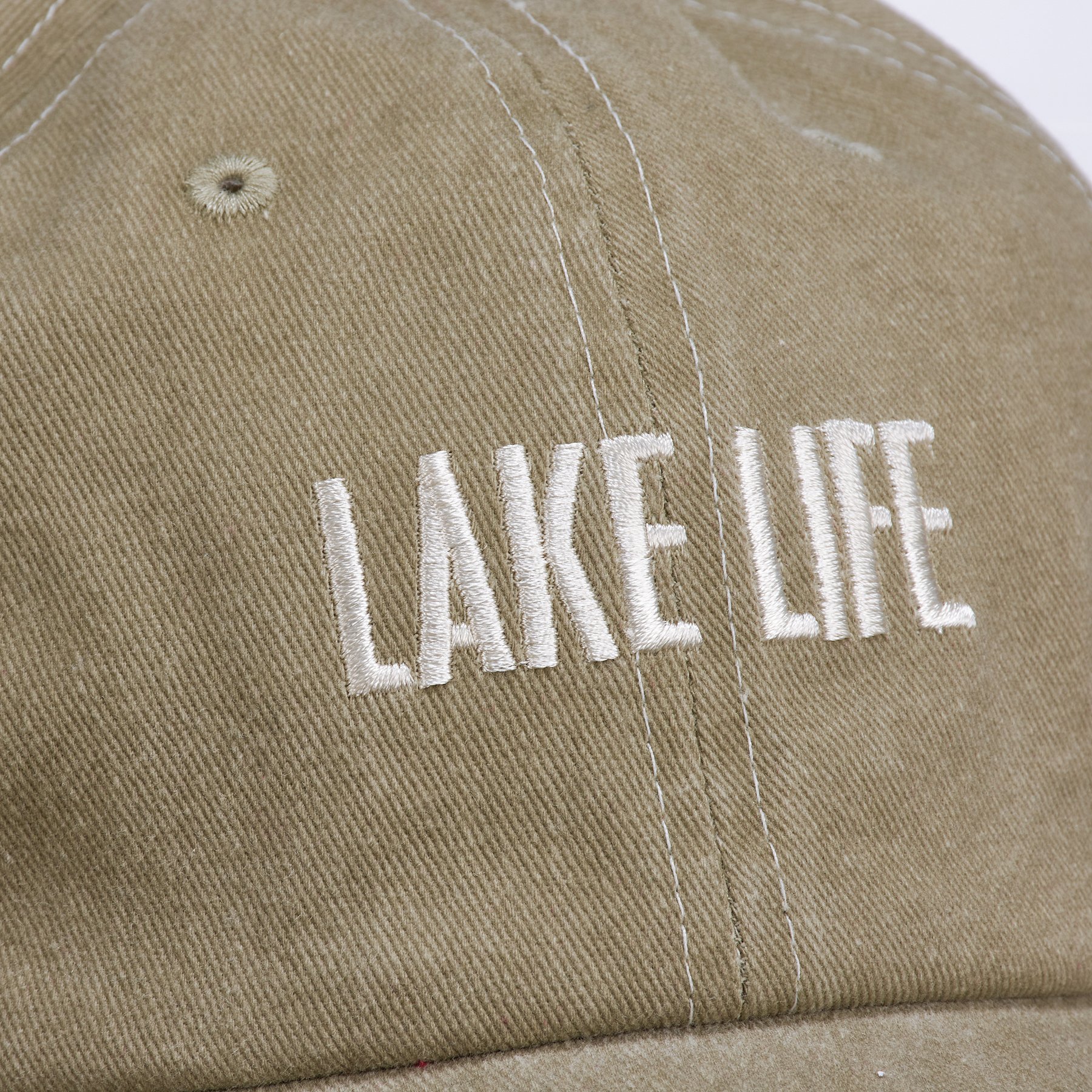 A stonewashed green baseball cap from our Lake & Cabin Collection displaying a fun "Lake Life" sentiment with cream thread accents. Cap features embroidered sentiment for added detail. Our Lake Life hat is one size fits most with an adjustable buckle closure to create the perfect fit. A stylish accessory option for an outdoor adventure. Hand wash only.