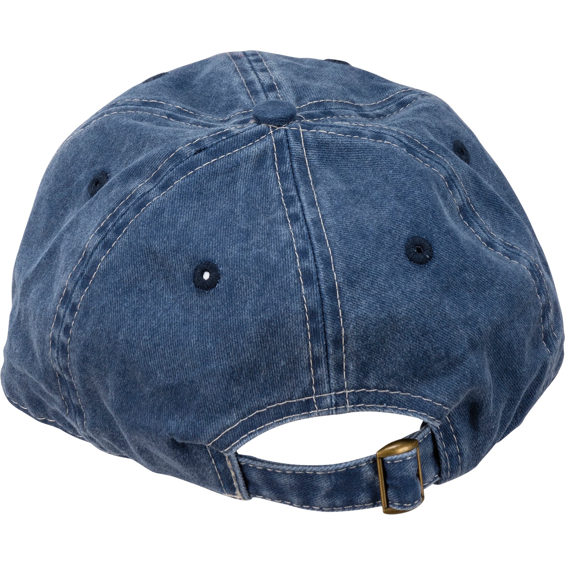 A cotton baseball cap with an adjustable brass closure on the back. Features box sign style "Let's Day Drink" sentiment embroidered in cream onto a weathered navy blue base. One size fits most. Hand-wash only.