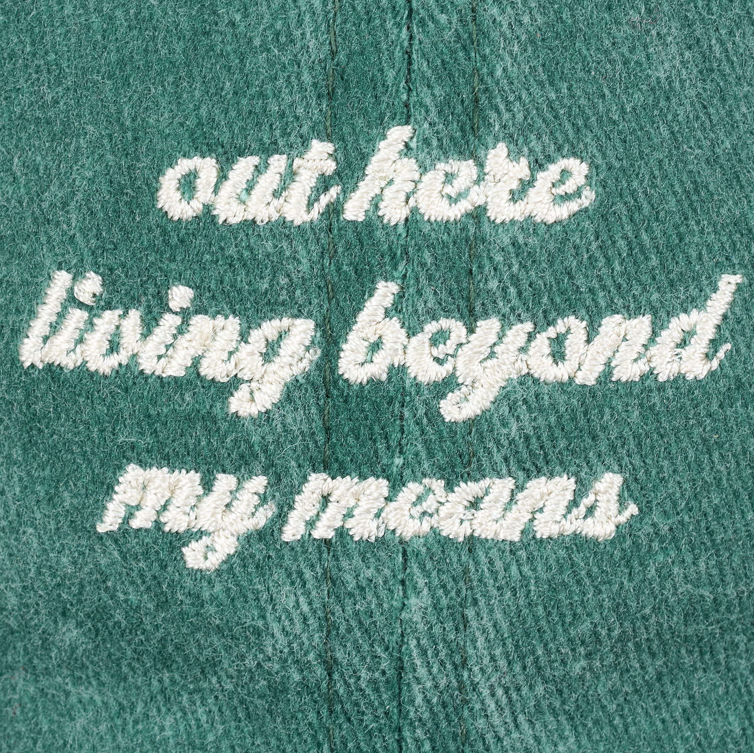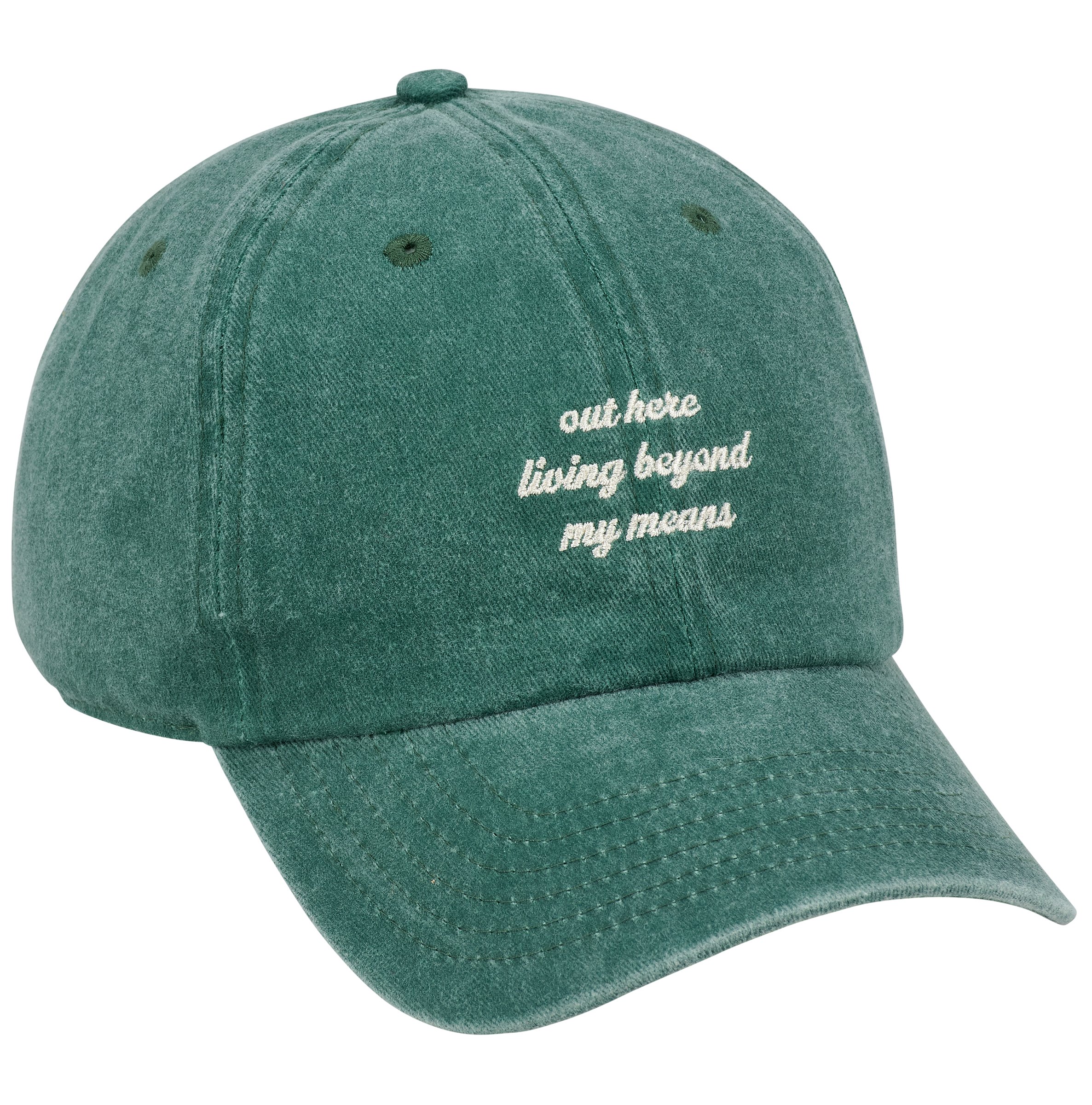 This green baseball cap displays a relatable sentiment that reads "Out Here Living Beyond My Means" in a hand written style for honest self-expression. Relatable sentiment is fully embroidered on stonewashed cotton that gives this casual everyday hat a naturally worn look. Questionables baseball caps are one size fits most with an adjustable metal buckle to create the perfect fit. Hand wash only. Our Living Beyond My Means baseball cap is perfect for everyday expression.