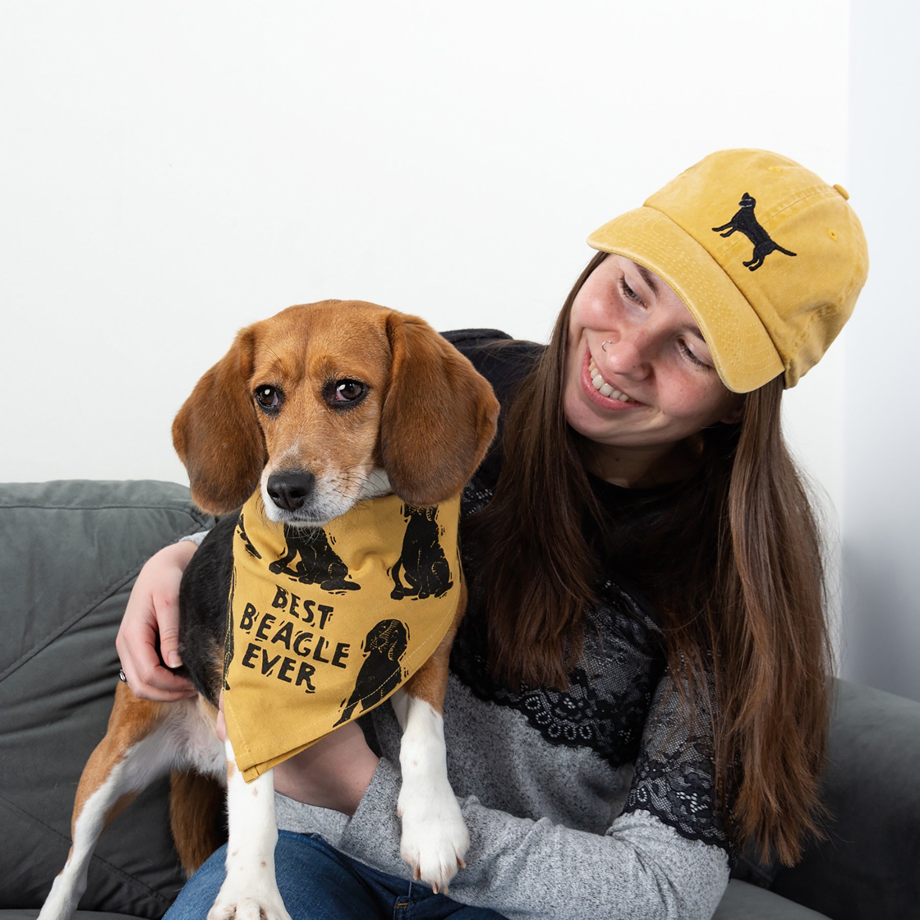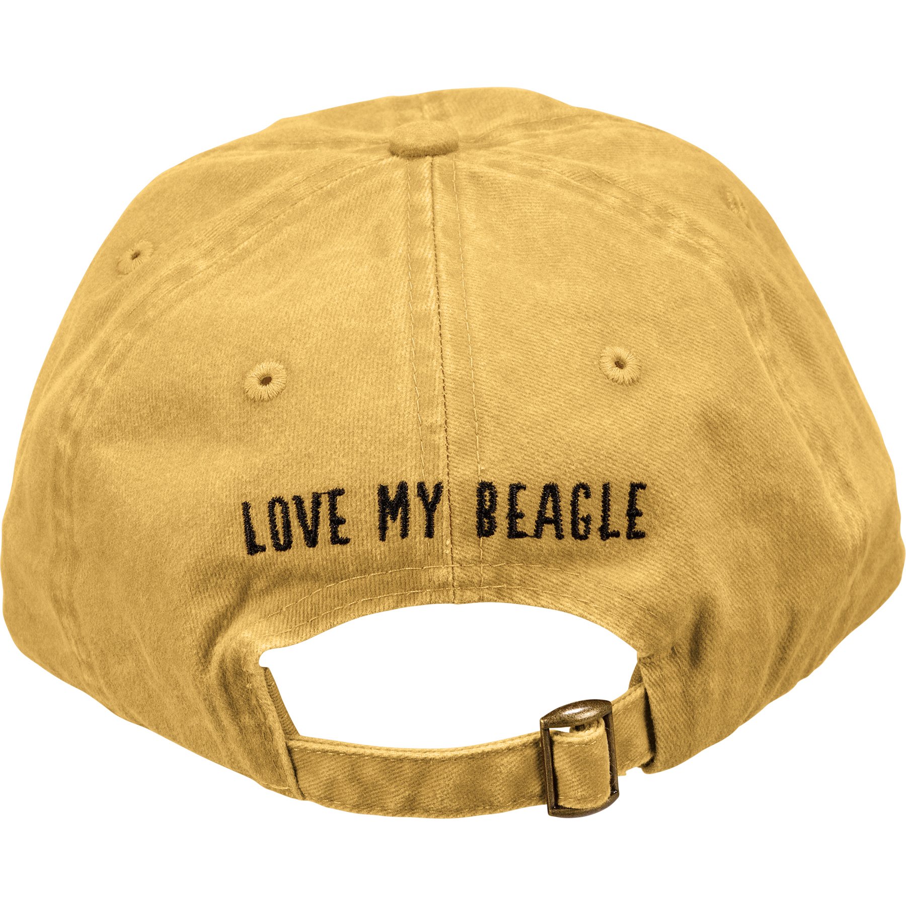 A cotton baseball cap from our Pet Collection with an adjustable brass closure. Features an embroidered beagle design on the front and "Love My Beagle" sentiment on the reverse side. Cap is one size fits most and hand-wash only. The Love My Beagle hat coordinates with our Best Beagle Ever Pet Bandana for matching dog and owner outfits.