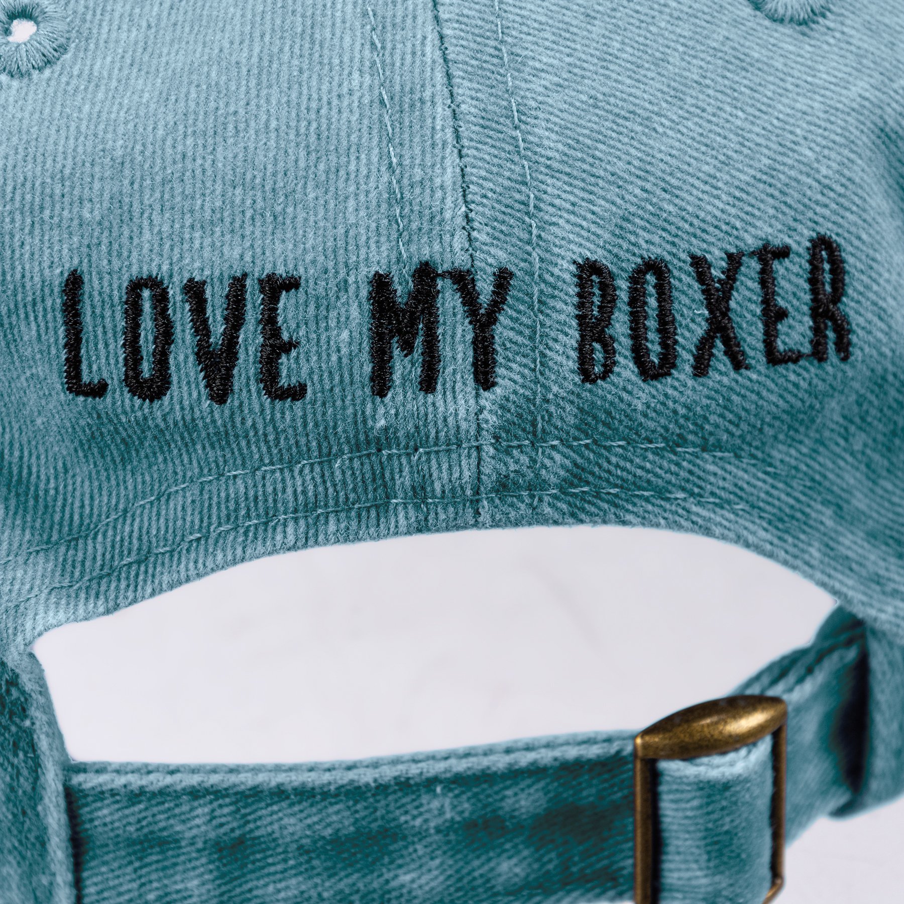 A cotton baseball cap from our Pet Collection with an adjustable brass closure. Features an embroidered boxer design on the front and "Love My Boxer" sentiment on the reverse side. Cap is one size fits most and hand-wash only. The Love My Boxer cap coordinates with our Best Boxer Ever Pet Bandana for matching dog and owner outfits.