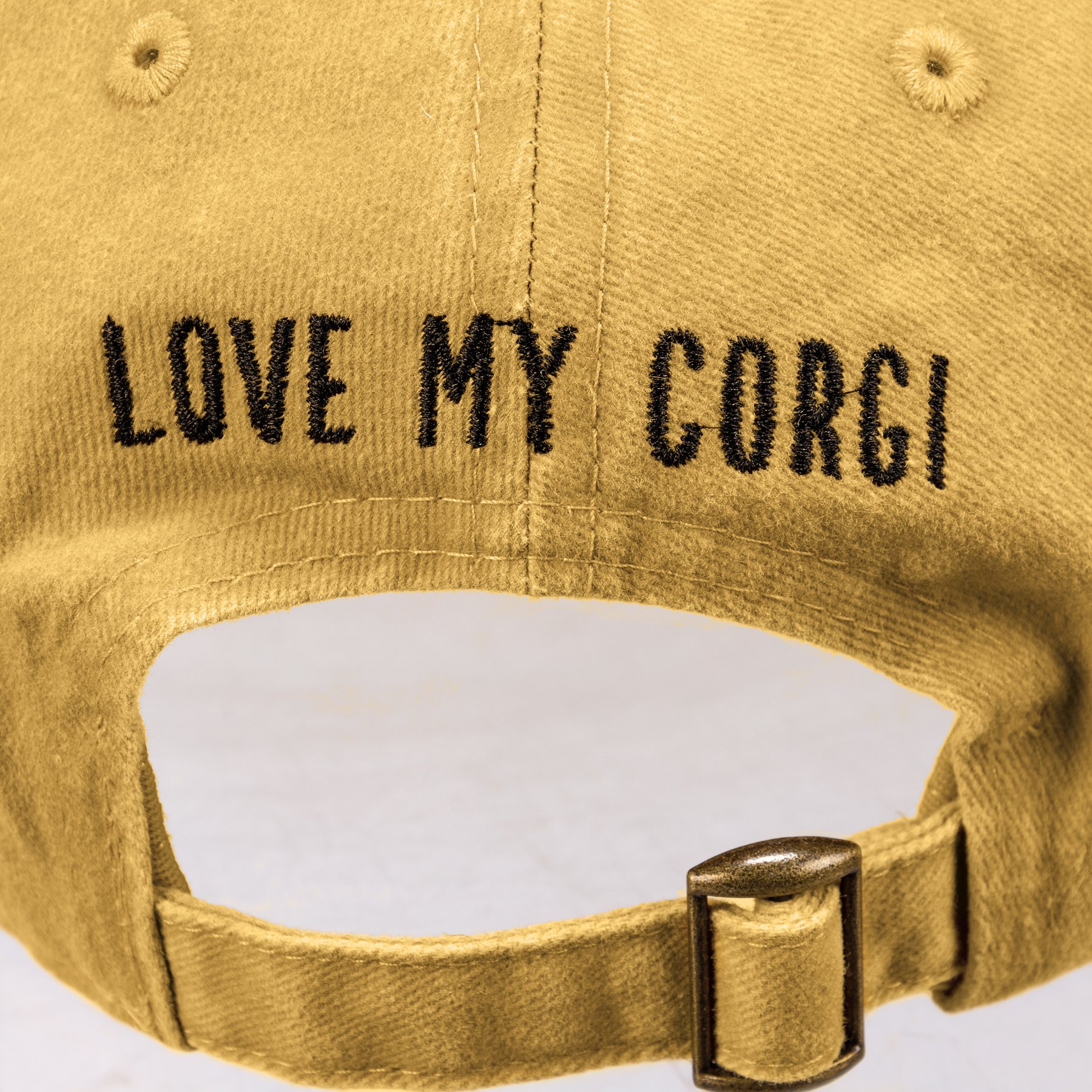 A cotton baseball cap from our Pet Collection with an adjustable brass closure. Features an embroidered corgi design on the front and "Love My Corgi" sentiment on the reverse side. Cap is one size fits most and hand-wash only. The Love My Corgi hat coordinates with our Best Corgi Ever Pet Bandana for matching dog and owner outfits.