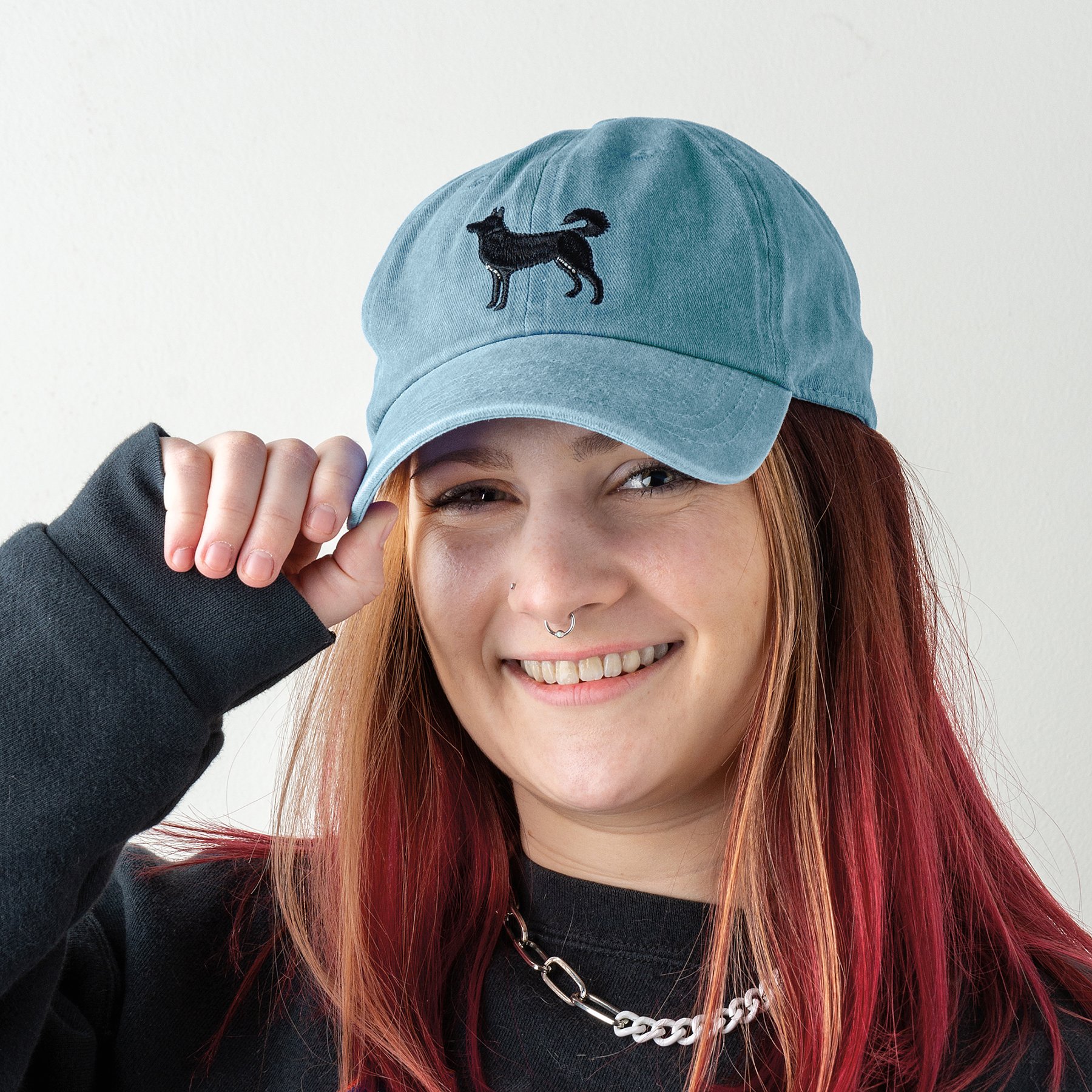A cotton baseball cap from our Pet Collection with an adjustable brass closure. Features an embroidered husky design on the front and "Love My Husky" sentiment on the reverse side. Cap is one size fits most and hand-wash only. The Love My Husky hat coordinates with our Best Husky Ever Pet Bandana for matching dog and owner outfits.