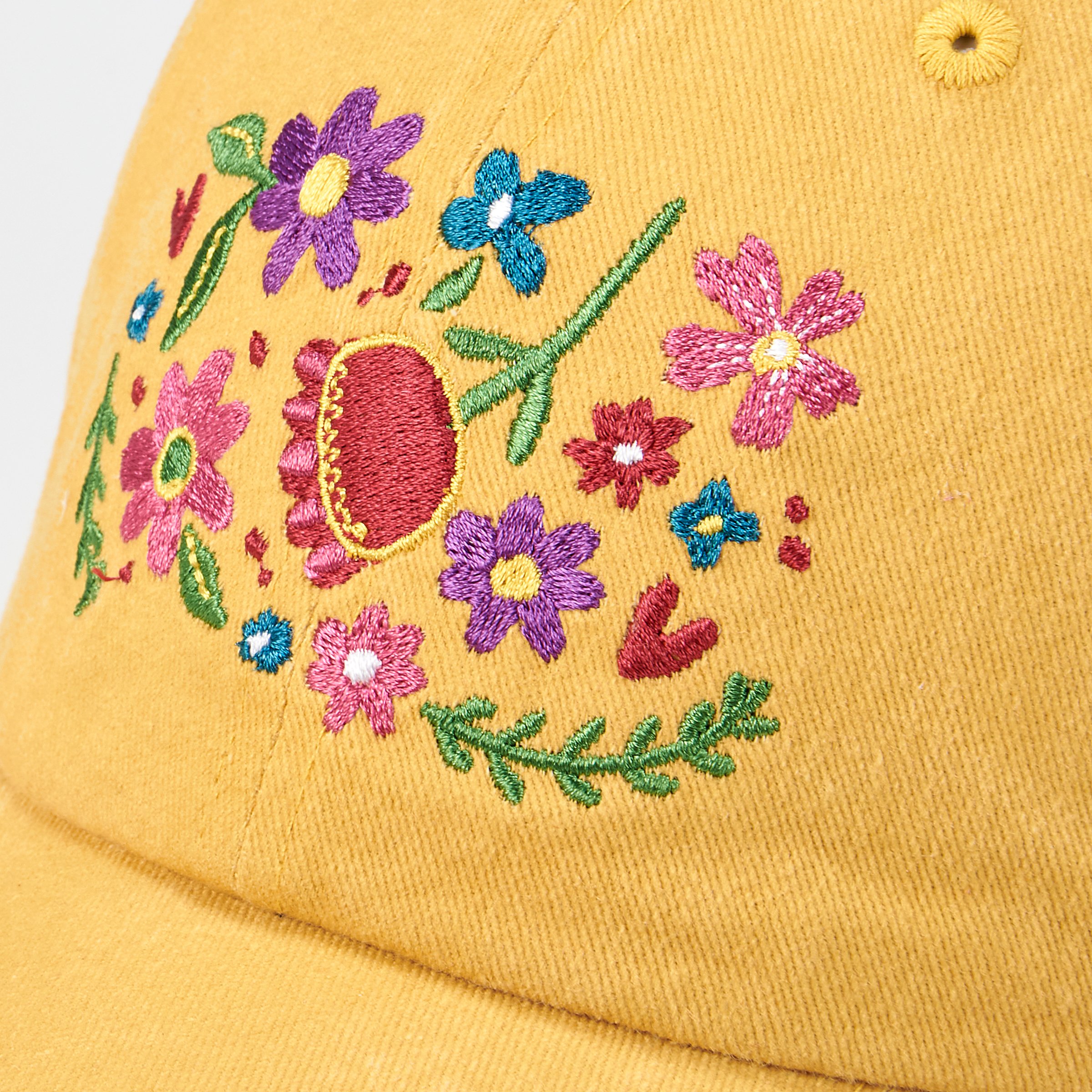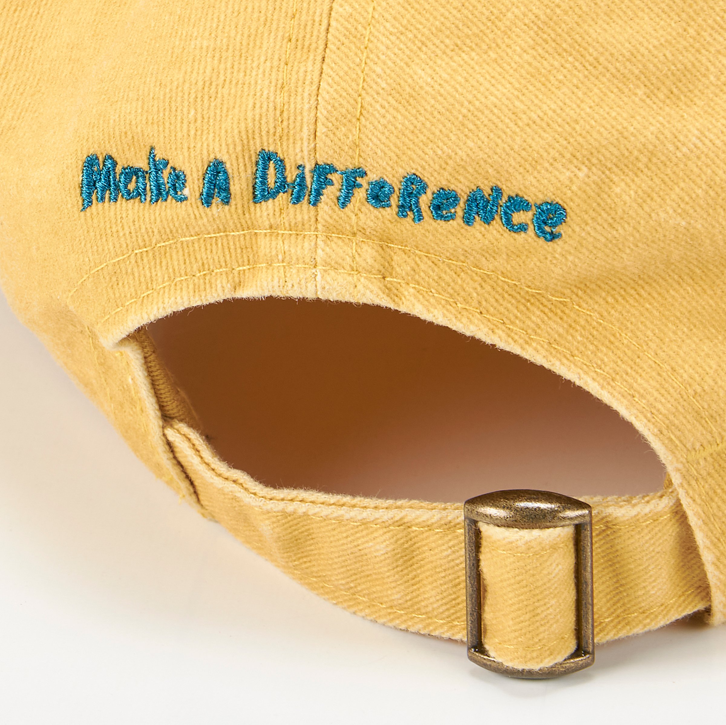 A yellow baseball cap from our Inspiration & Blooms Collection displaying a vibrant design of flowers with inspirational sentiment on the back that reads "Make A Difference." Cap features embroidered sentiment and design for added detail. Our Make A Difference baseball cap is one size fits most with an adjustable buckle closure to create the perfect fit. An uplifting accessory perfect for everyday use. Hand wash only.