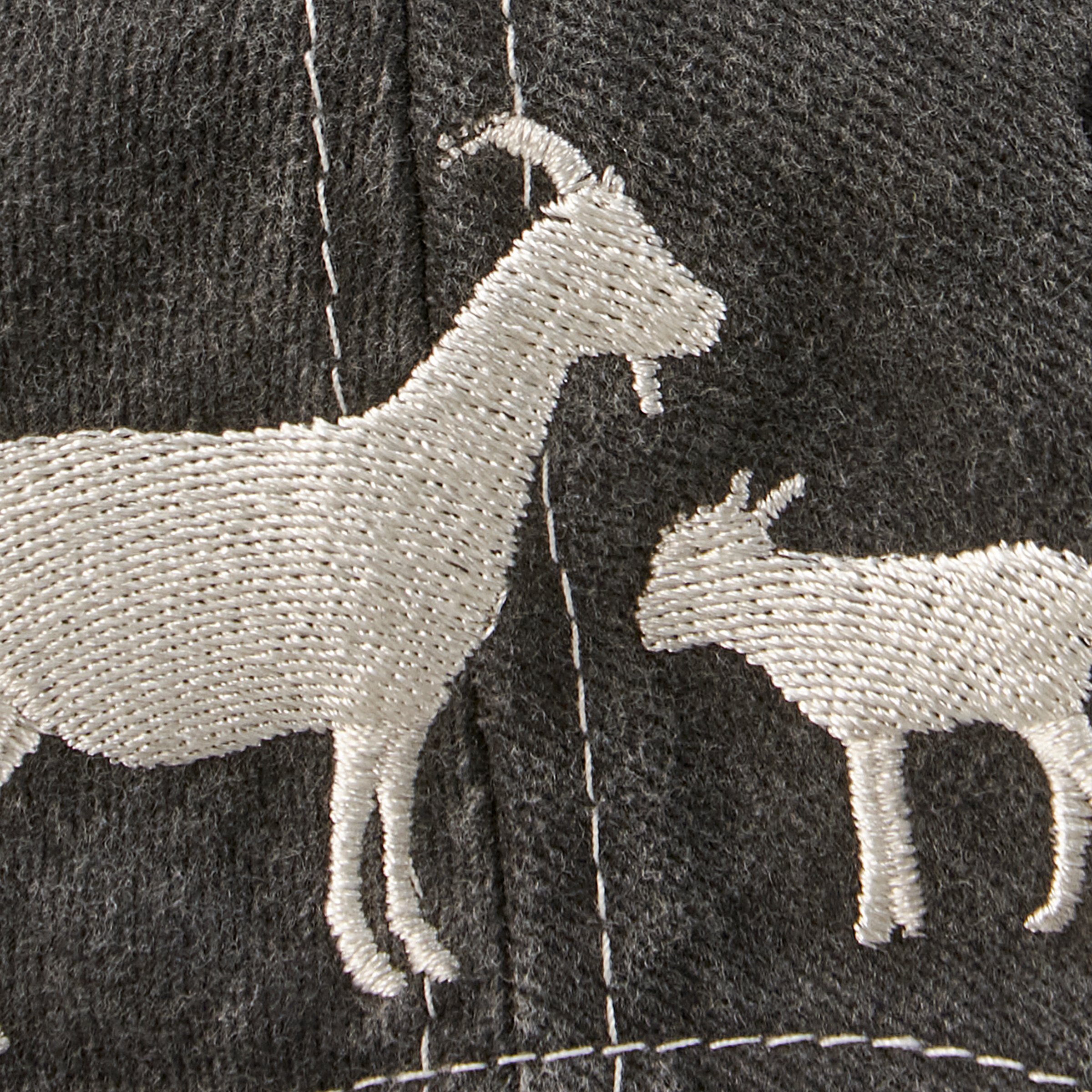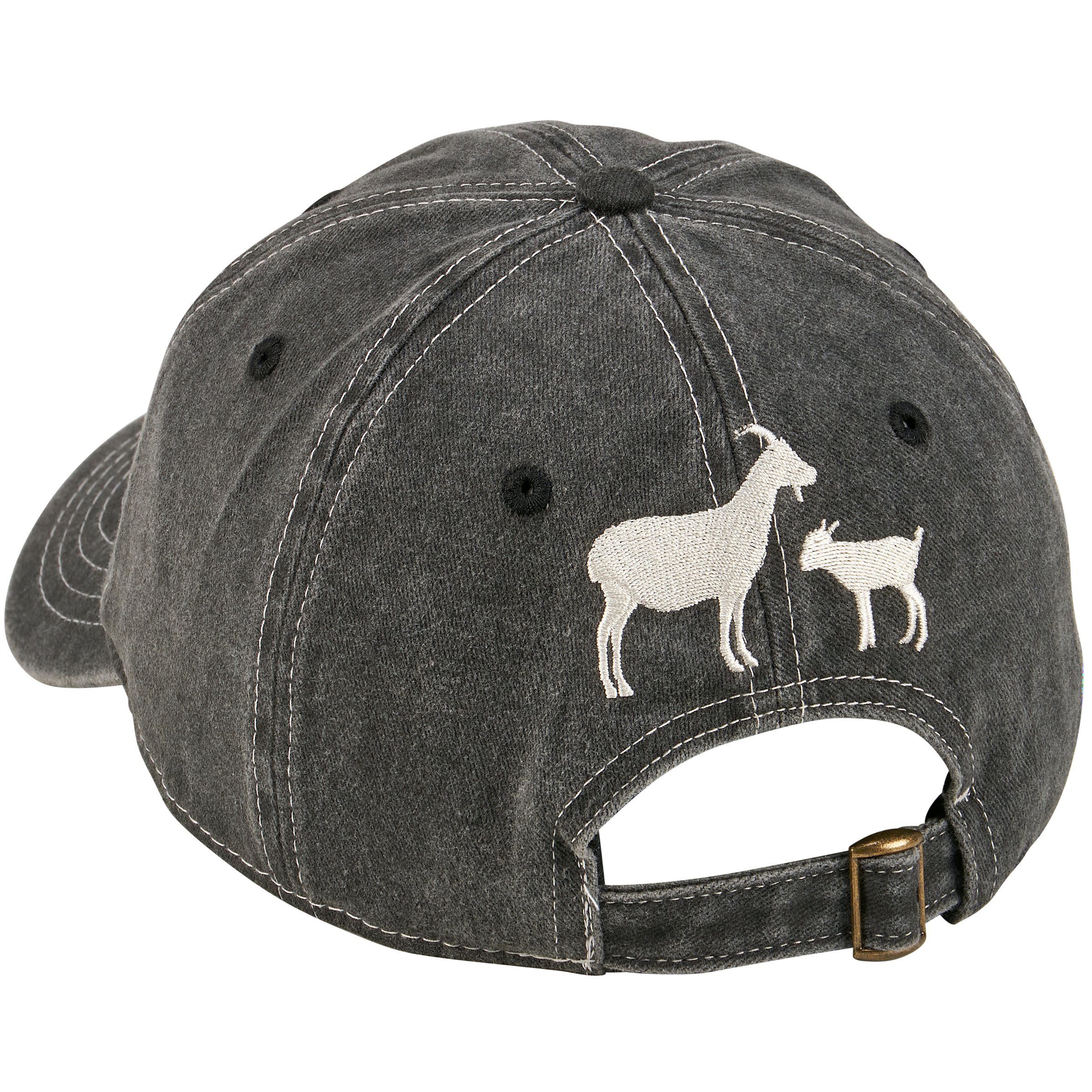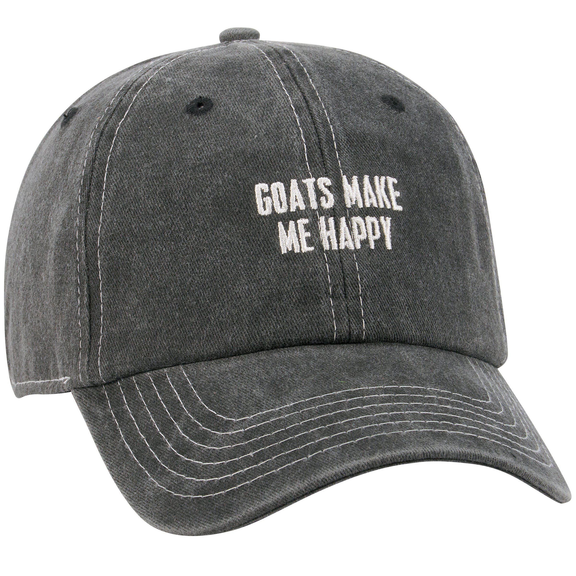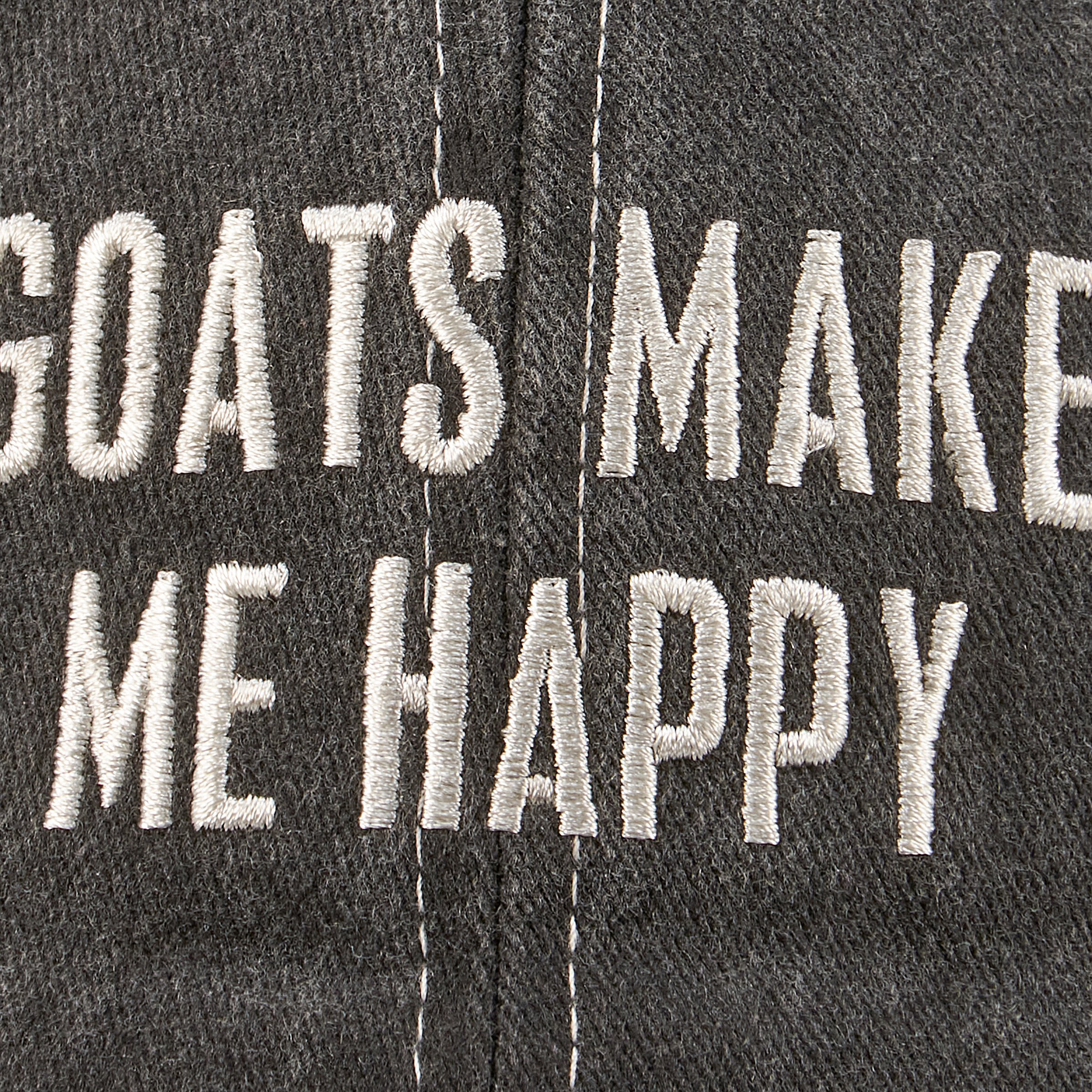 A stonewashed black baseball cap from our Farmhouse Collection displaying a fun farm inspired sentiment that reads "Goats Make Me Happy" with cream thread accents and coordinating farm goat designs on the back. Cap features embroidered sentiment and designs for added detail. Our Goats Make Me Happy hat is one size fits most with an adjustable buckle closure to create the perfect fit. A farm-themed baseball cap perfect for an everyday accessory. Hand wash only.