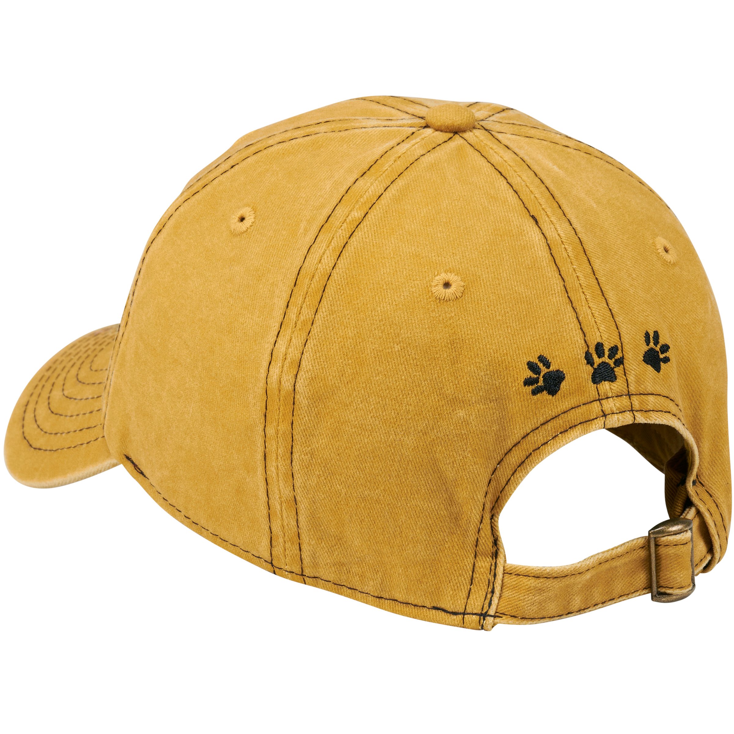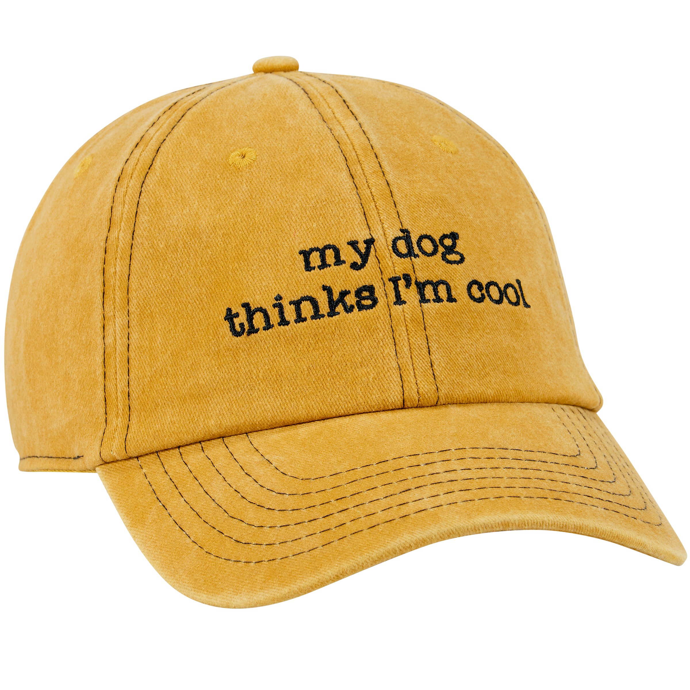 A gold baseball cap from our Pet Collection displaying a playful "My Dog Thinks I'm Cool" sentiment with paw prints design on the back and black thread accents. Cap features embroidered sentiment and design for added detail. Our My Dog Thinks I'm Cool hat is one size fits most with an adjustable buckle closure to create the perfect fit. A fun pet-themed accessory to wear for everyday use. Hand wash only.