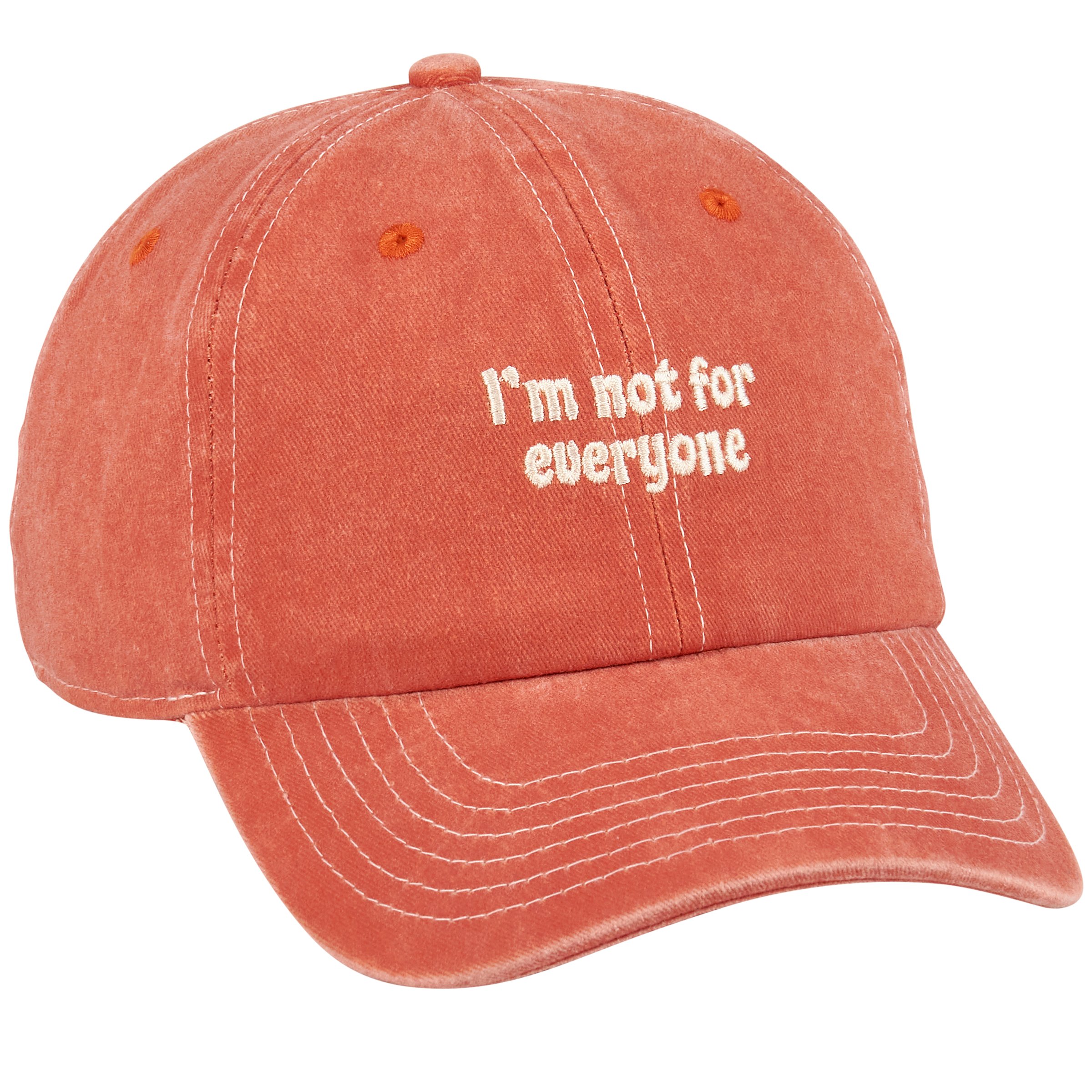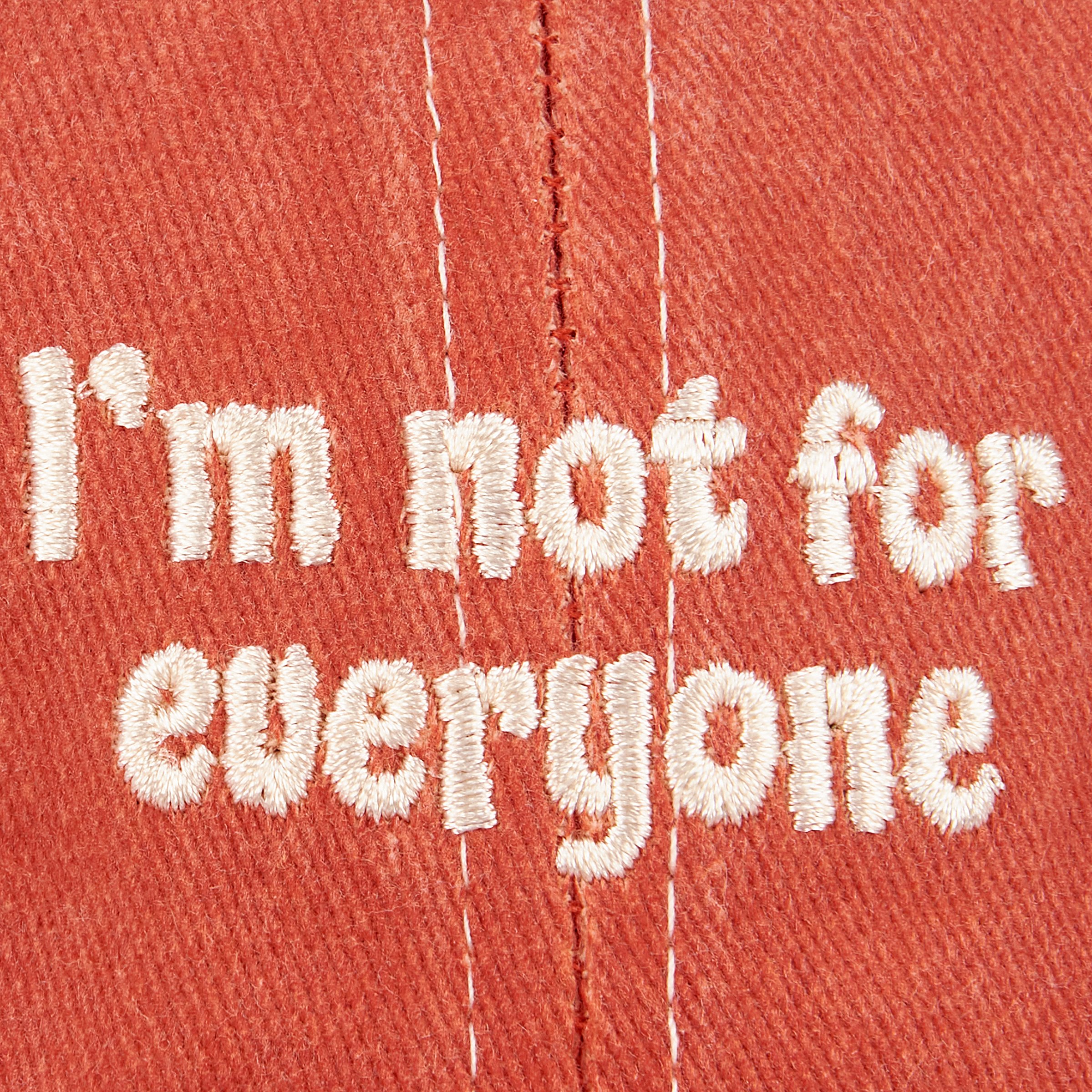 You've been warned. It's right on top, so it's the first thing you see. This vibrant baseball cap displays an honest sentiment that reads "I'm Not For Everyone" in a retro inspired style. Retro design is fully embroidered on stonewashed cotton for a naturally worn look. Questionables baseball caps are one size fits most with an adjustable buckle closure to create the perfect fit. Hand wash only. Our Not For Everyone baseball cap calls back to a retro style while also calling out a modern mentality making it perfect for everyday expression.