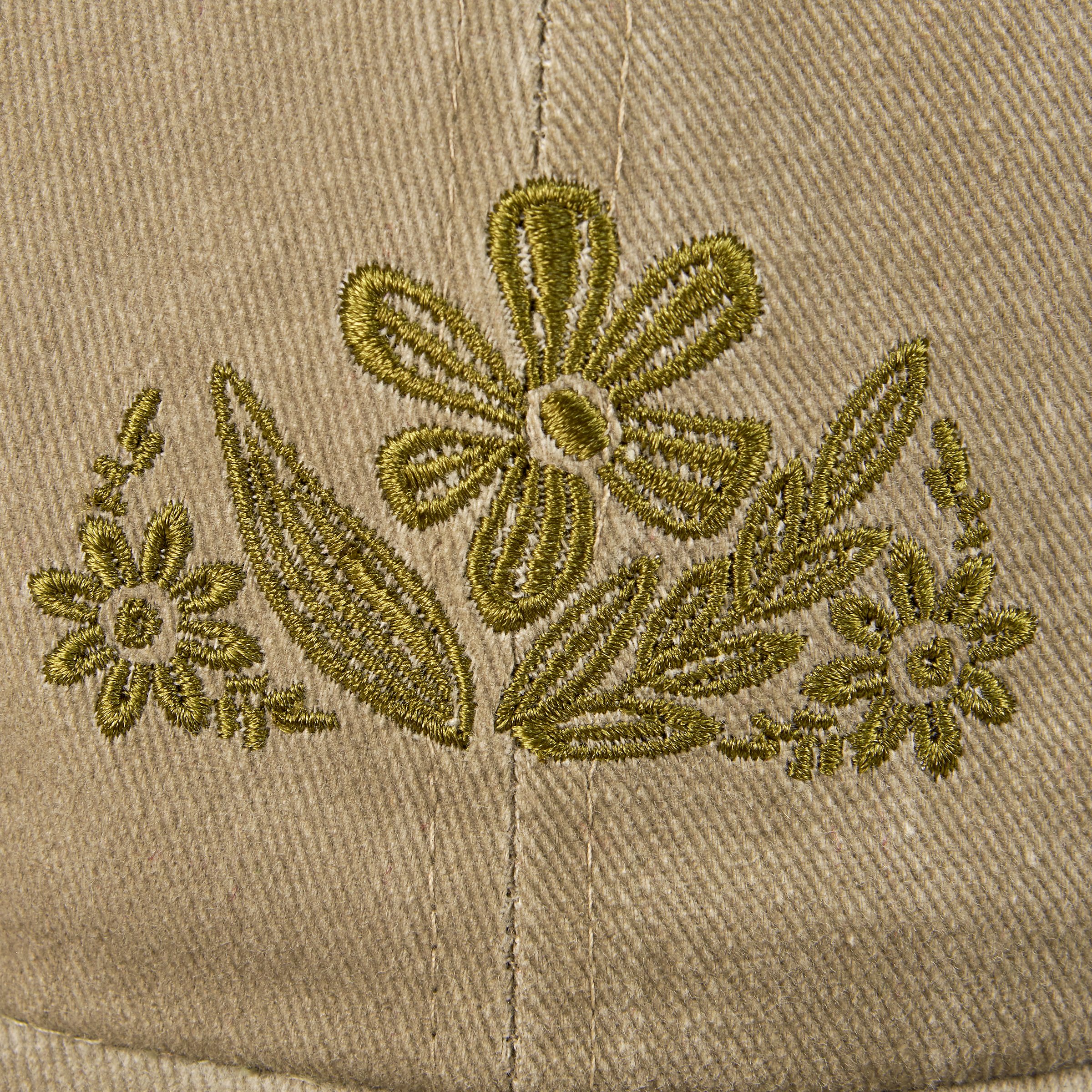 A tan baseball cap from our Folk Art Collection displaying a Scandinavian folk art inspired design of cosmos flowers in green color replicated from original hand illustrated art. Baseball cap features fully embroidered design for added detail. Our Peace Cosmos hat is one size fits most with an adjustable buckle closure to create the perfect fit. An inspirational accessory perfect for everyday wear. Hand wash only.
