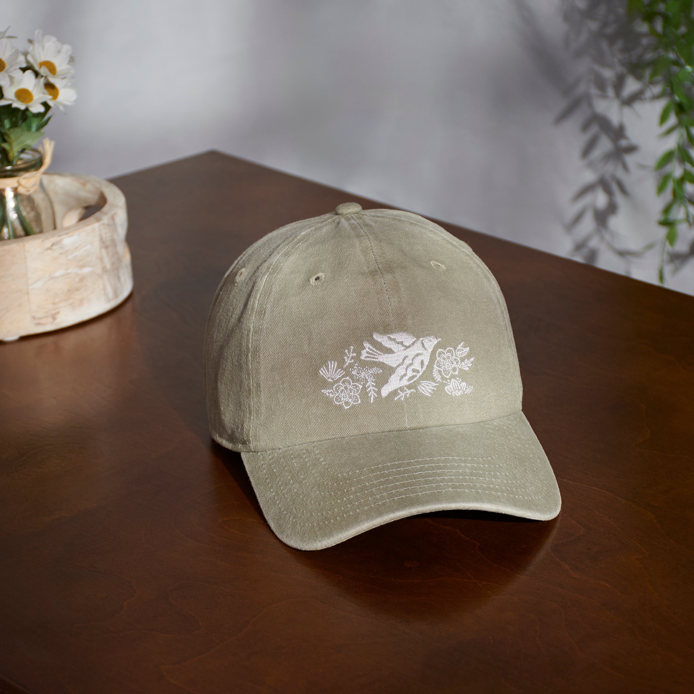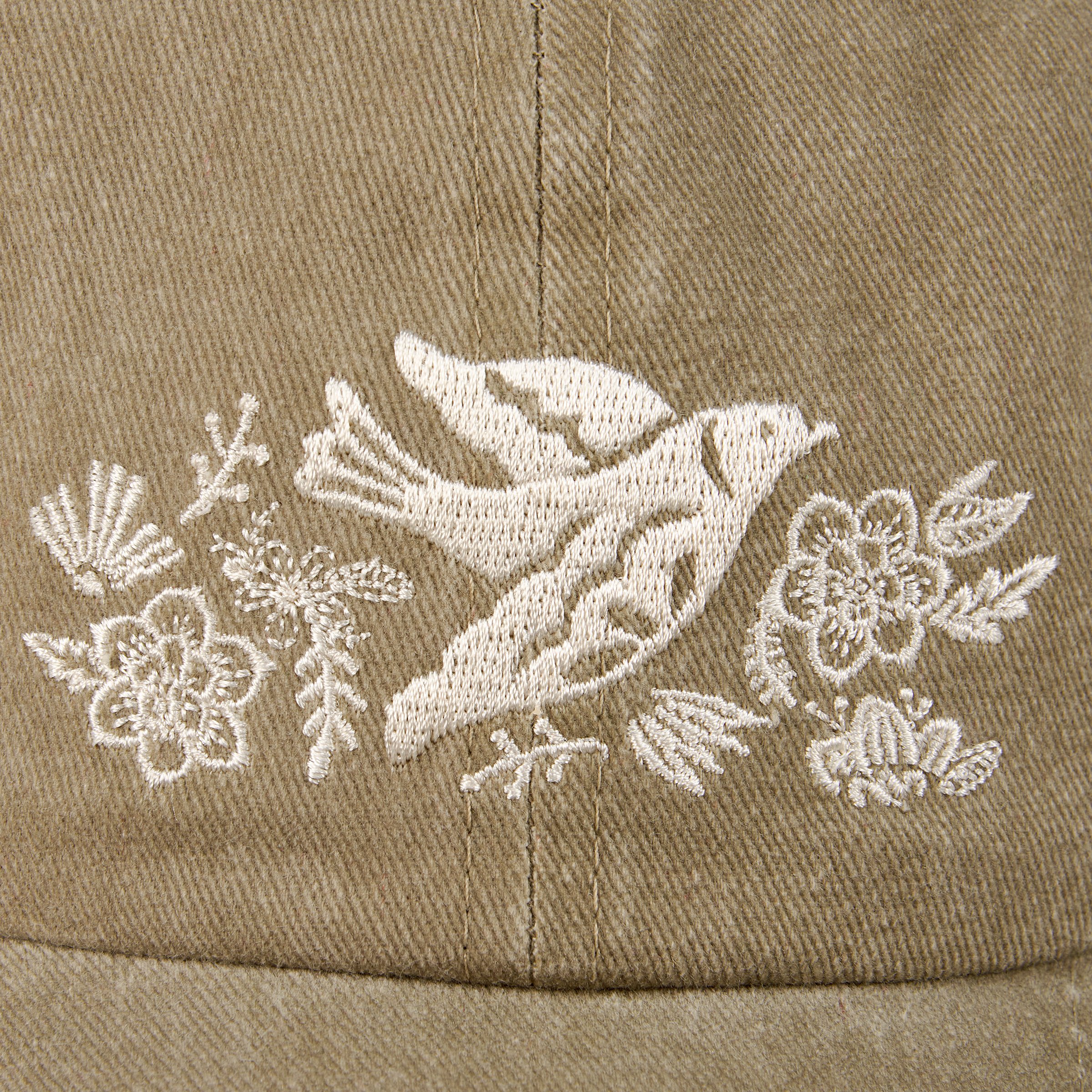 A tan baseball cap from our Folk Art Collection displaying a Scandinavian folk art inspired design of a peace dove and complementing florals in white color replicated from original hand illustrated art. Baseball cap features fully embroidered design for added detail. Our Peace Dove hat is one size fits most with an adjustable buckle closure to create the perfect fit. An inspirational accessory perfect for everyday wear. Hand wash only.
