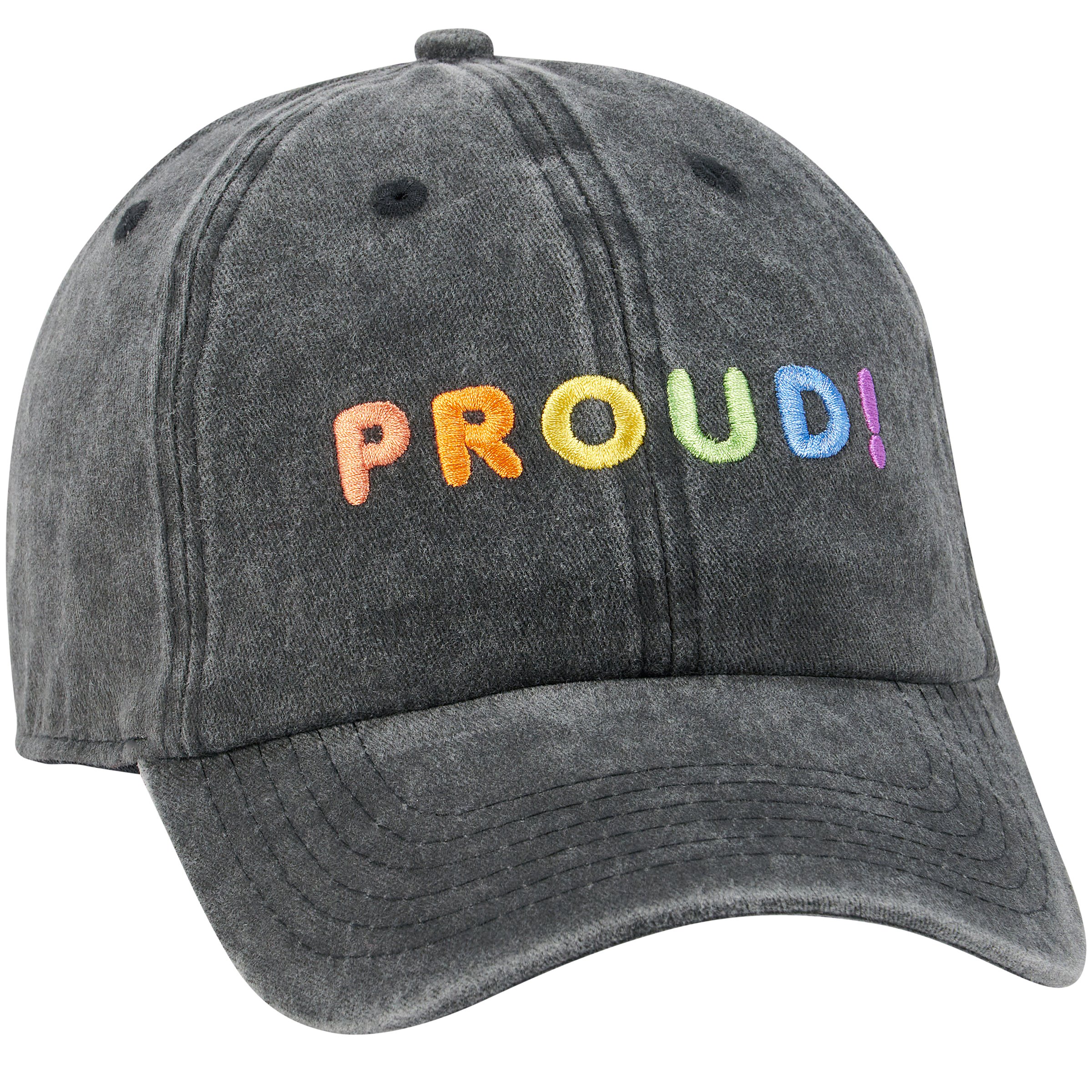 A black baseball cap from our Pride Collection displaying a bold "Proud!" sentiment in rainbow colors. Cap features embroidered sentiment for added detail. Our Proud baseball cap is one size fits most with an adjustable buckle closure to create the perfect fit. Hand wash only. Primitives by Kathy is donating a portion of the proceeds from the sale of this item to help make an impact in the lives of LGBTQ+ community members across Lancaster County. We have partnered with Lancaster LGBTQ+ Coalition and their commitment to building a supportive and enriching community abundant in opportunities for LGBTQQIA+ individuals and those with a stake in creating a more inclusive Lancaster County. For more information about this cause, please visit https://www.lgbtlancaster.org.