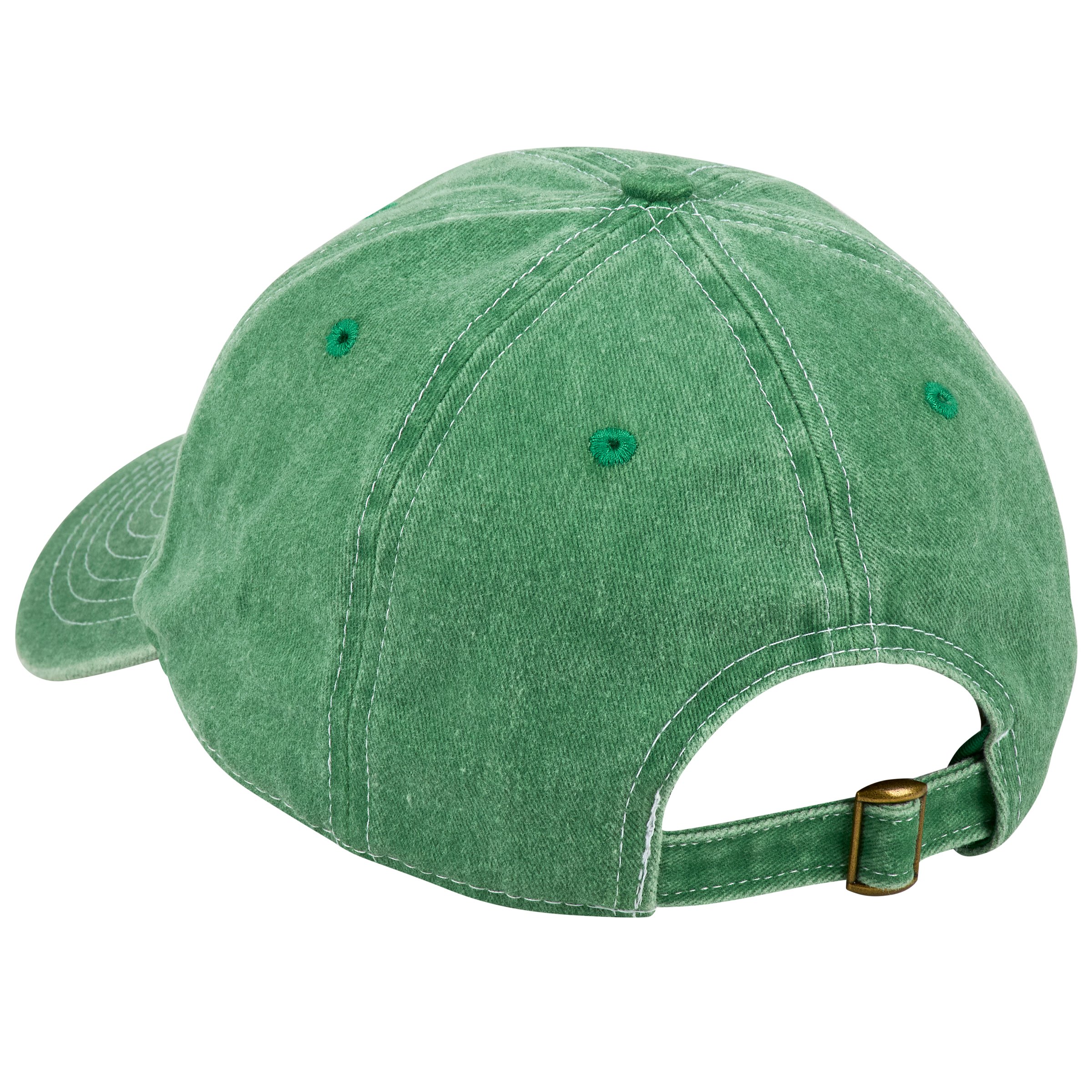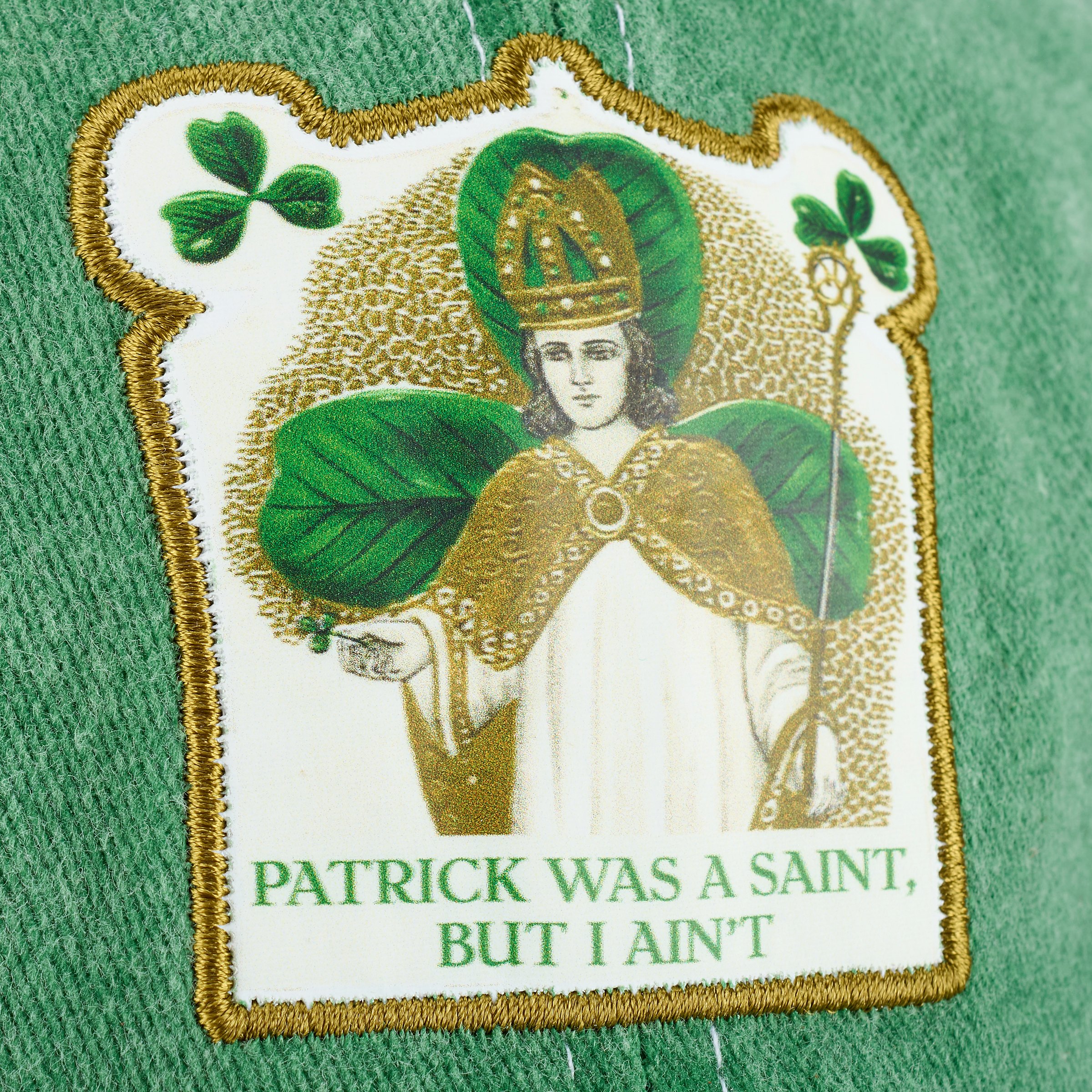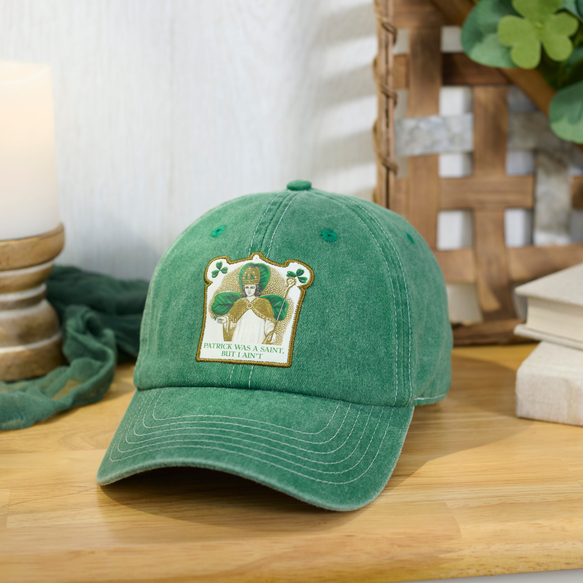 A stonewashed cotton baseball cap from our St. Patrick's Day Collection featuring a shamrock green color with an embroidered patch displaying vintage art of a saint and shamrocks above a funny seasonal sentiment that reads "Patrick Was A Saint, But I Ain't." Funny St. Patrick's Day hat also features metallic gold thread on the embroidered patch for added detail. Our Saint Patrick baseball cap is one size fits most with an adjustable metal buckle to create the perfect fit. Hand wash only. A fun St. Patrick's Day accessory perfect for seasonal style.