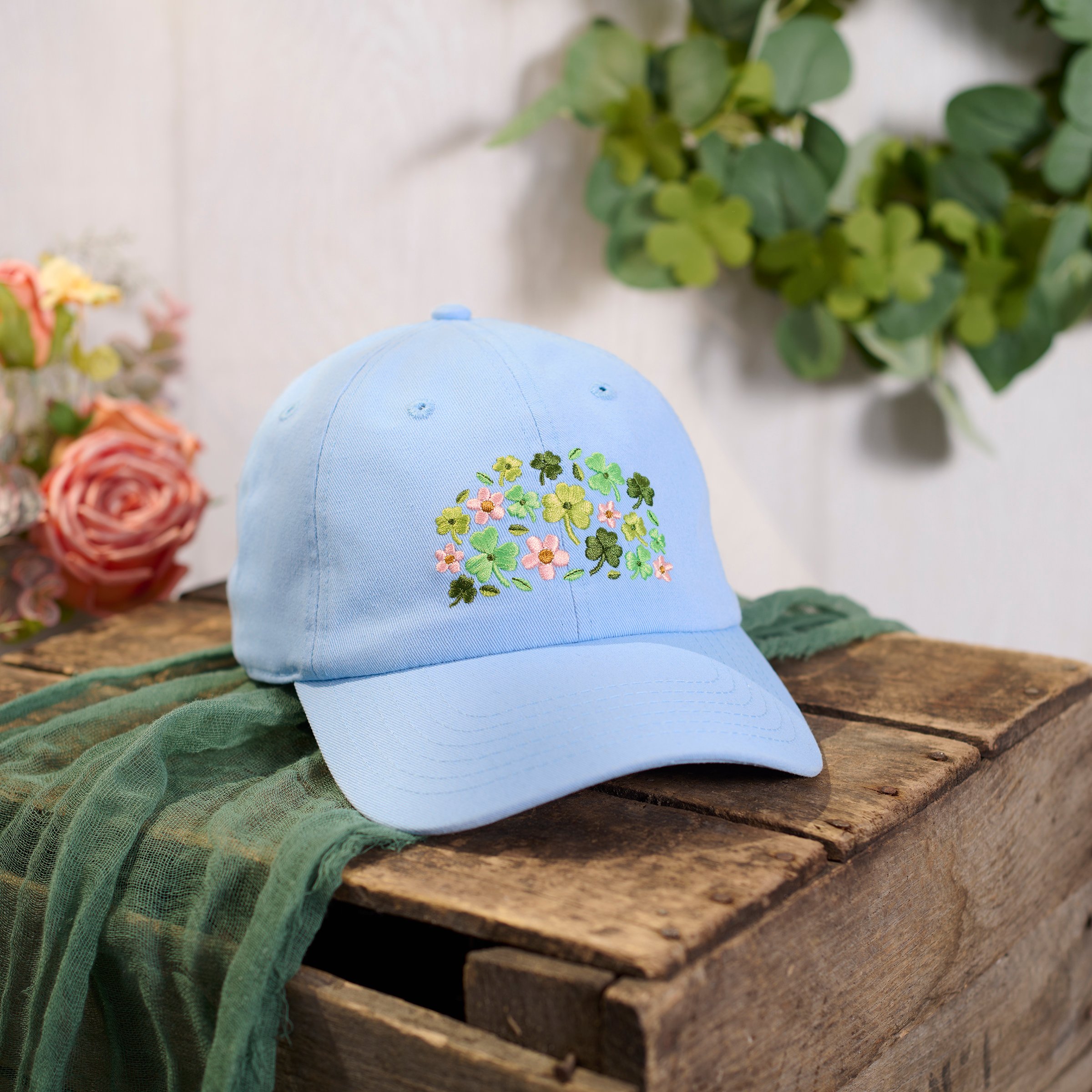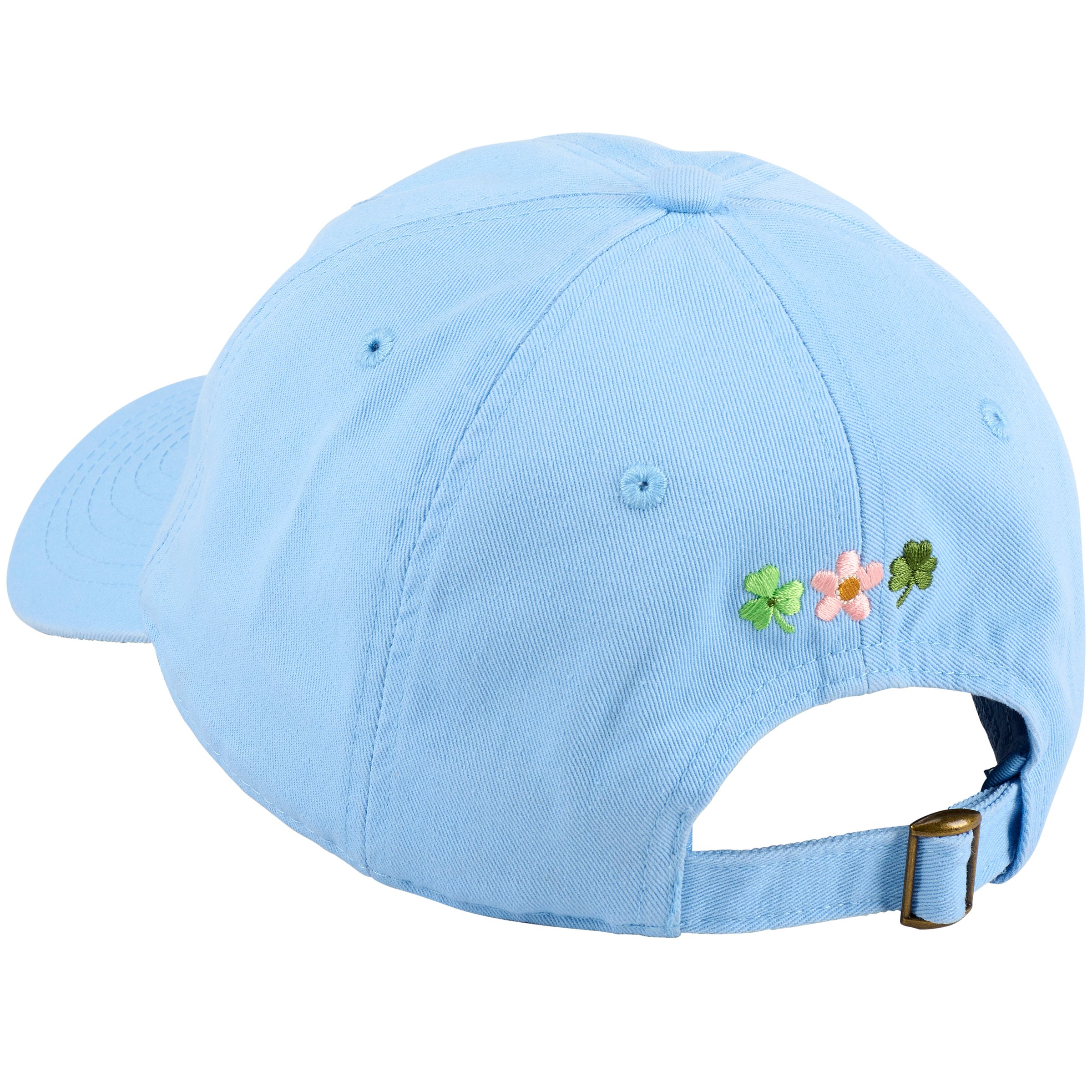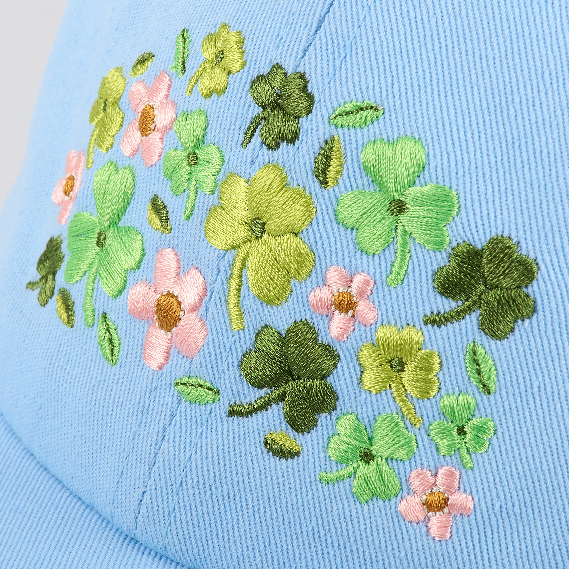 A light blue baseball cap from our St. Patrick's Day Collection displaying embroidered designs of shamrocks and flowers on the front with a coordinating shamrocks and flower design on the back. Embroidered shamrock and flower designs are replicated from original hand illustrated art. Our Shamrocks baseball cap is one size fits most with an adjustable metal buckle to create the perfect fit. Hand wash only. A lovely shamrock themed accessory perfect for seasonal style.