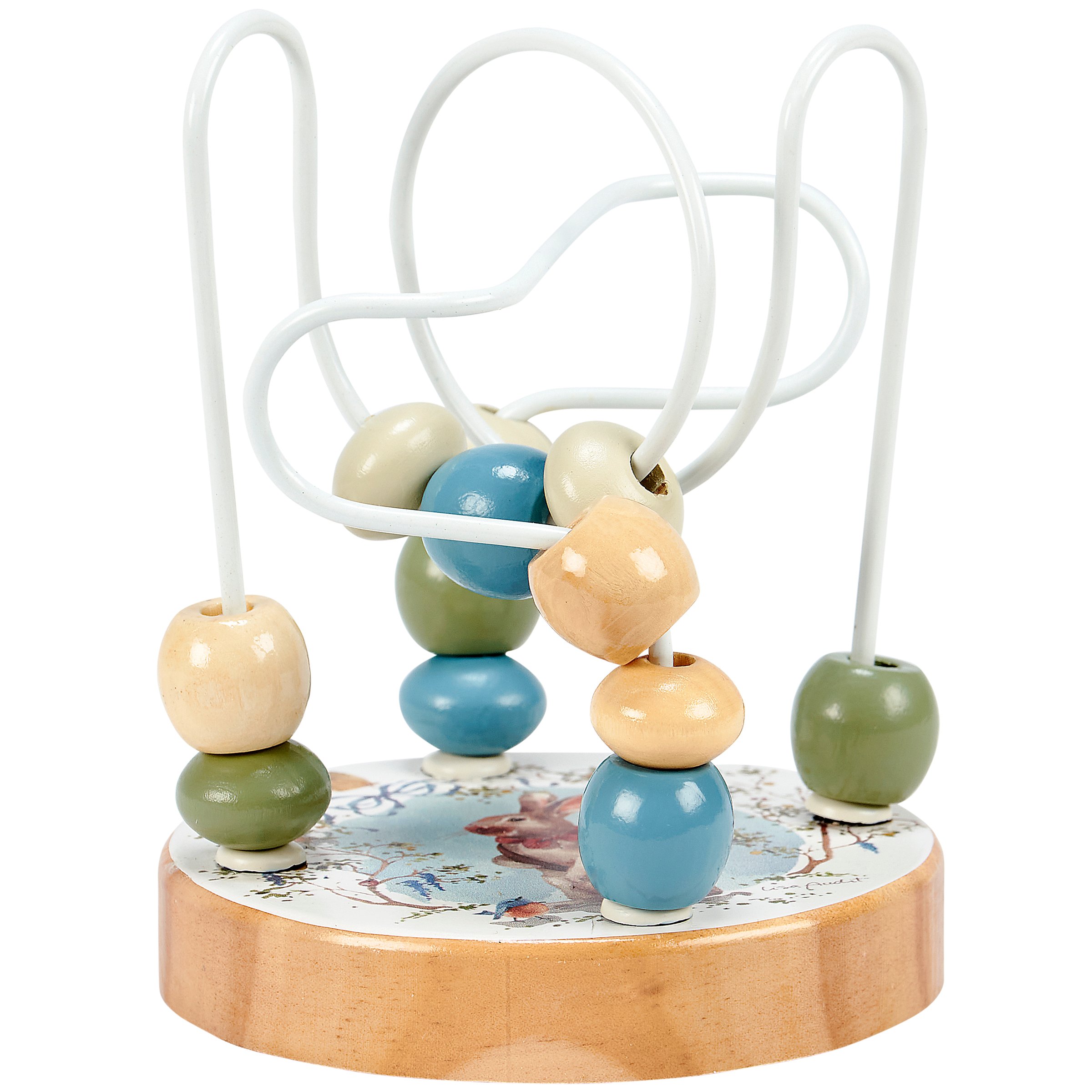 A fun bead maze toy from our Baby & Kids Collection displaying a cute storybook inspired design. Bead maze features two metal tracks with various colored wooden beads connected to a decorative wooden base displaying art of a rabbit carrying a bag of carrots. Garden rabbit design is replicated from original art hand painted in a delicate watercolor style. Our Rabbit bead maze is perfect for play with children 18 months or older and looks nice on the shelf as child's room décor when not in use. Cute baby toy comes packaged in cardboard box with product information and acrylic windows to view bead maze. A fun garden-themed gift for baby showers or everyday moments.
