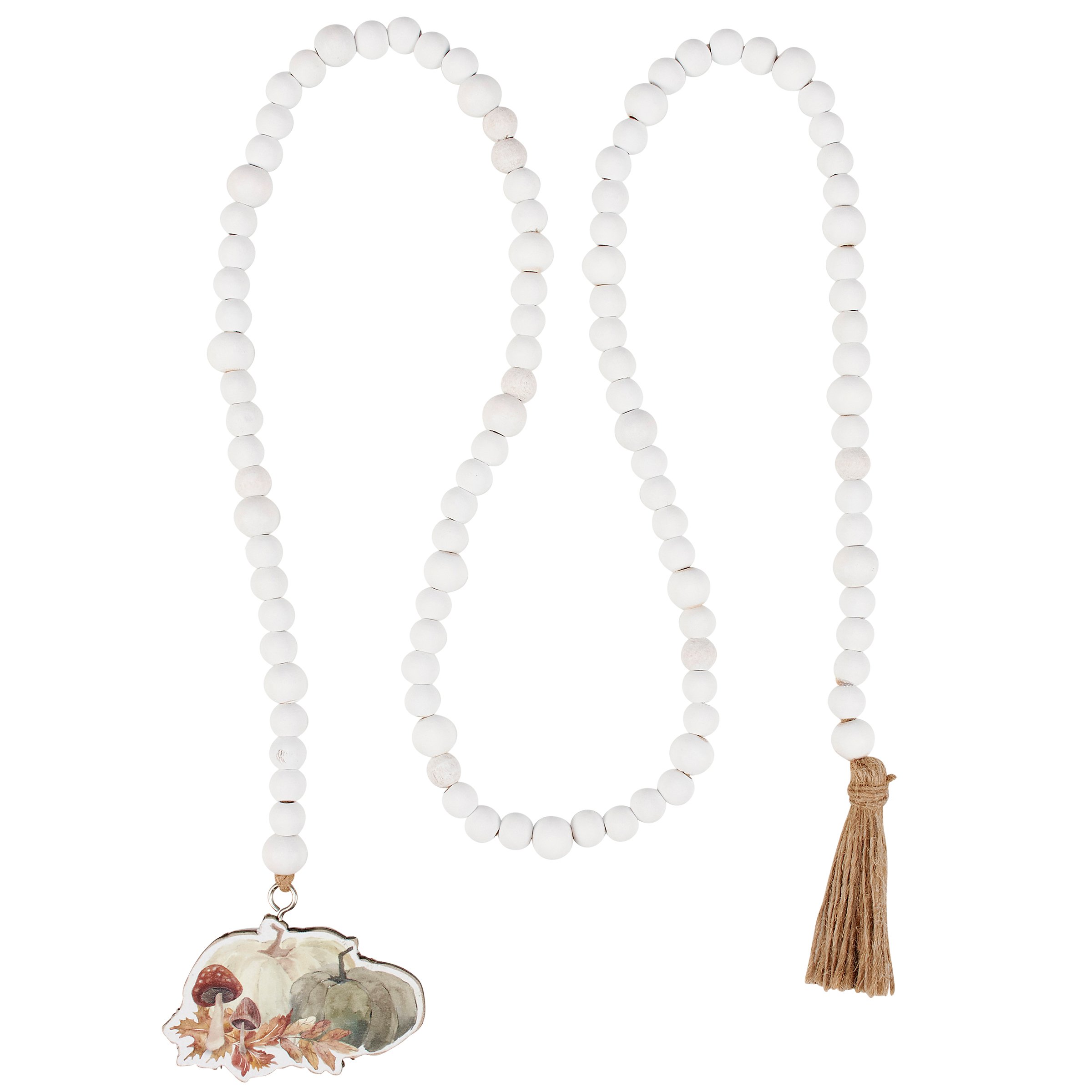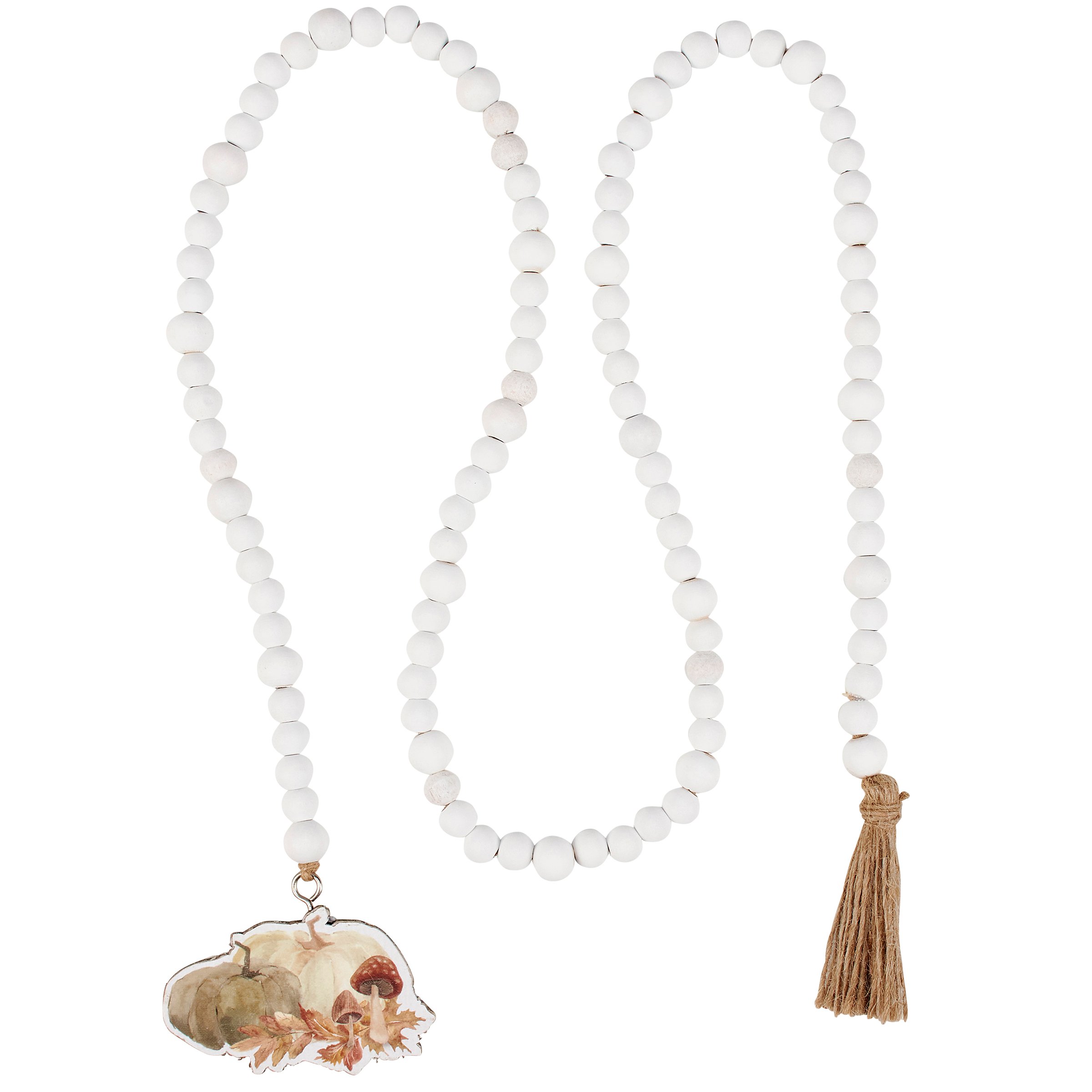 A decorative garland from our Fall & Harvest Collection featuring cream colored wooden beads along a jute rope with a jute tassel at one end and a double-sided medallion at the other end. Medallion displays a hand painted design of pumpkins with mushrooms and autumn leaves in a watercolor style. Our Fall Pumpkins beaded garland includes 42 inches of length for plenty of coverage that can be laid on a surface for display. A rustic seasonal home accent with a variety of display options.