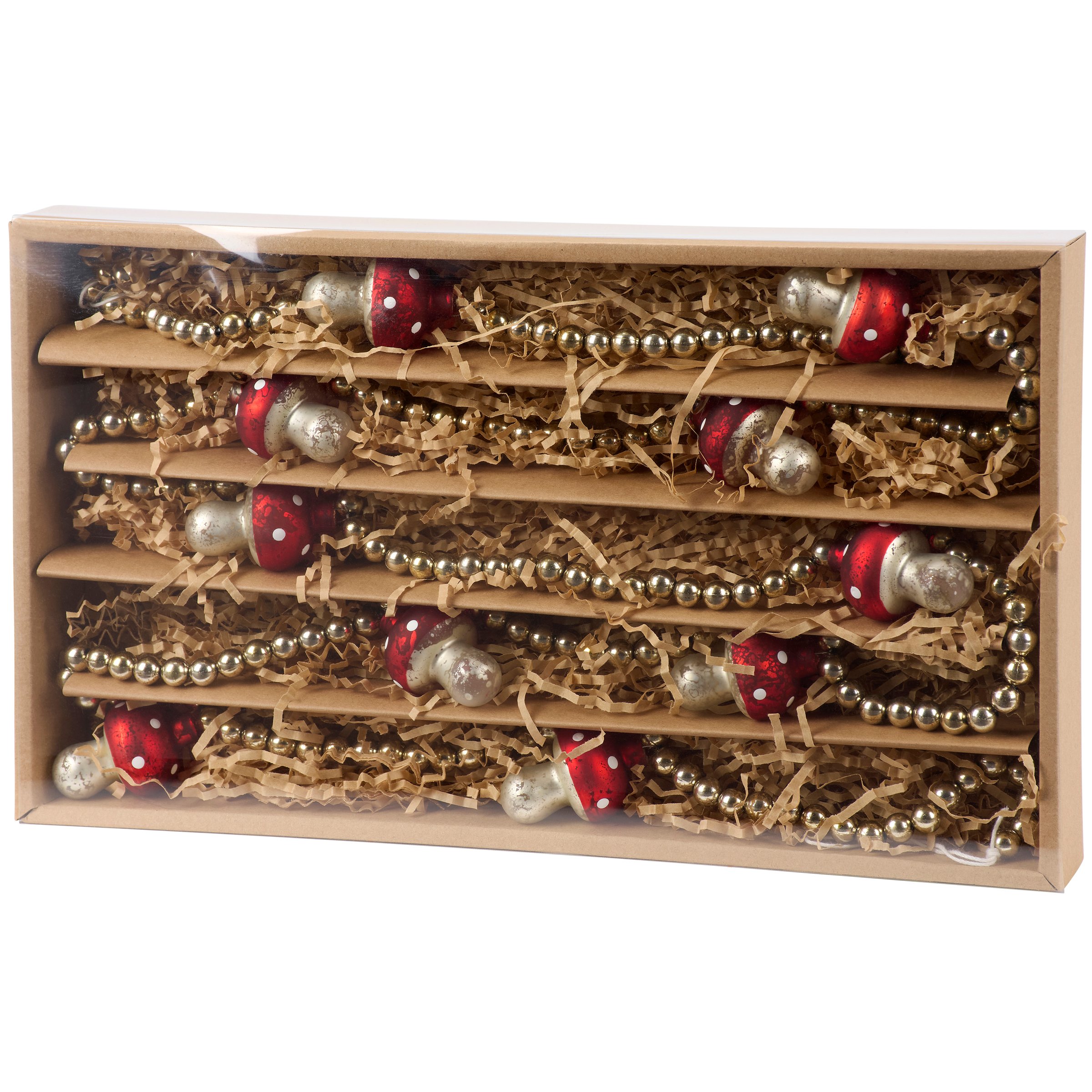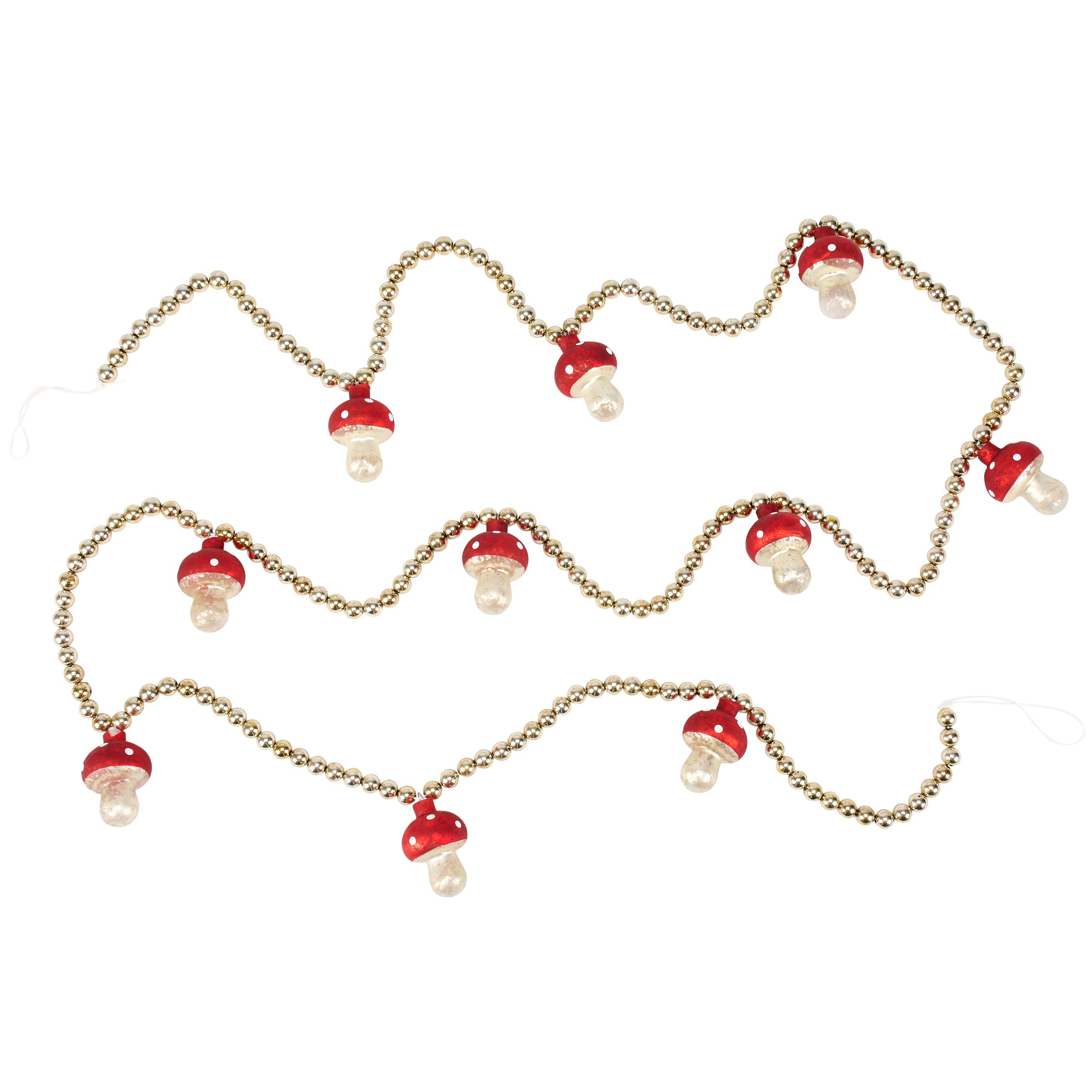 A decorative garland from our Cottagecore Collection displaying a charming mushroom inspired design made with silver beads and small mushroom glass ornaments. Mushroom garland features distressed details on the ornaments and beads for added interest. Our Mushroom beaded garland includes 72 inches of length for plenty of coverage and is easy to hang for display via loops at each end. This cottagecore garland comes packaged neatly displayed in a cardboard box filled out with decorative paper stuffing and finished with an acrylic lid to easily view design. A nature themed home accent with a variety of everyday display options.