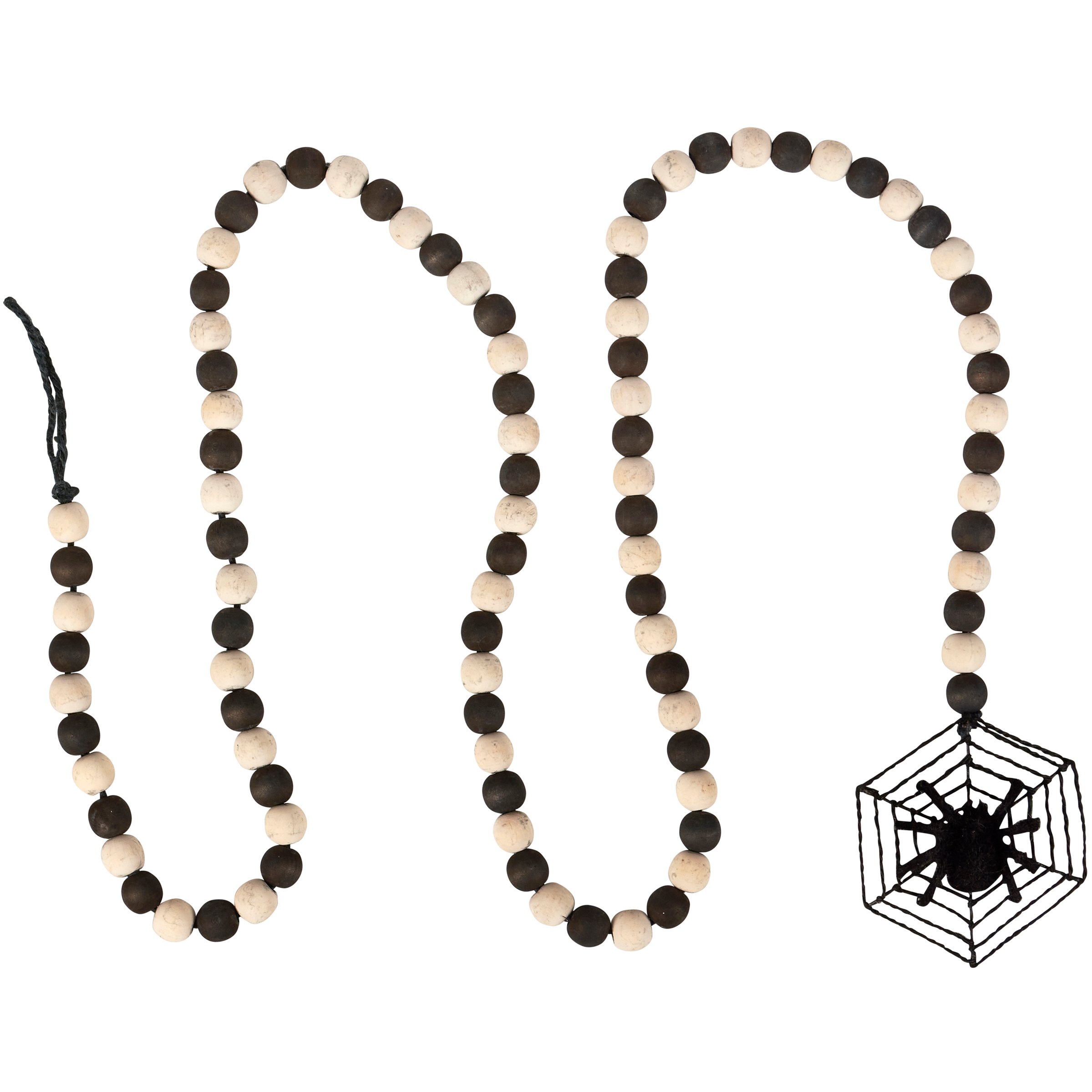 A decorative garland from our Halloween Collection featuring black and white wooden beads along a jute rope with a spider on a web medallion at the end. Our Web beaded garland includes 72 inches of length for plenty of coverage that can be laid on a surface for display or hung via attached end loop. A rustic seasonal home accent with a variety of display options.