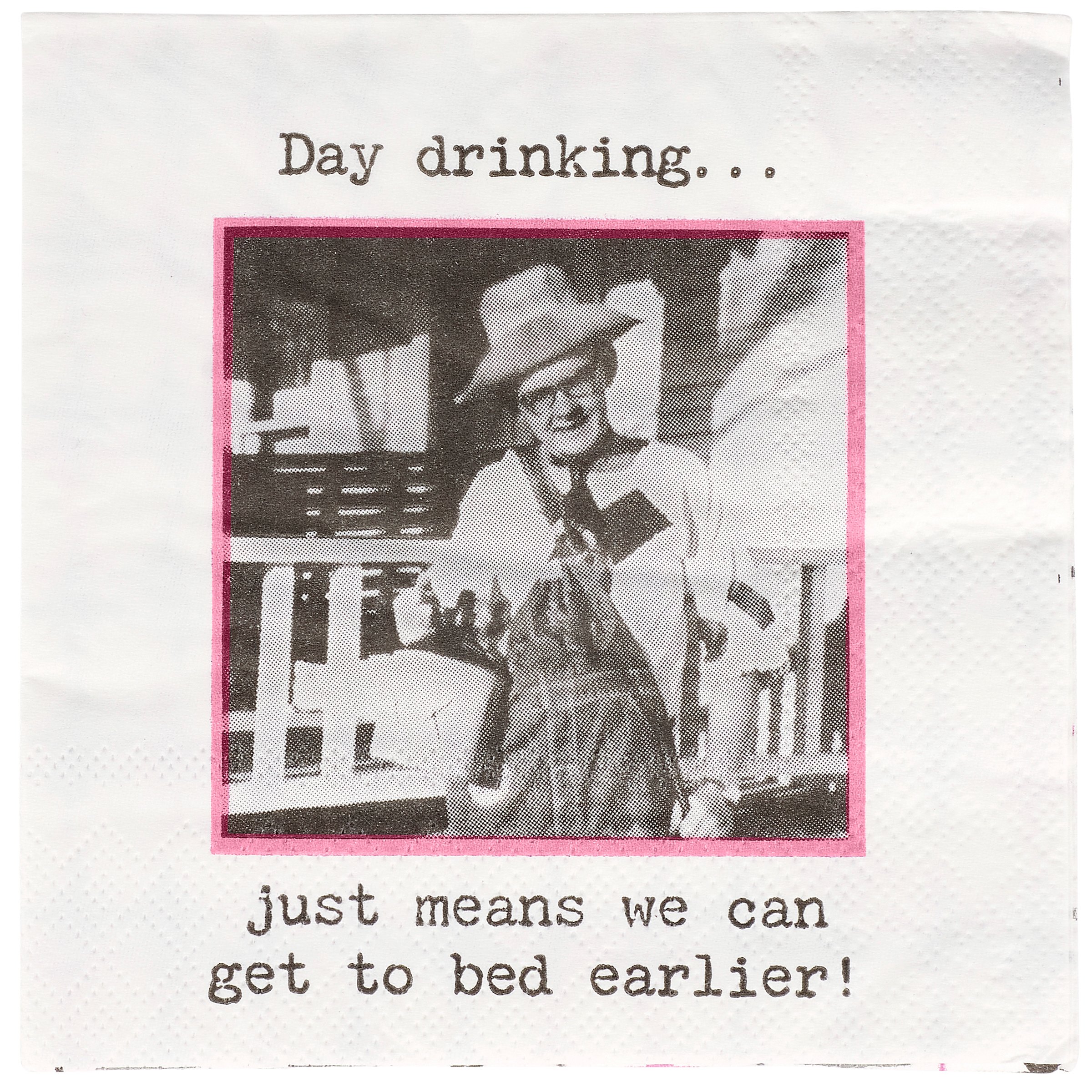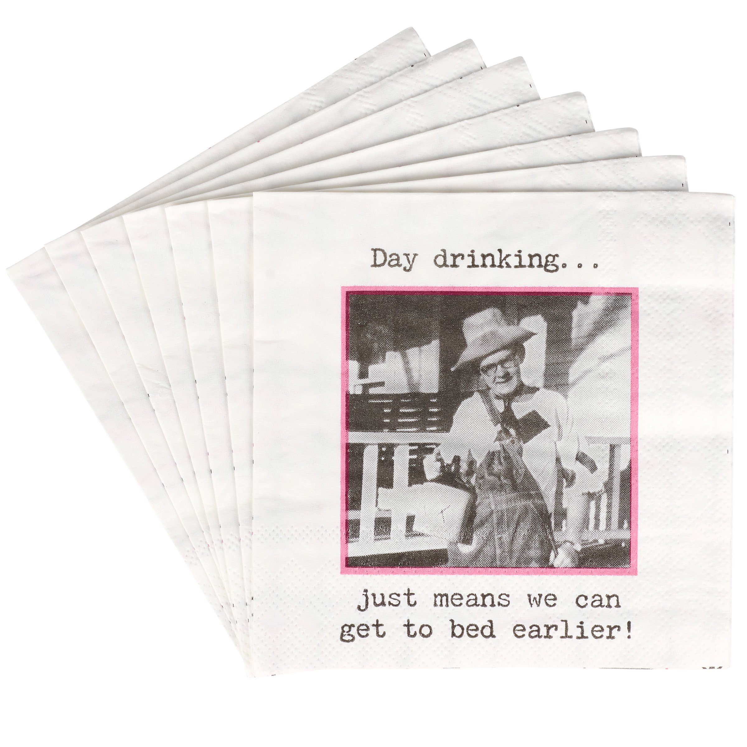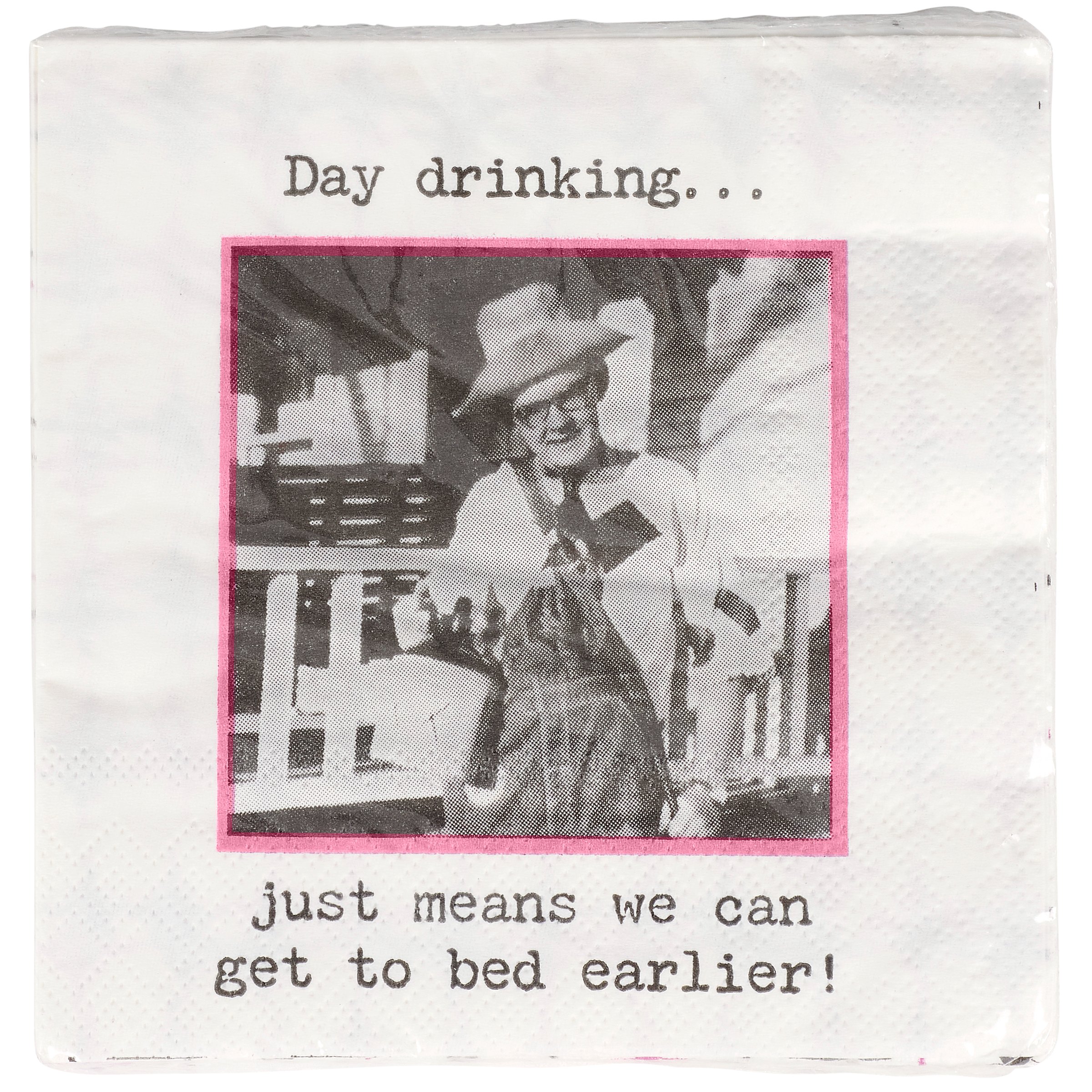 Perfect for entertaining guests and making clean-up a breeze, this disposable beverage napkin from our Trash Talk By Annie Collection displays a vintage black and white photograph complemented with a sassy alcohol themed sentiment that reads "Day Drinking... Just Means We Can Get To Bed Earlier." Beverage napkin also features a coordinating retro pattern on the back when flipped as well as the rest of the napkin when unfolded. Our Day Drinking beverage napkin measures 5" by 5" and comes shrink-wrapped in a set of 20 napkins. A fun retro bar accessory perfect for everyday gatherings.