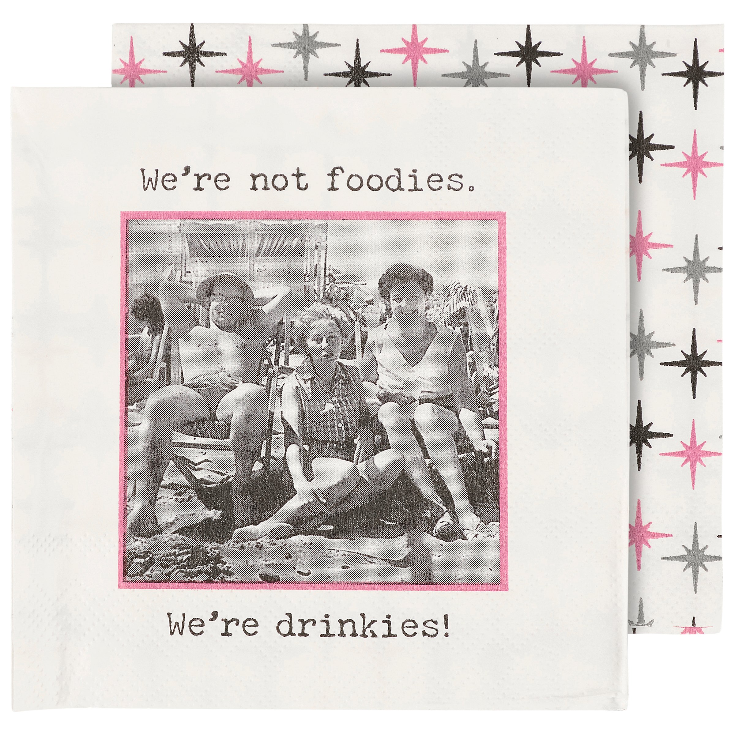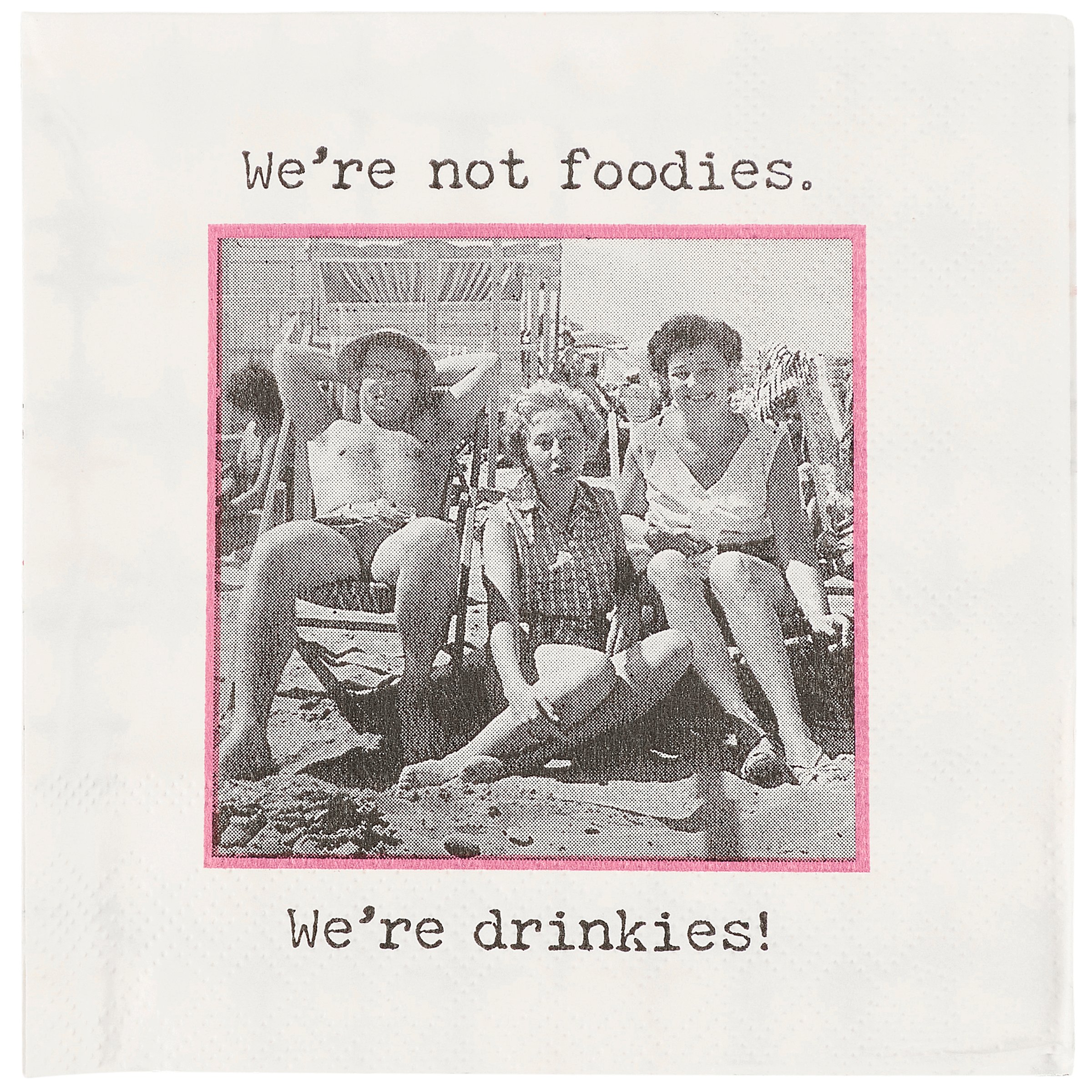 Perfect for entertaining guests and making clean-up a breeze, this disposable beverage napkin from our Trash Talk By Annie Collection displays a vintage black and white photograph complemented with a humorous sentiment that reads "We're Not Foodies. We're Drinkies!" Beverage napkin also features a coordinating retro pattern on the back when flipped as well as the rest of the napkin when unfolded. Our Drinkies beverage napkin measures 5" by 5" and comes shrink-wrapped in a set of 20 napkins. A fun retro bar accessory perfect for everyday use.